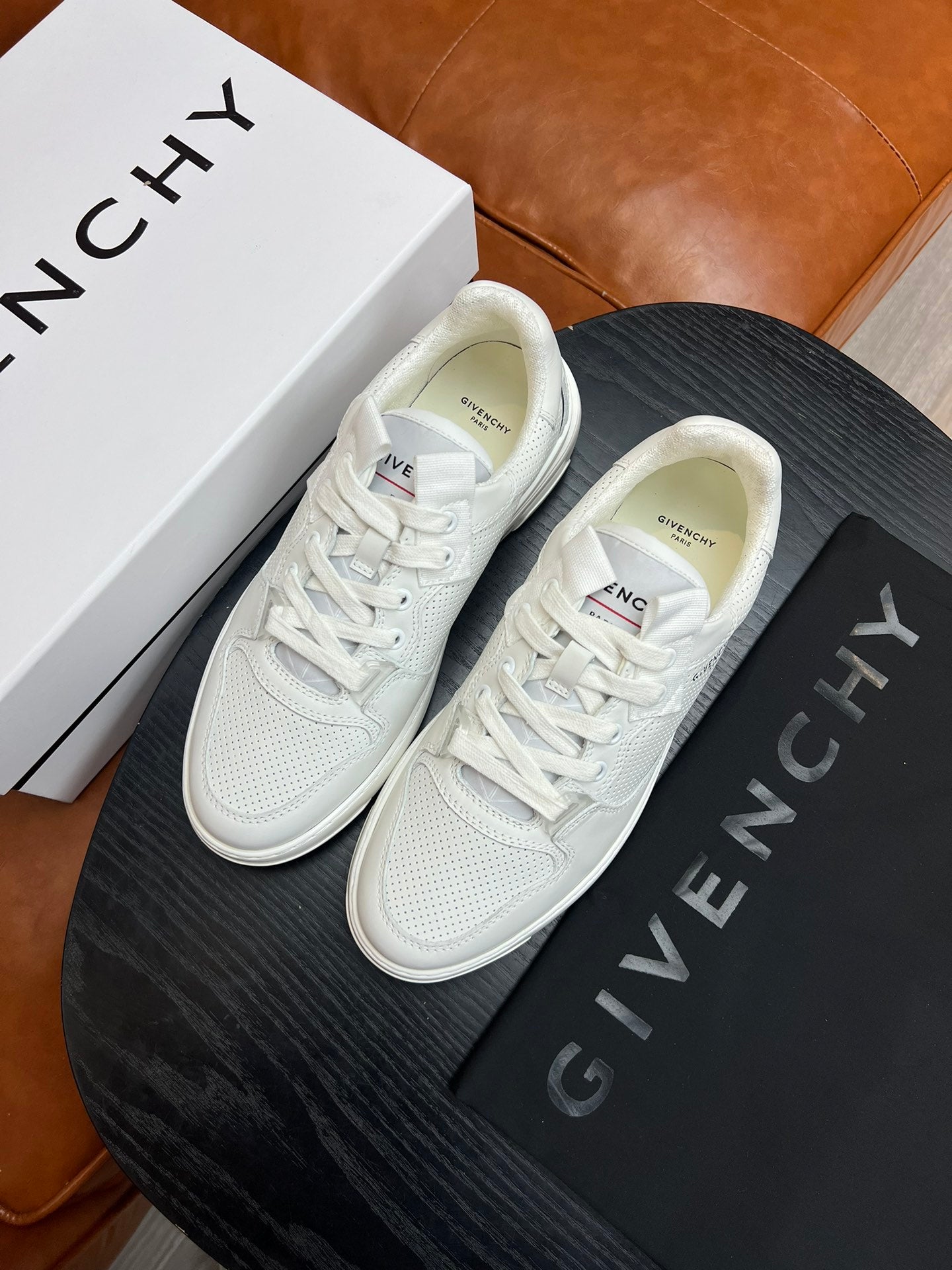 The signature GIVENCHY PARIS logo adorns the side, and the laces come with chic canvas straps in a matching hue. The tongue proudly displays a stylish white and red GIVENCHY PARIS logo, adding a touch of sophistication.