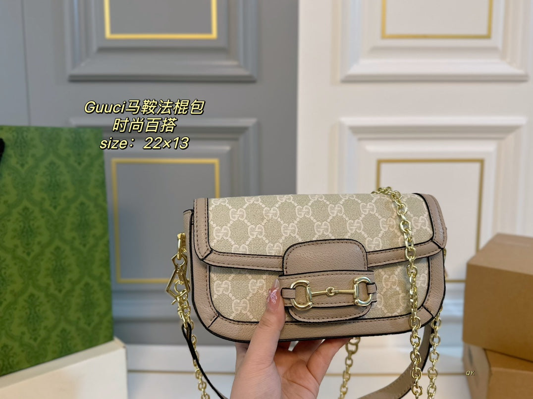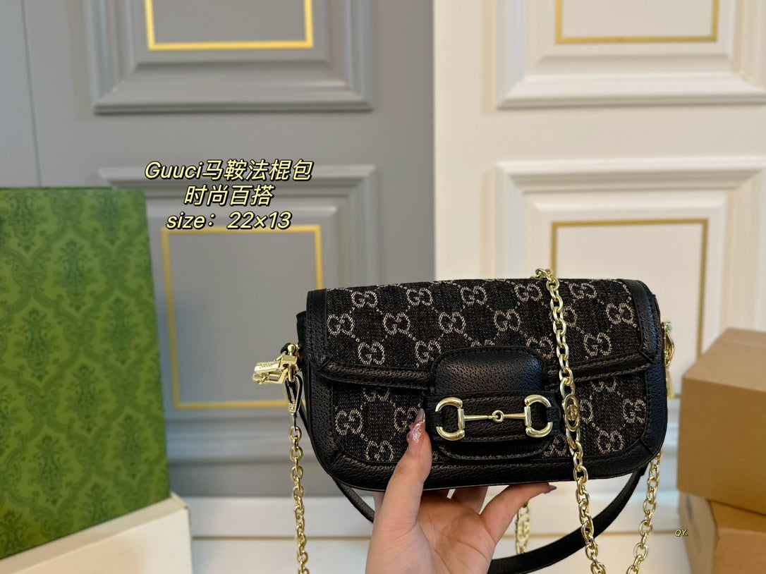 Introducing the Gucci 1955 Saddle Baguette, an elegant blend of classic design and modern sophistication. Measuring 22×13 cm, this striking bag features iconic saddle bag elements along with fashionable metal chain accents for both armpit and cross-body wear. The double shoulder straps add a bold touch, making it the perfect accessory for any occasion. Elevate your style with this must-have piece that stands as the epitome of luxury and versatility. Experience the essence of Gucci – your ultimate fashion statement awaits.