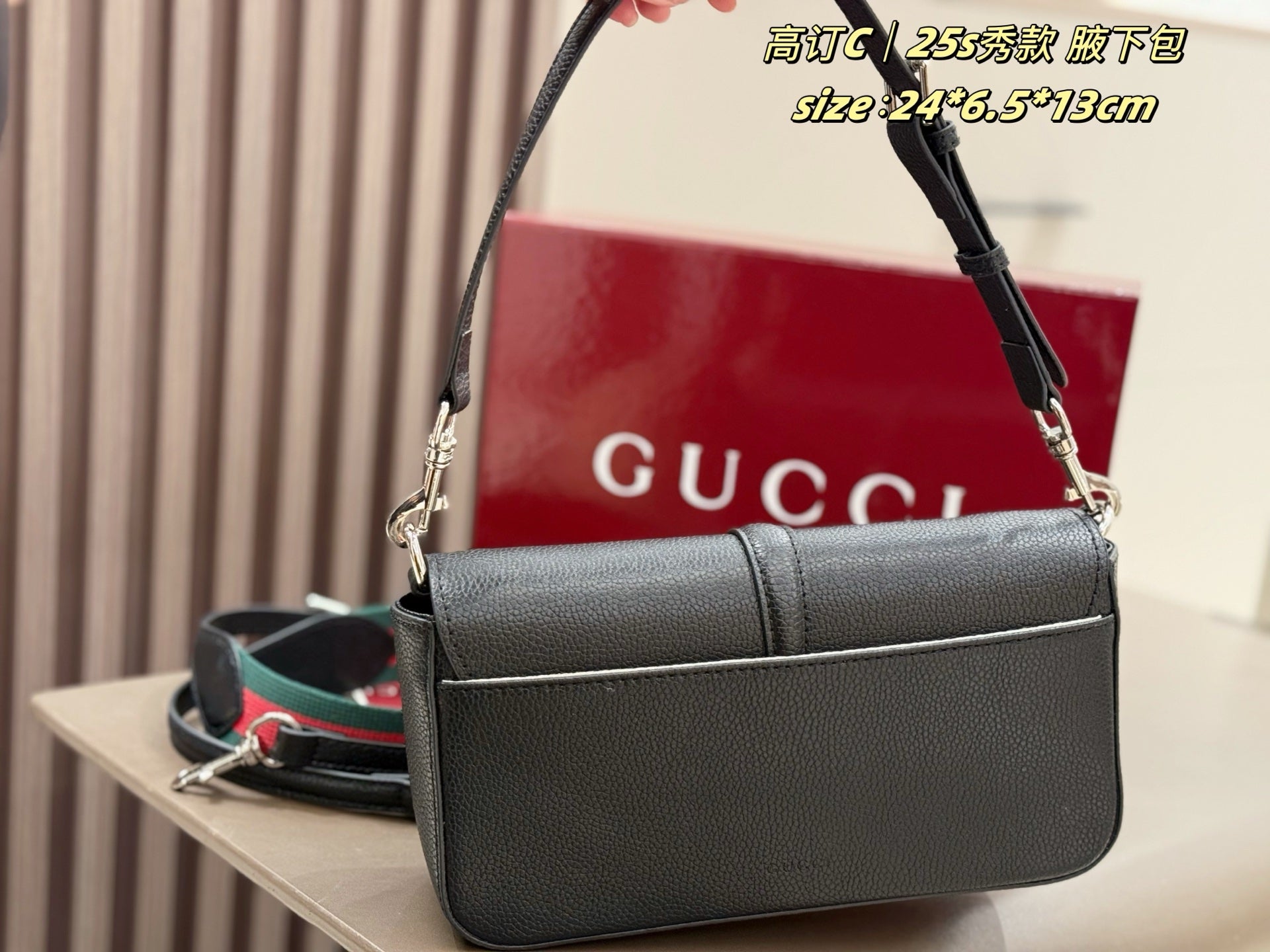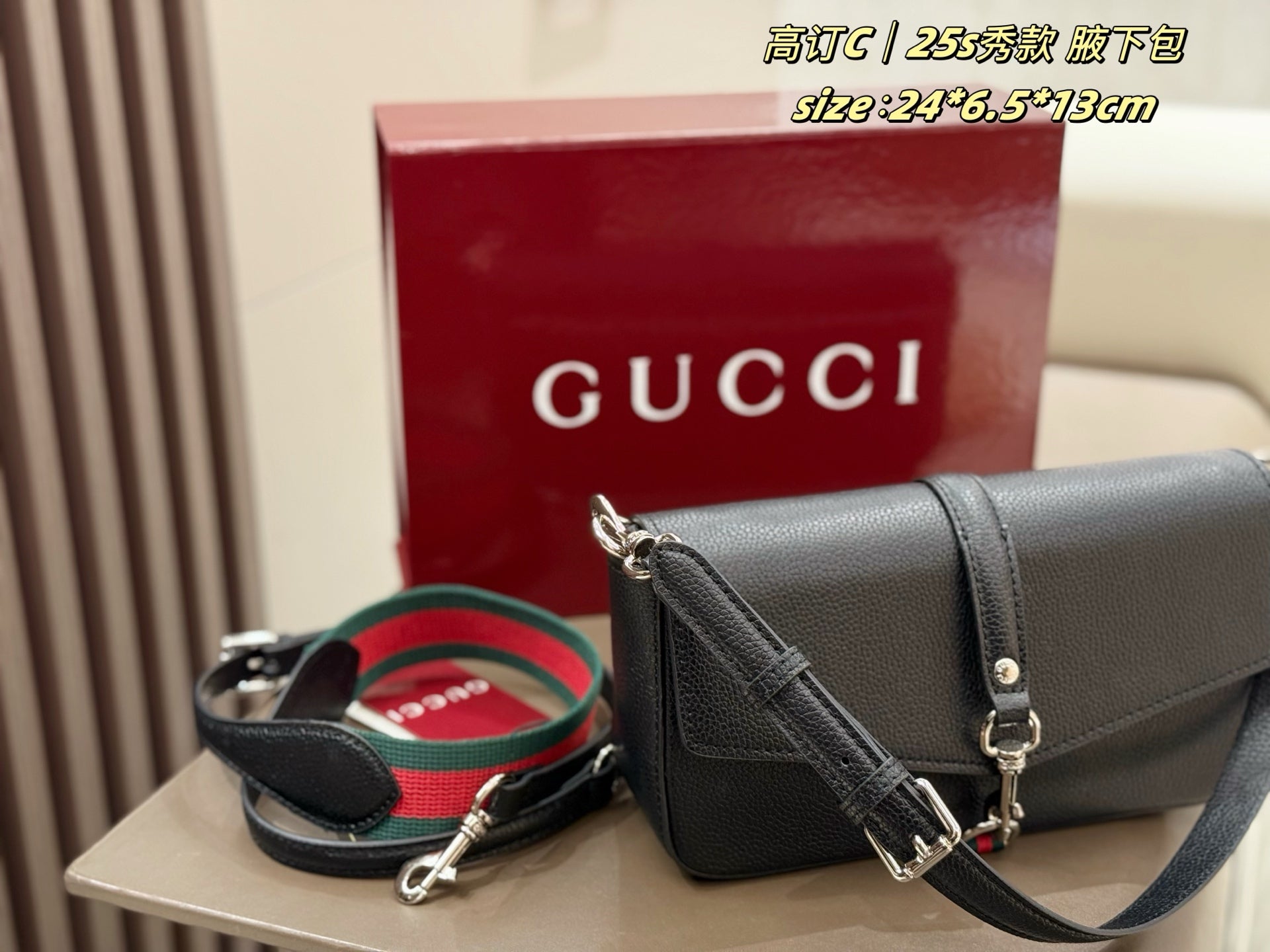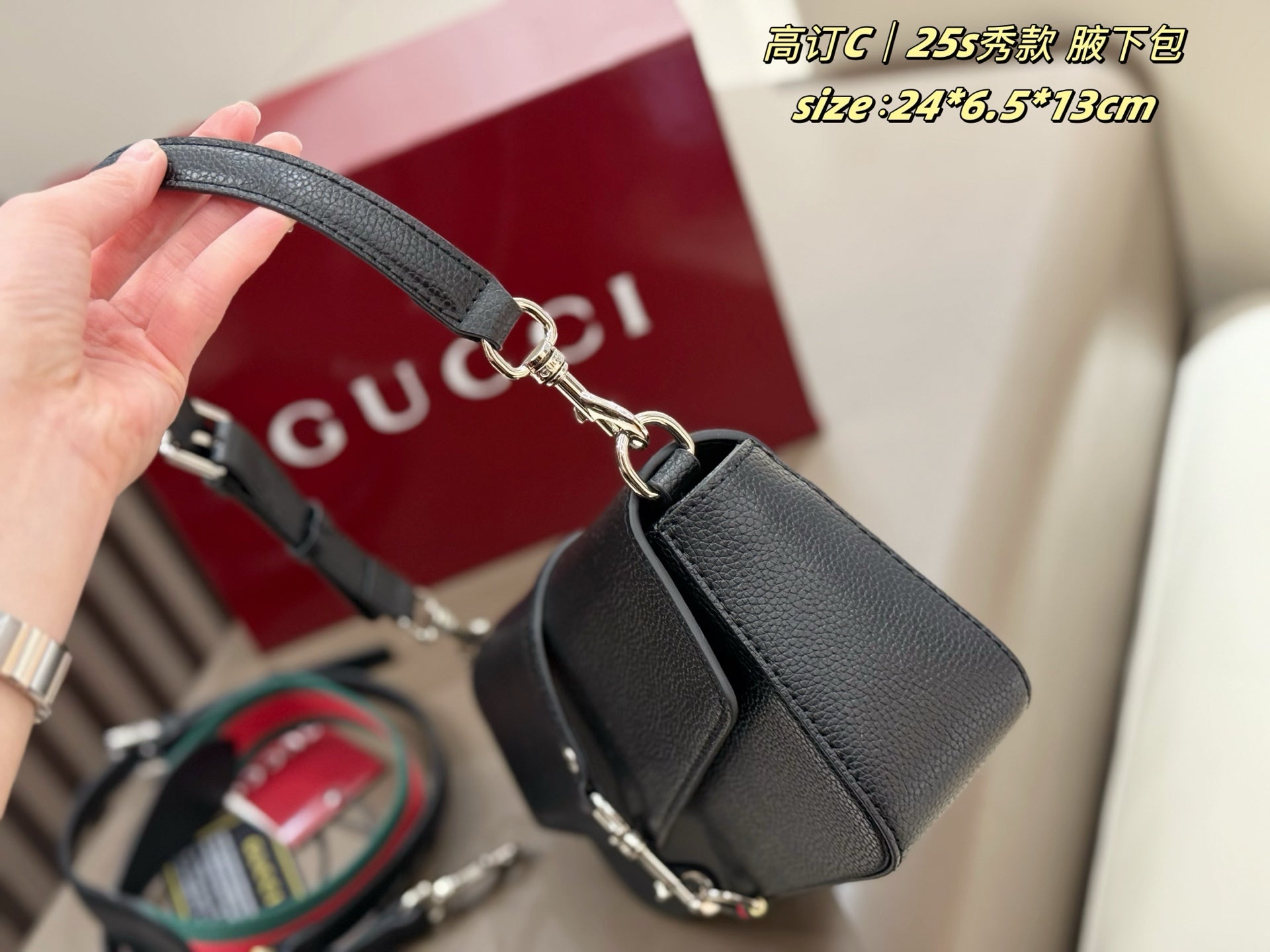 The box-shaped design features detachable components, seamlessly blending retro charm with modern versatility. The cylindrical silhouette offers multiple carrying options: as a clutch, handbag, or shoulder bag. Adorned with the iconic GUCCI logo, the lacquered finish adds an elegant touch.