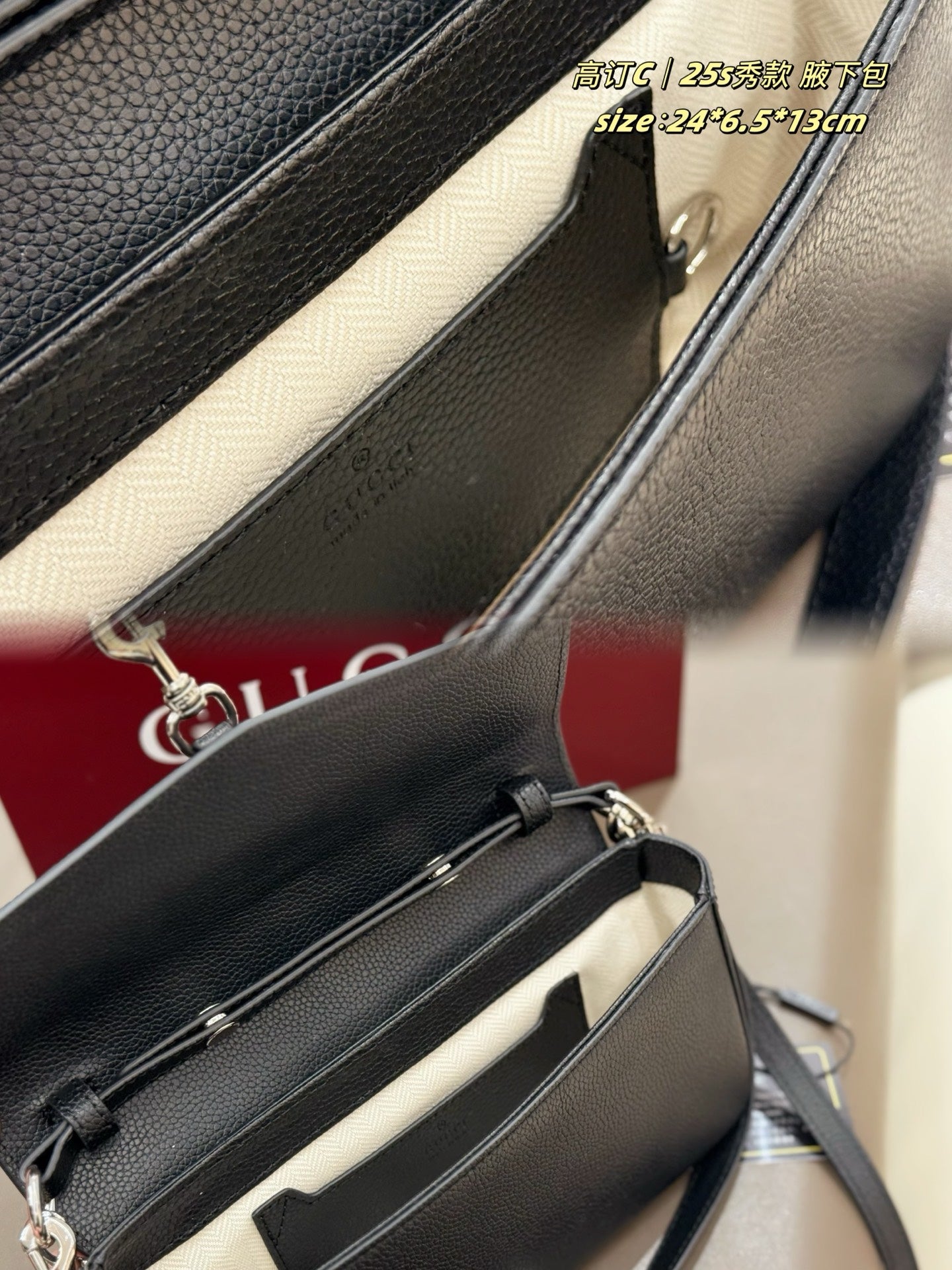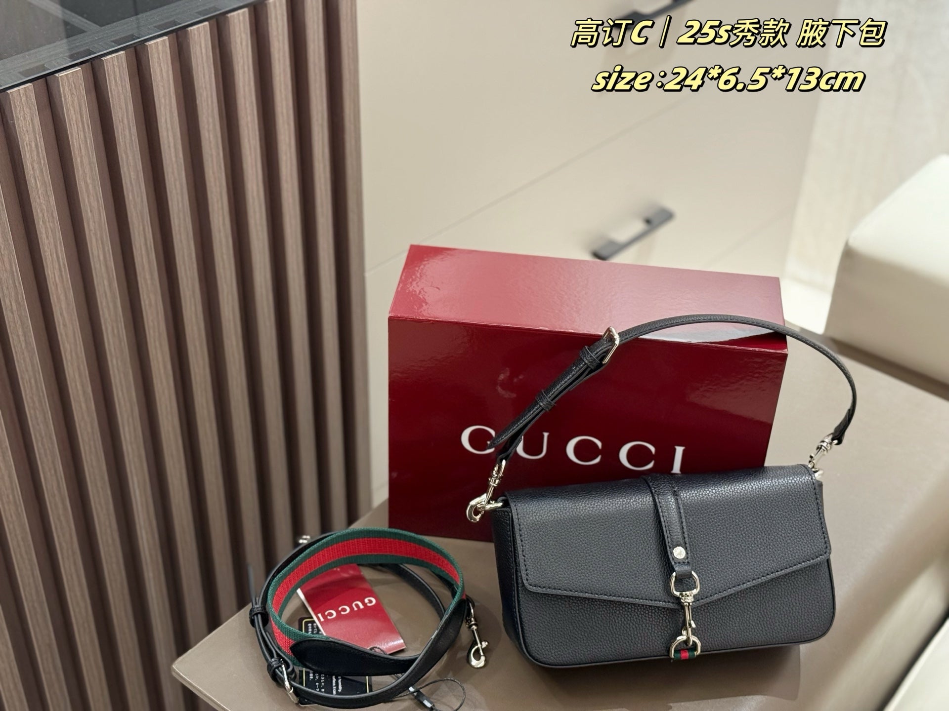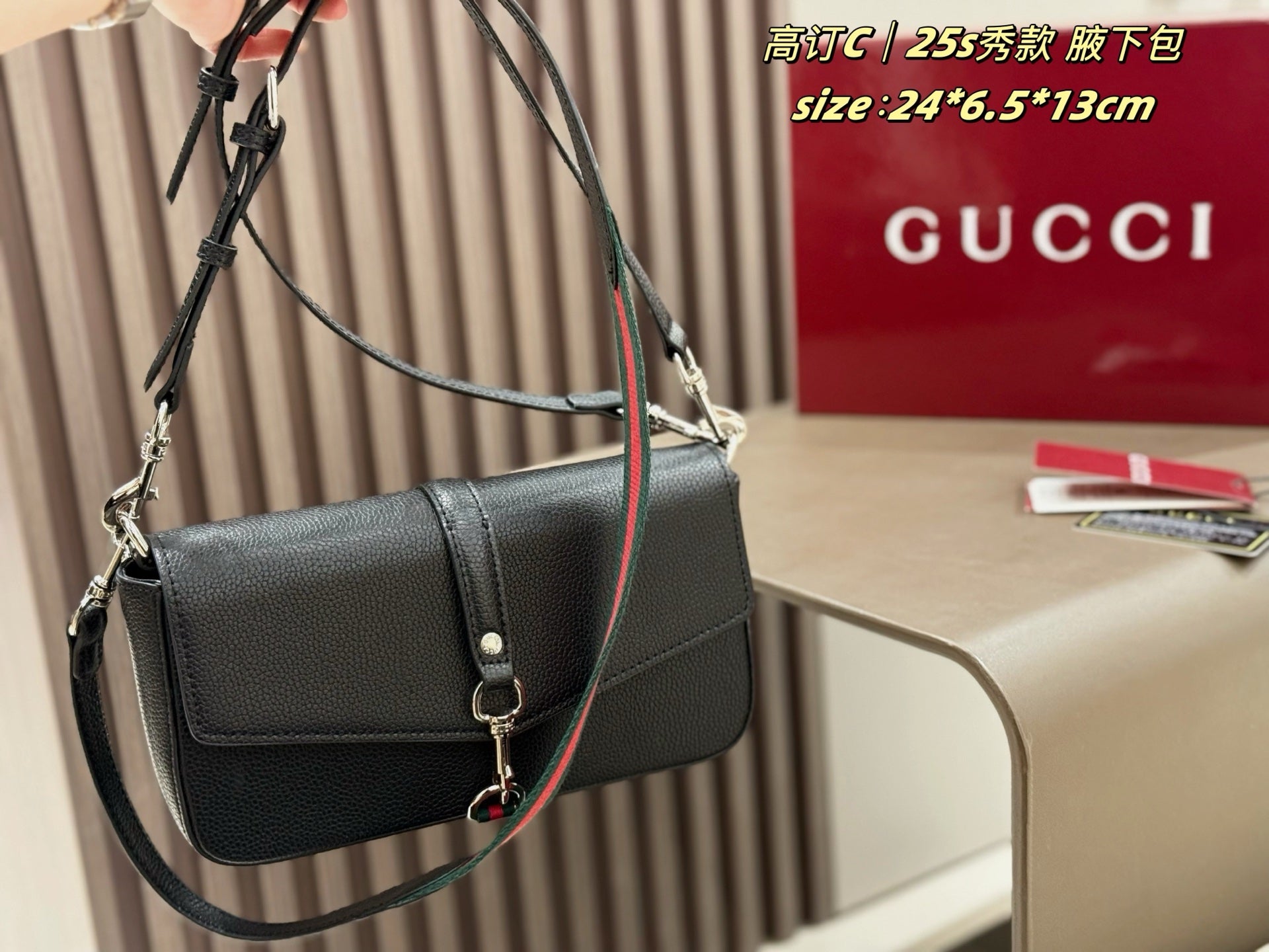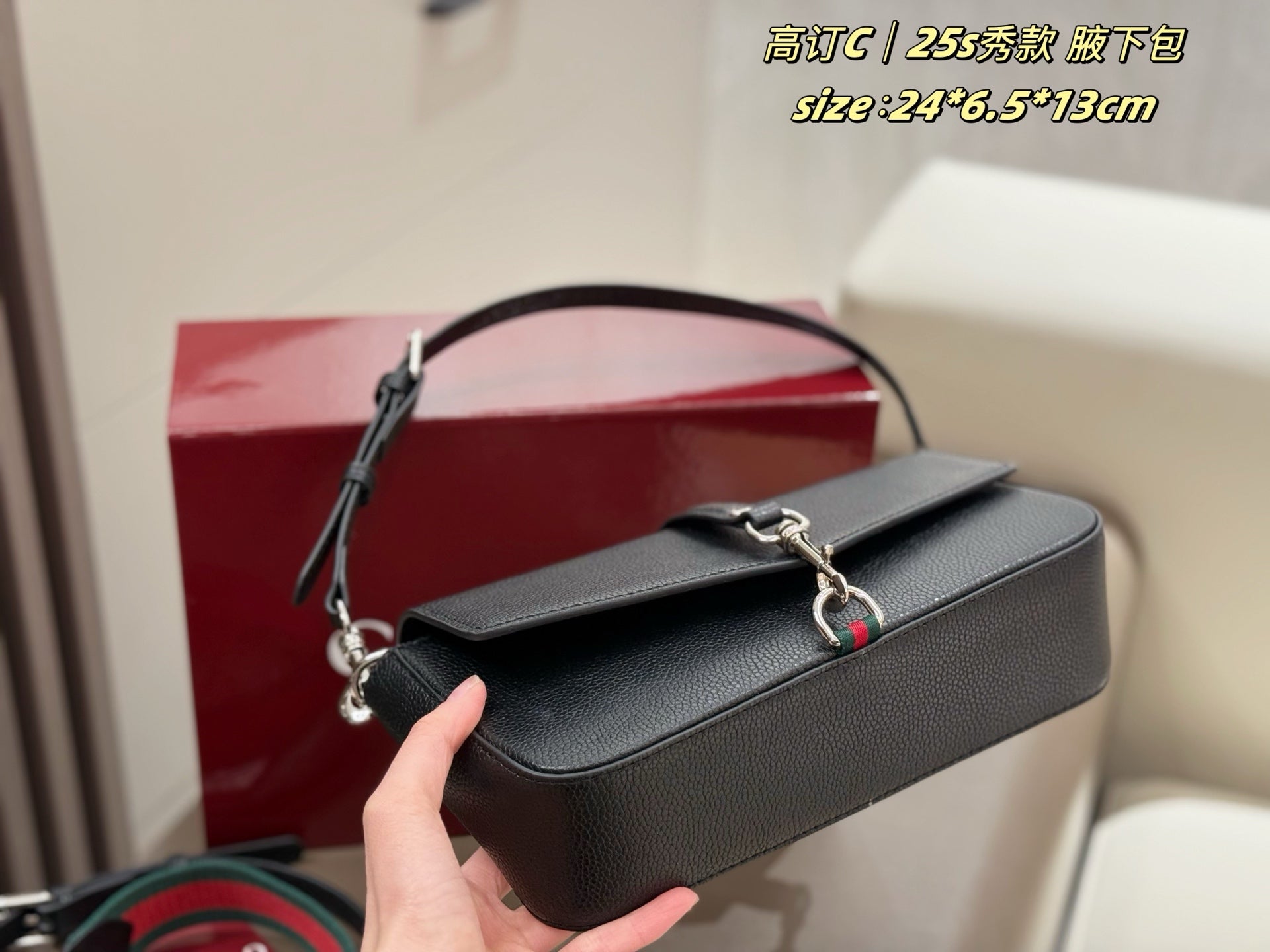 The box-shaped design features detachable components, seamlessly blending retro charm with modern versatility. The cylindrical silhouette offers multiple carrying options: as a clutch, handbag, or shoulder bag. Adorned with the iconic GUCCI logo, the lacquered finish adds an elegant touch.