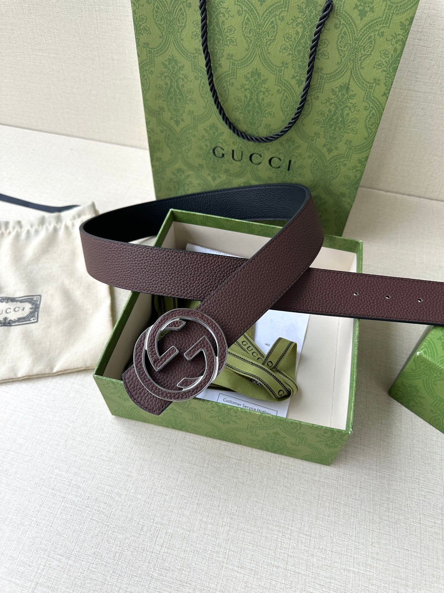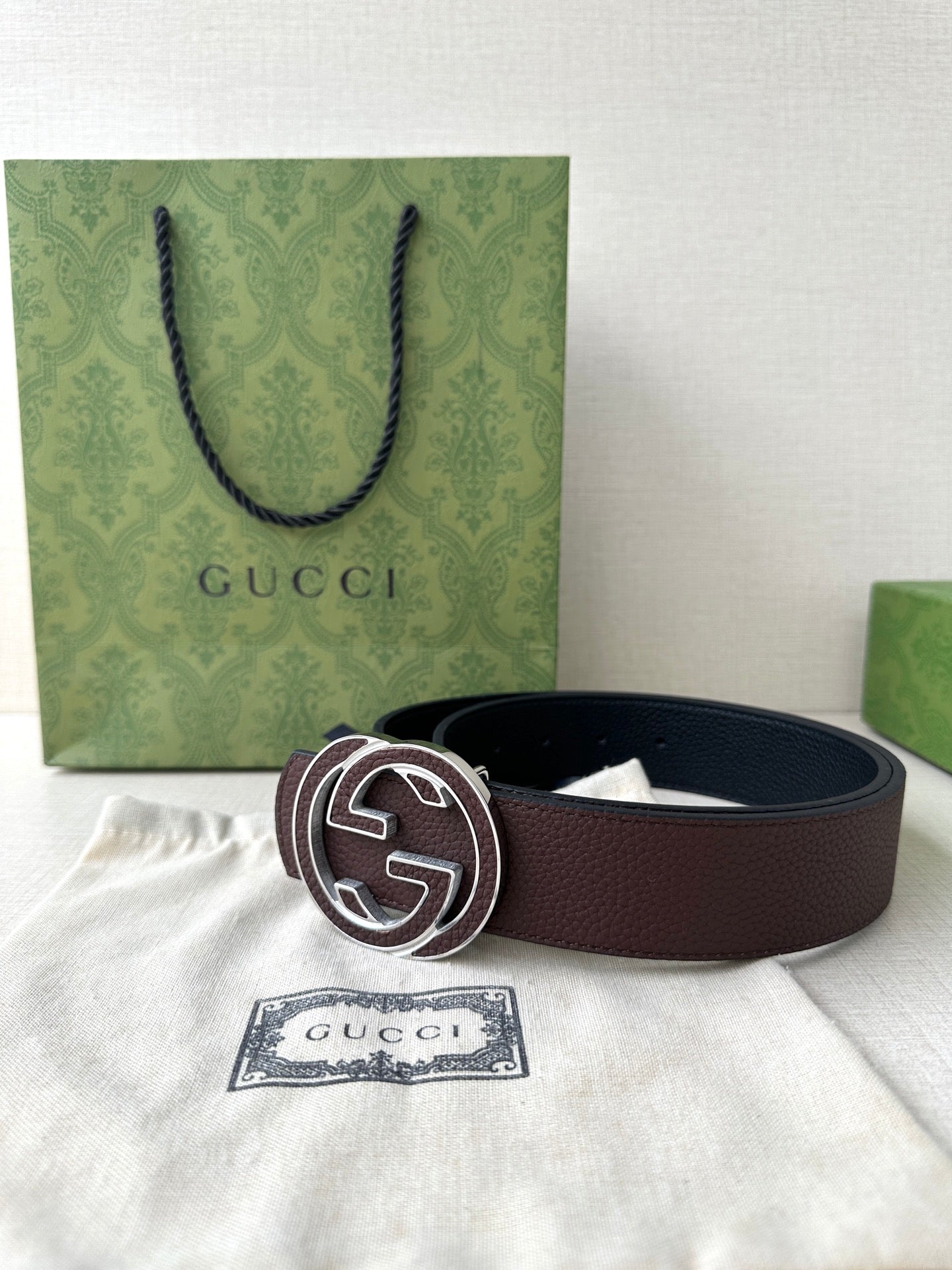 Elevate your accessory game with the GUCCI 4.0cm Reversible Double G Leather Belt from the Early Spring Series. This sophisticated piece expertly blends classic elements with modern design, showcasing a luxurious cow leather construction. Featuring an interlocking Double G buckle and a unique intarsia cow leather detail, this belt offers versatility with its gray leather front and black leather reverse. Perfect for any occasion, this belt is a stylish addition to any wardrobe.