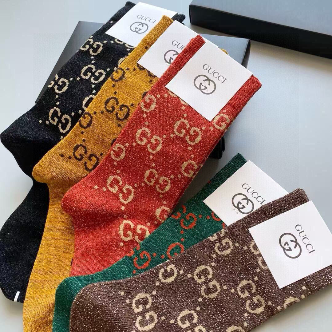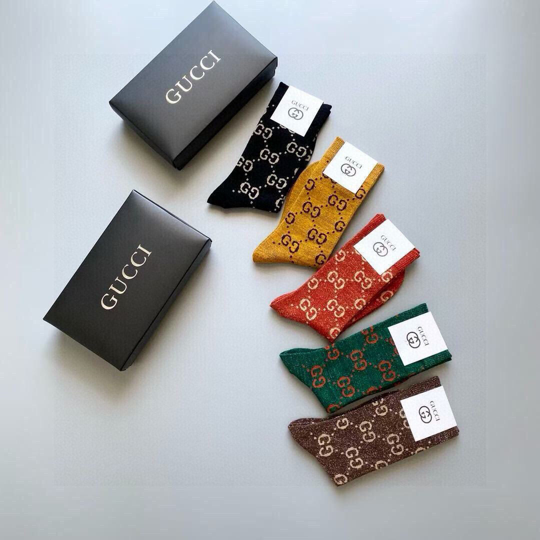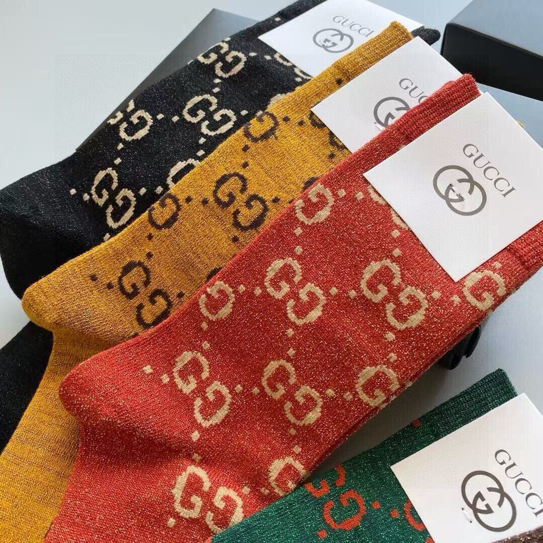 Elevate your wardrobe with our luxurious Gucci Cotton Socks, featuring a stunning five-pair set packaged in a stylish box. Crafted from pure cotton and adorned with sparkling gold threads, these socks are as beautiful as they are comfortable. Their soft, breathable fabric ensures excellent moisture-wicking properties, keeping your feet feeling fresh all day. A favorite among fashion enthusiasts and a must-have accessory for any wardrobe, these socks effortlessly complement a variety of outfits. Experience the perfect blend of style and comfort with these iconic socks, loved by trendsetters on Instagram and beyond.