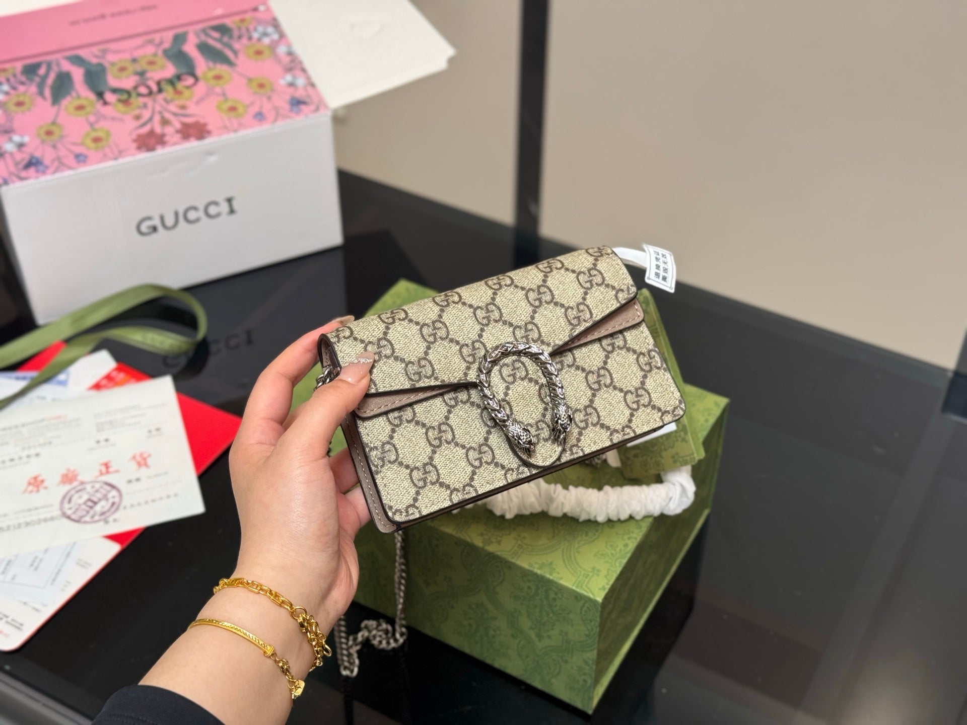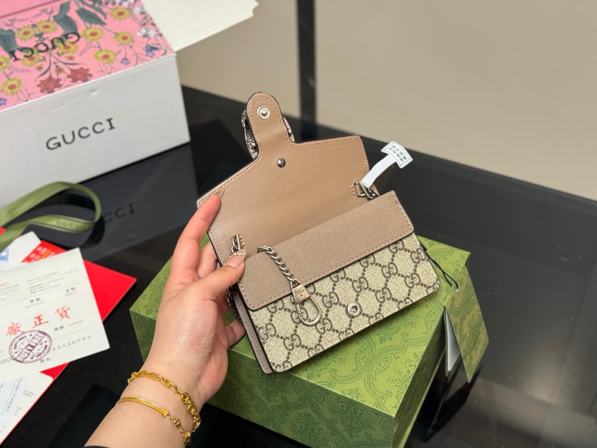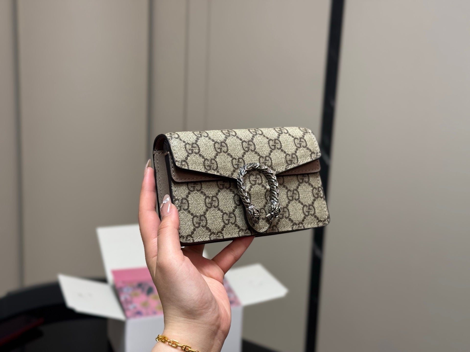Introducing the Gucci Dionysian Bag, a timeless must-have for fashion enthusiasts. Crafted from premium deerskin, this bag boasts a classic design that radiates sophistication. With a compact folding box size of 16.5 cm, it's incredibly easy to carry and perfect for any occasion. Its elegant silhouette adds a touch of refinement to any outfit, making it a versatile accessory for both casual and formal looks. Elevate your style with this hard-to-find piece and experience the luxury of Gucci.
