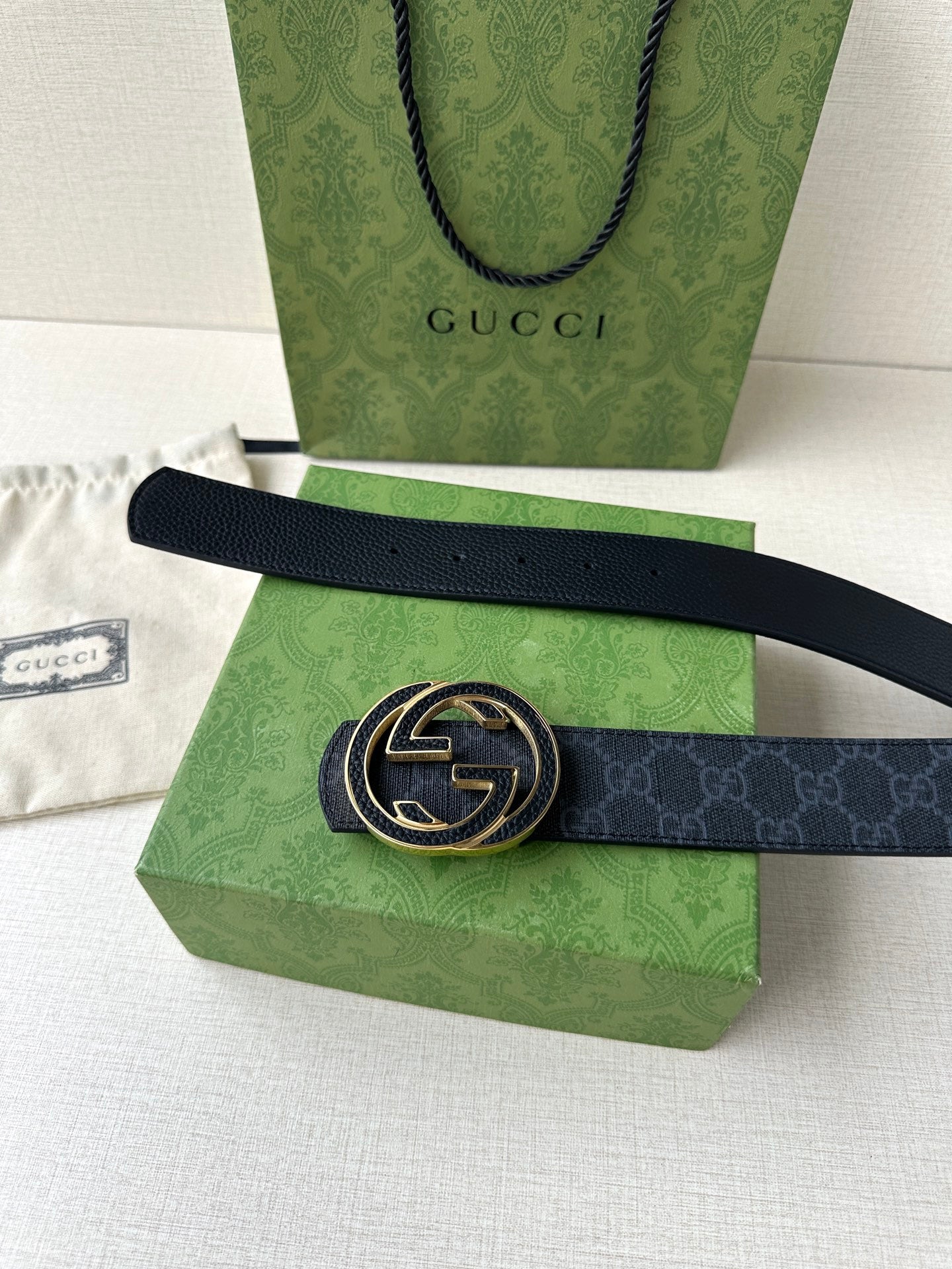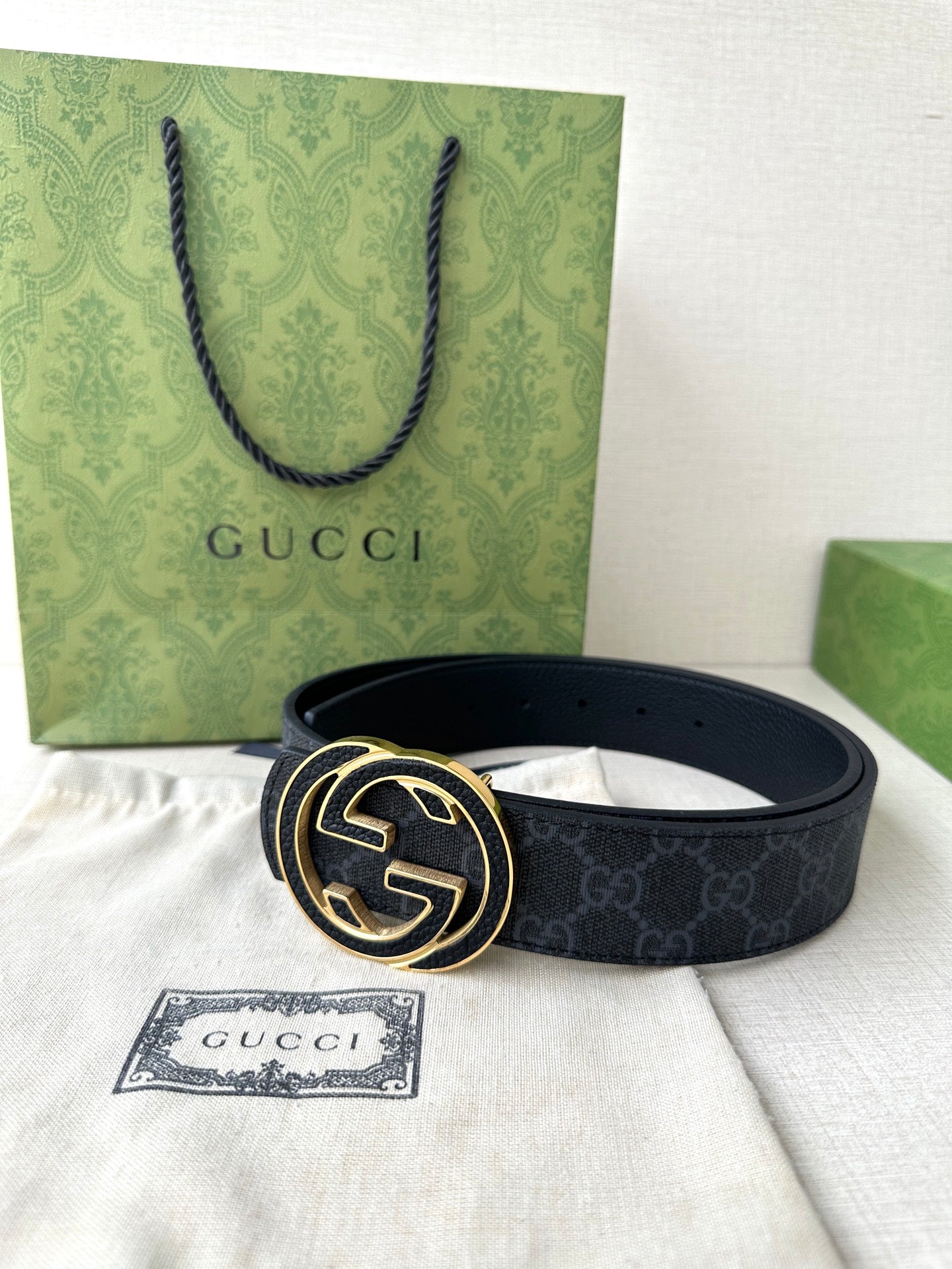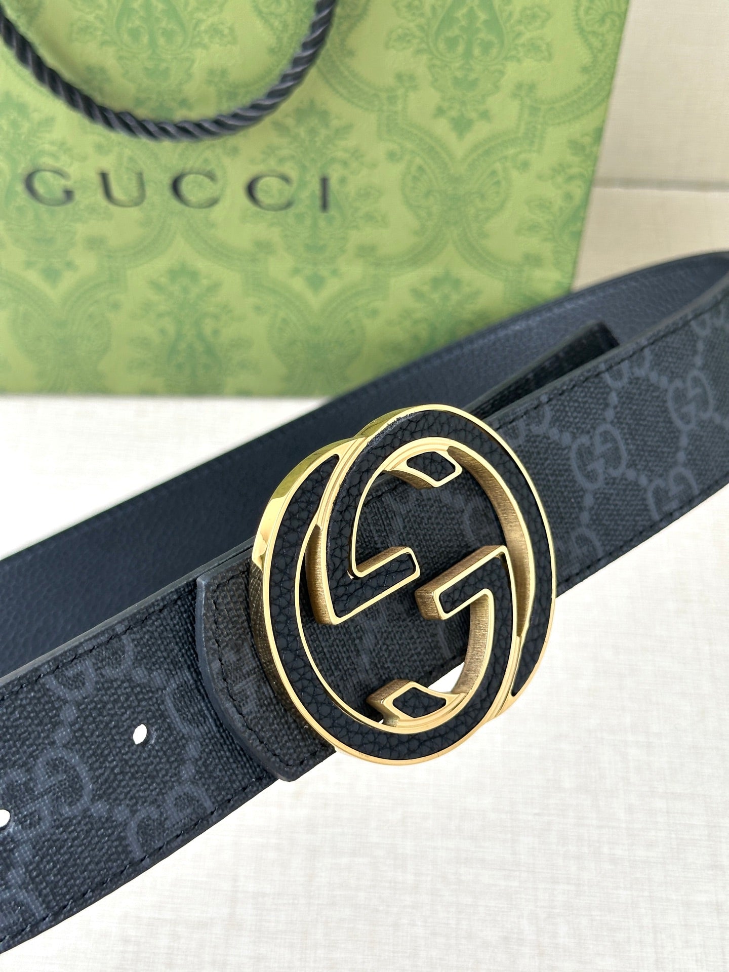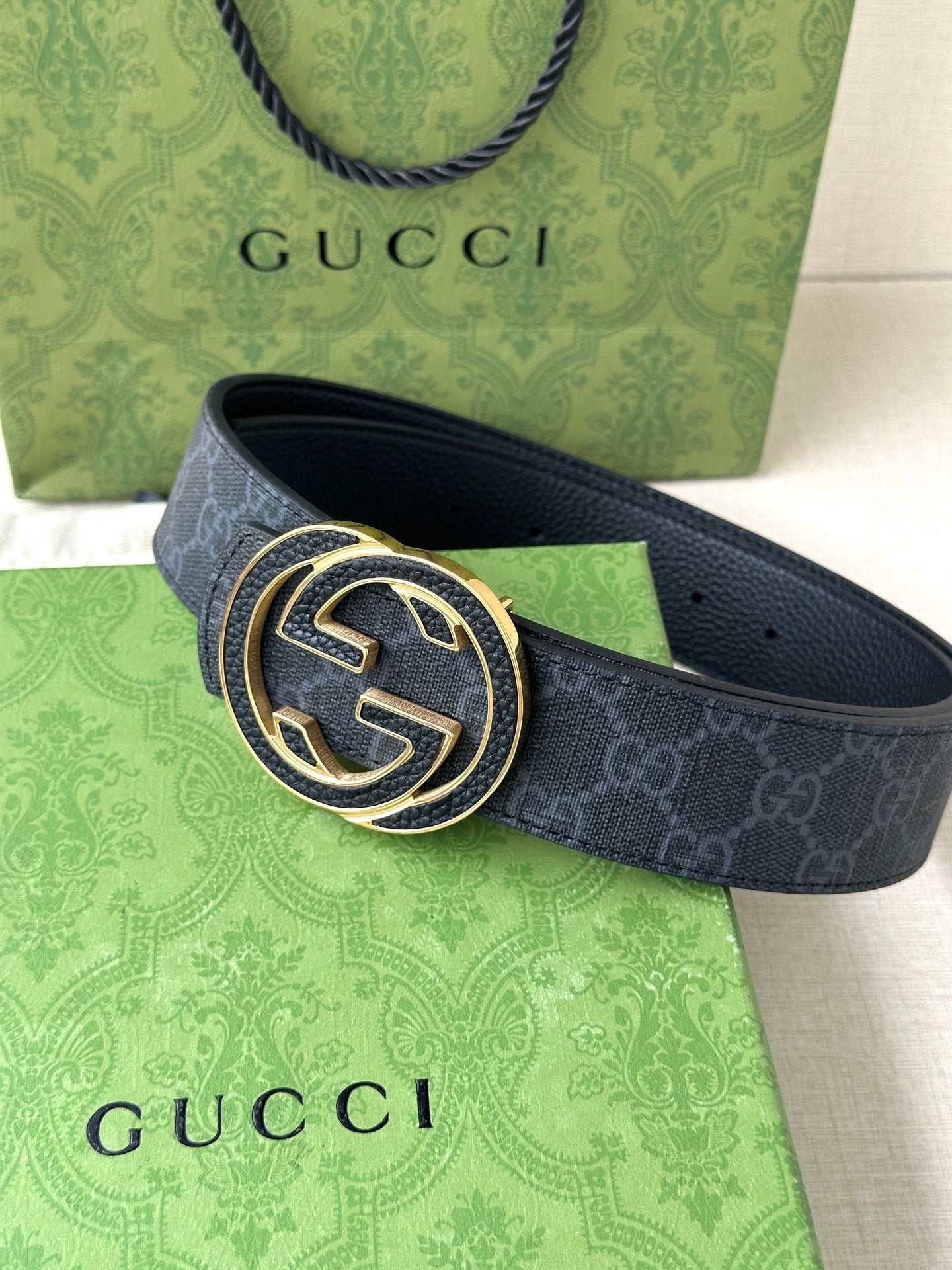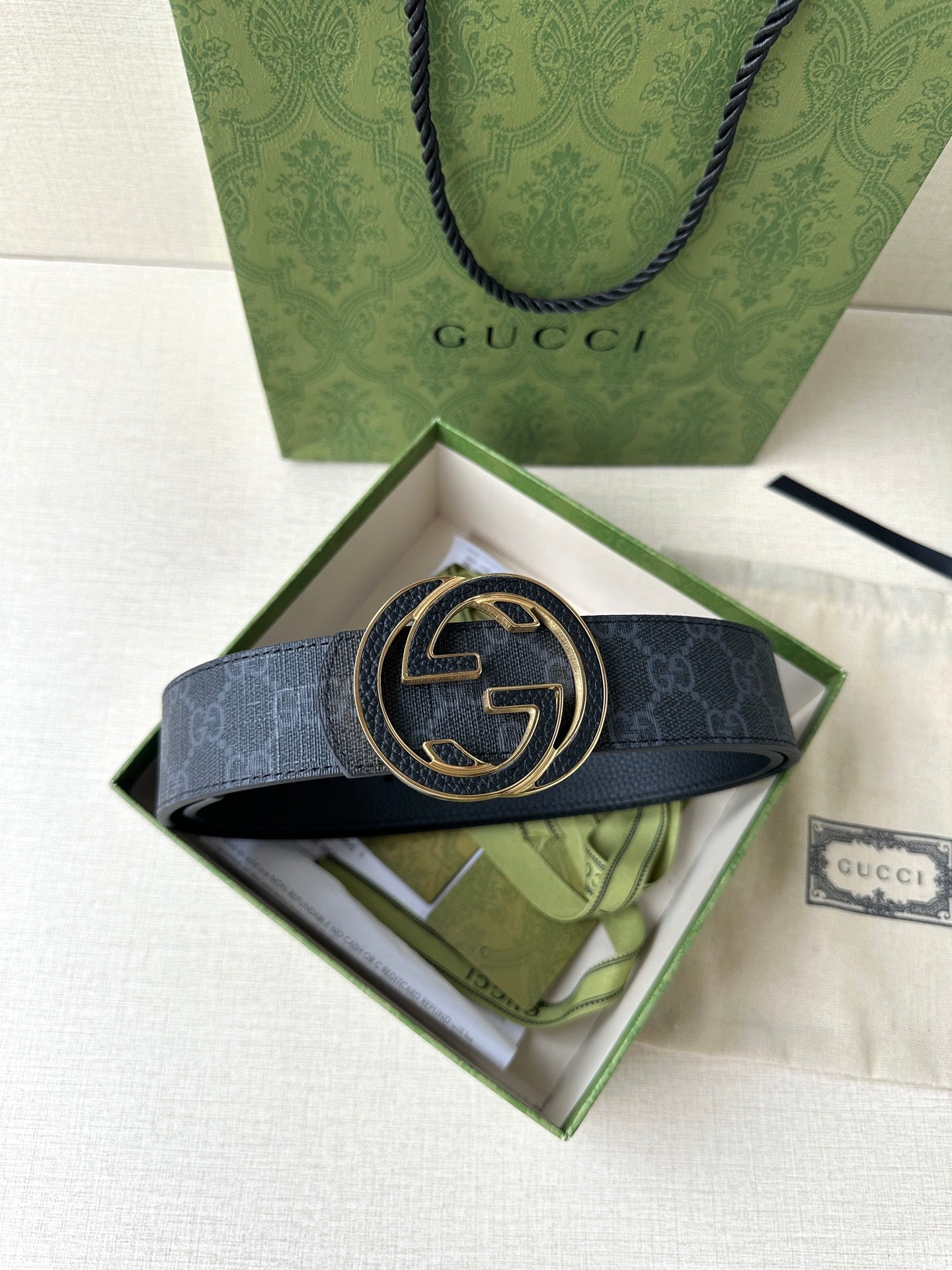 Elevate your style with the GUCCI 4.0cm Reversible Cow Leather Belt from the Early Spring Collection. This belt seamlessly blends classic elements with modern design, featuring a sophisticated interlocking Double G buckle. Crafted from high-quality cow leather, it showcases a chic gray finish on the front and a versatile black leather back, providing multiple styling options. Perfect for enhancing any outfit, this belt is a must-have accessory for the fashion-forward individual.