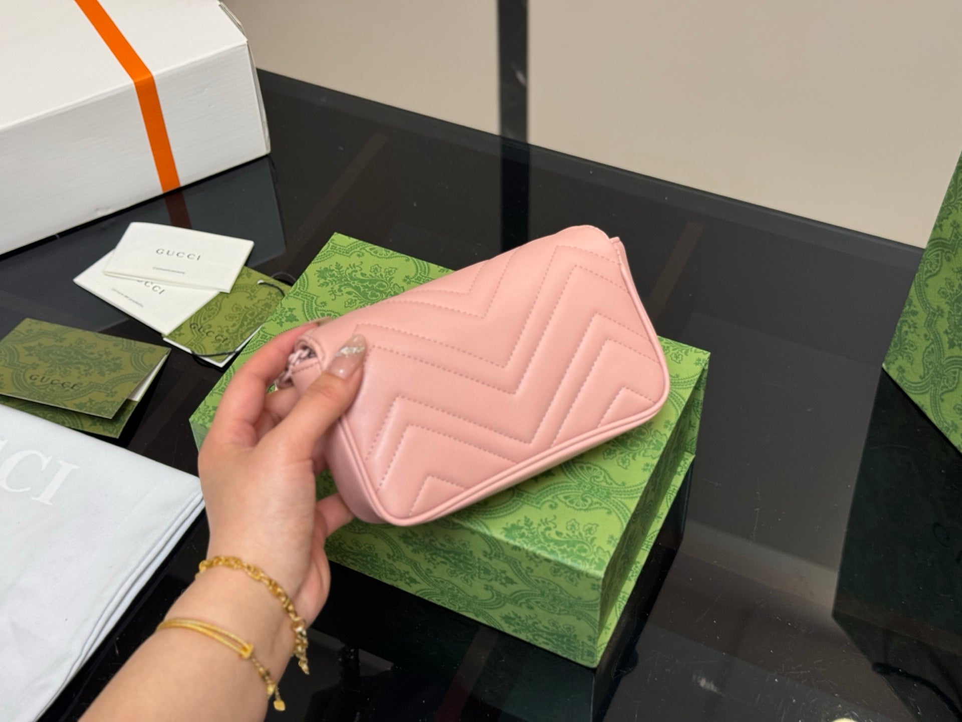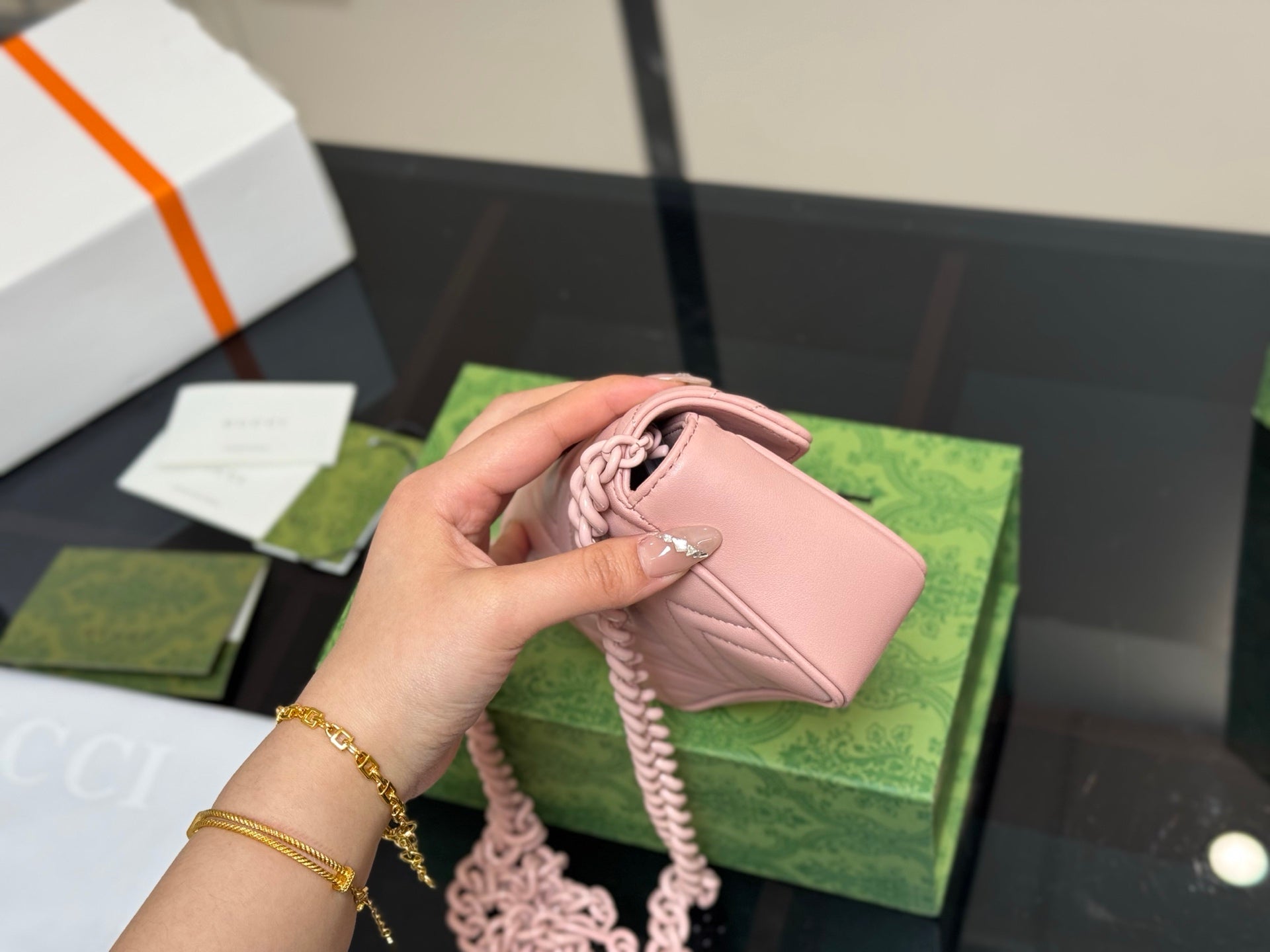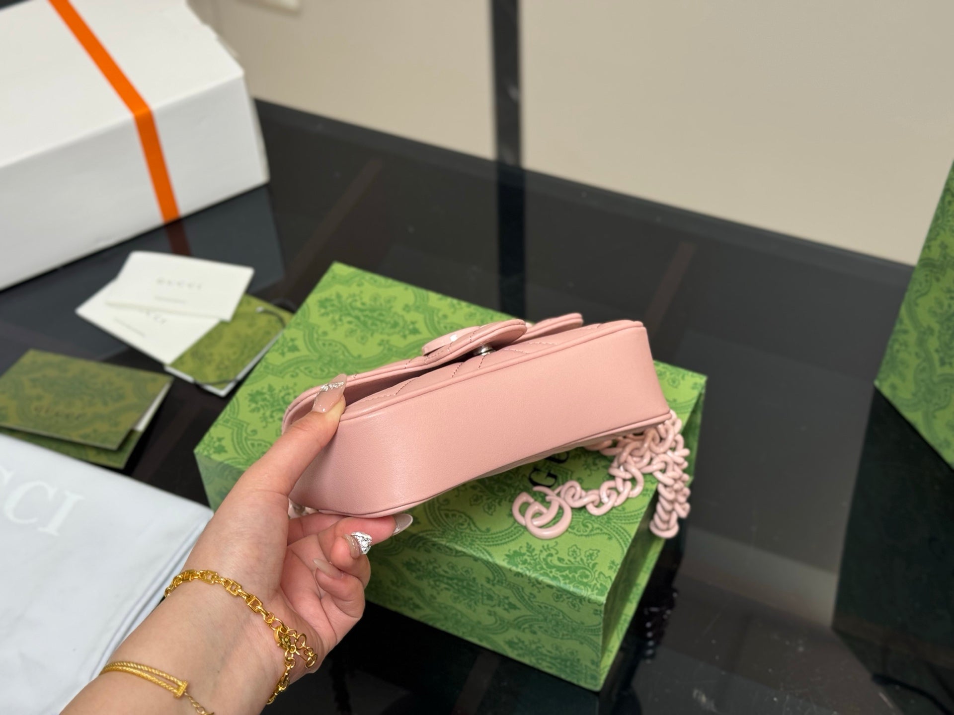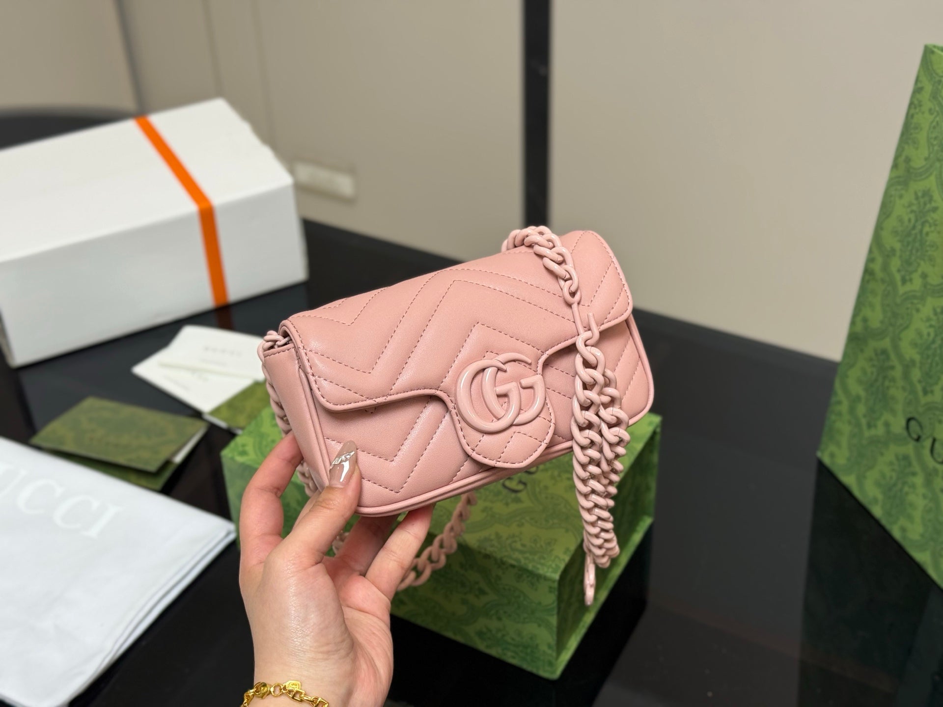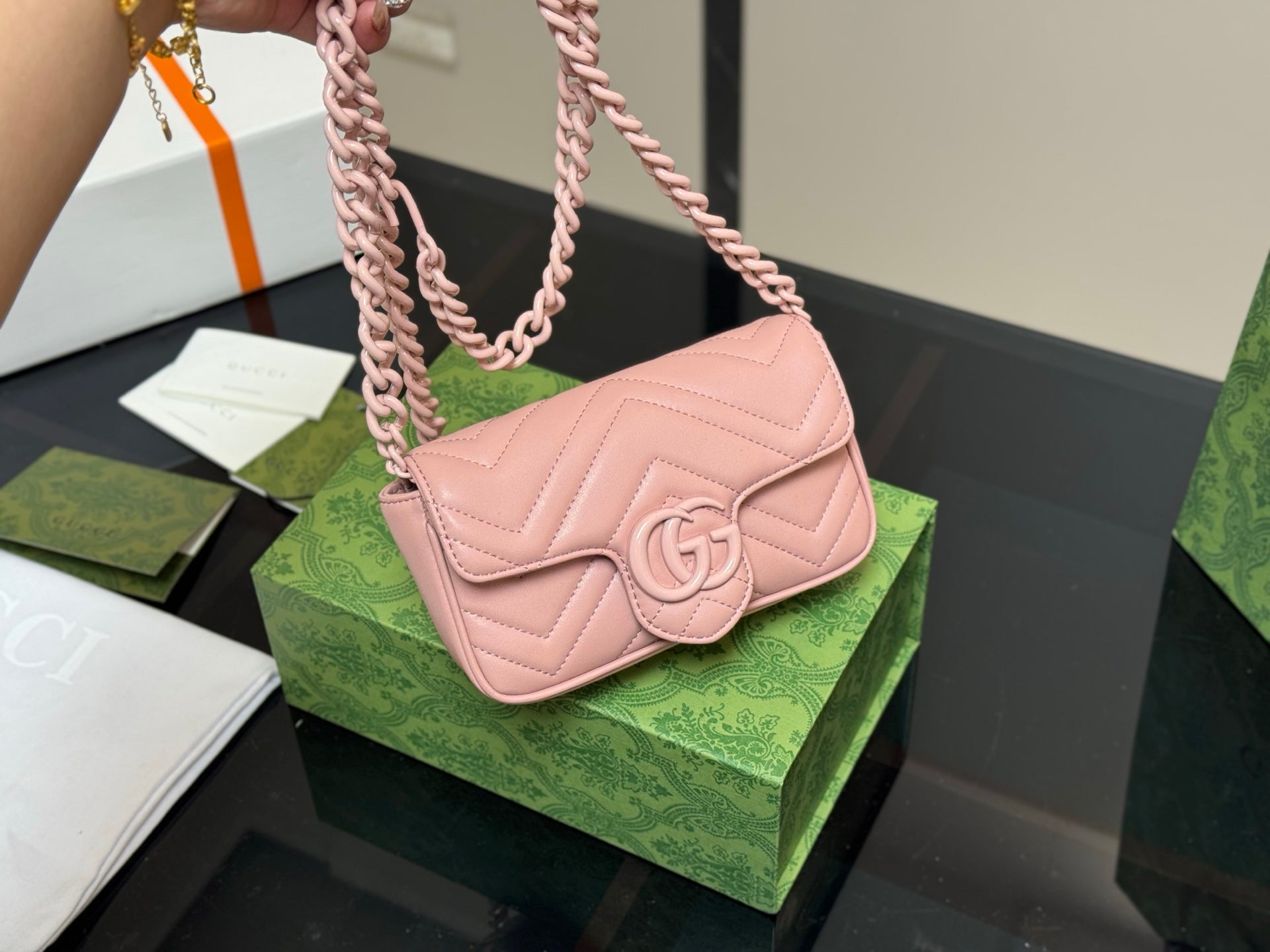 Discover the exquisite Gucci GG Marmont 16cm Sheepskin Macaron Series, elegantly packaged in a folding box and featuring a compact size perfect for travel. Crafted with high-quality sheepskin, this luxurious accessory offers both style and practicality. Enjoy the assurance of original Gucci quality at a cost-effective price. Elevate your collection with this stylish and versatile piece that embodies sophistication and elegance.