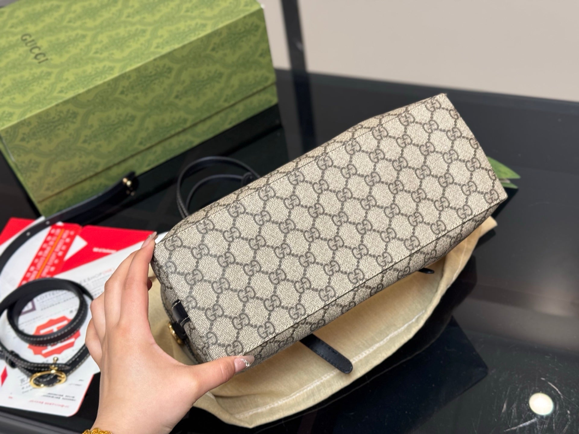 Introducing the latest addition to our collection – the Gucci GG Tote Bag. This versatile handbag features a chic folding design, making it perfect for any occasion. Crafted with the iconic Gucci GG pattern, it can be used as a tote or a shoulder bag, offering both style and functionality. With a convenient size of 30.18 cm, this bag is designed for modern elegance. Elevate your accessory game with this must-have piece from Gucci.