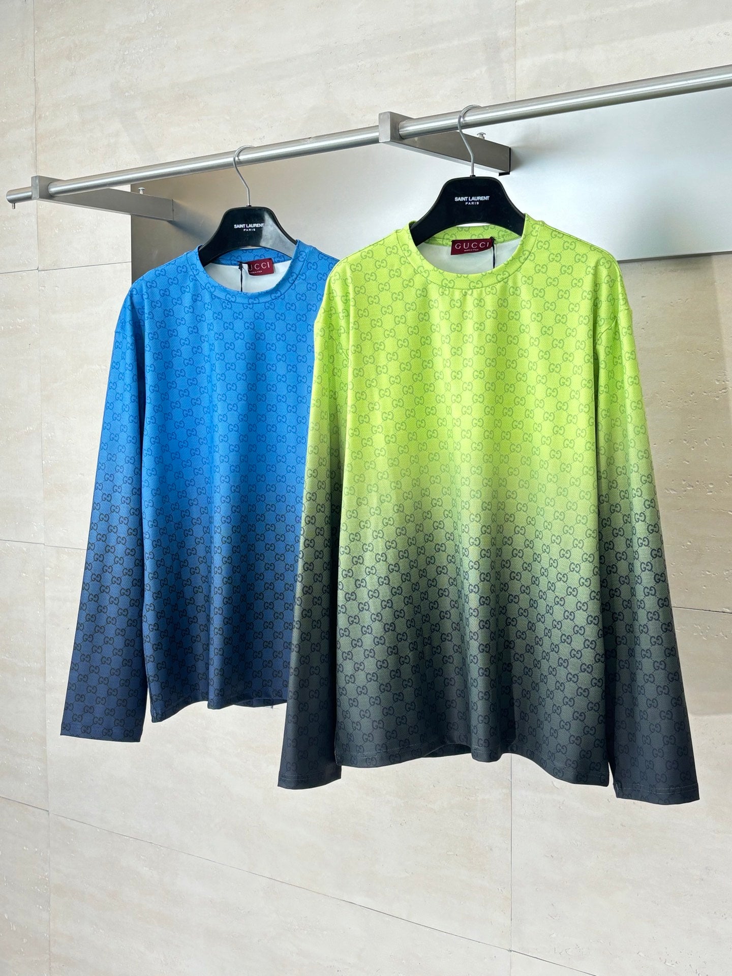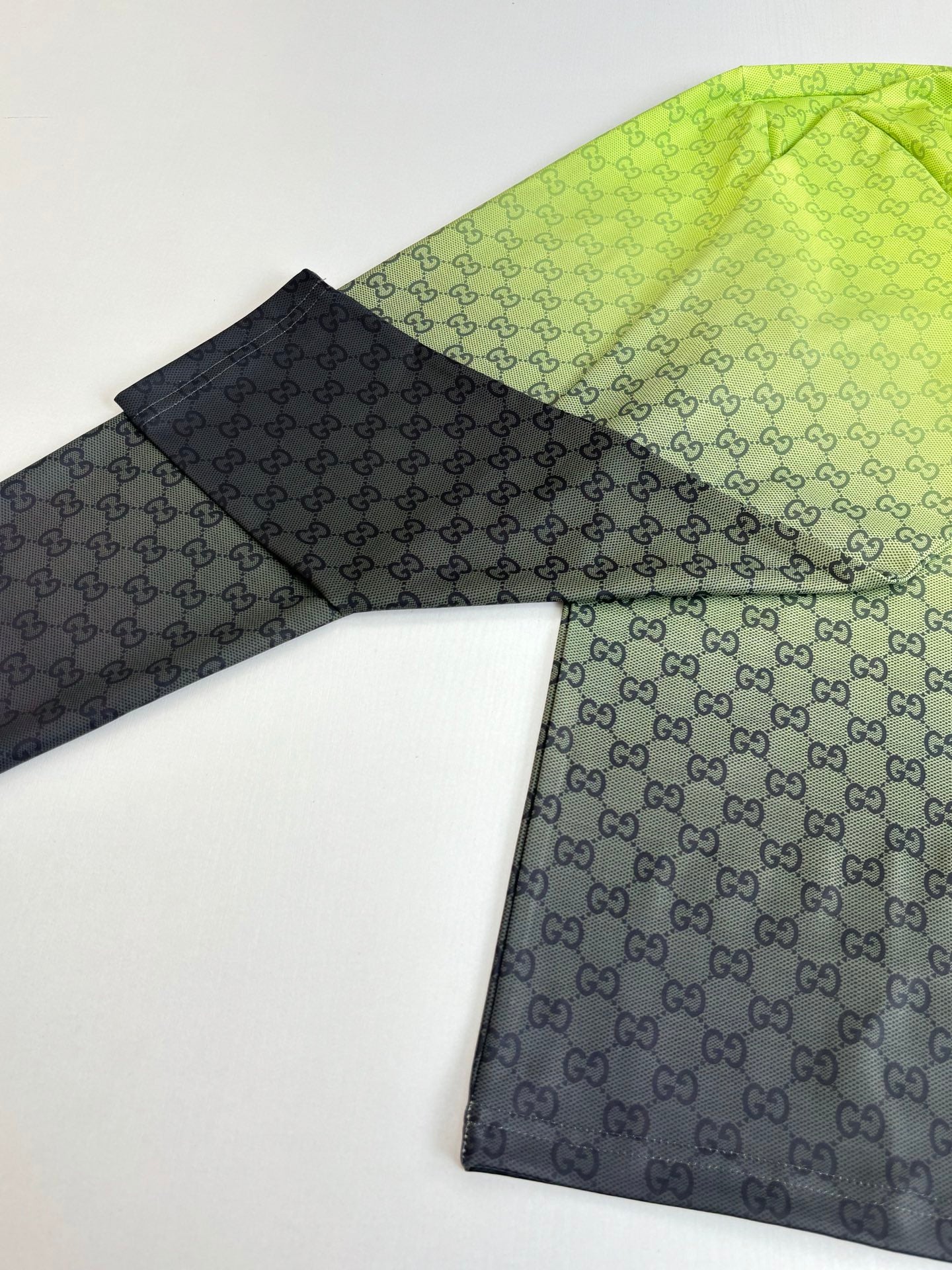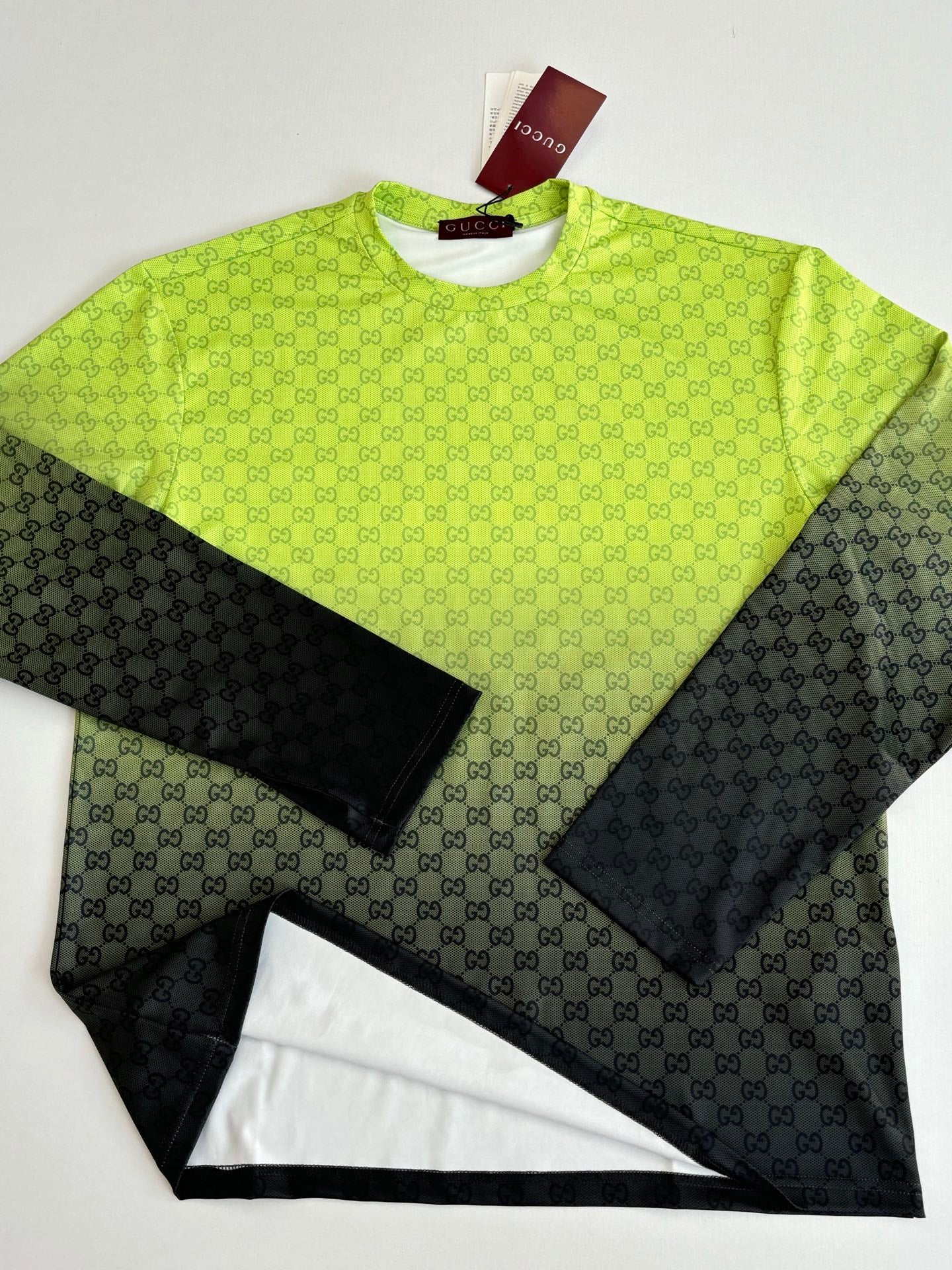 Elevate your wardrobe with the Gucci Gradient Print Long-Sleeve T-Shirt. Crafted from premium jersey cotton, this stylish tee showcases an eye-catching gradient design that transitions from vibrant lime green to deep black. Featuring a comfortable round neck and long sleeves, it offers both versatility and a modern flair. Perfect for making a statement, this T-shirt is available in sizes S, M, L, and XL. Experience the unique texture and iconic Gucci pattern with this standout piece.