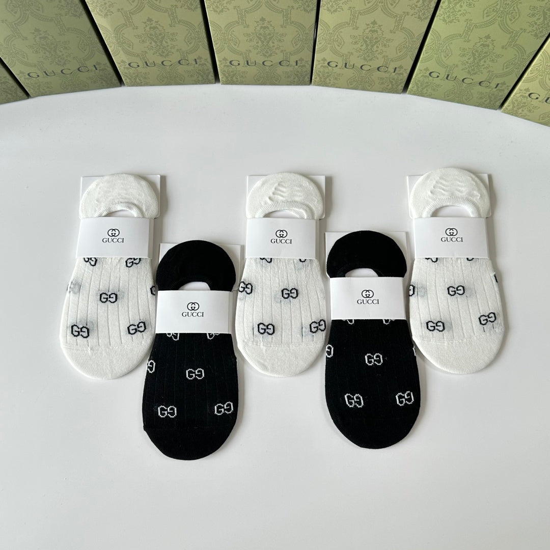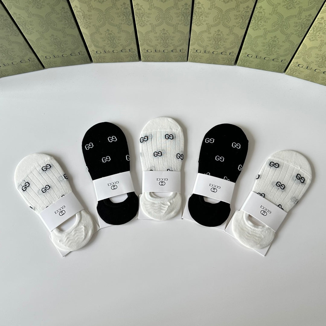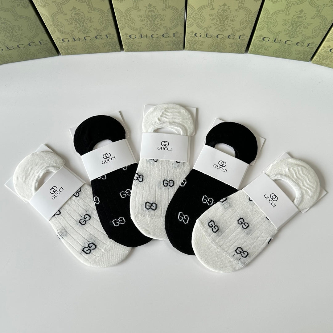 Step up your sock game with these Gucci Invisible Boat Socks. This stylish set includes five pairs, beautifully packaged for your convenience. Designed for effortless coordination with any outfit, these premium socks are a must-have for the modern fashionista. Elevate your everyday look with Gucci's signature quality and flair. Perfect for any occasion—experience luxury in every step!