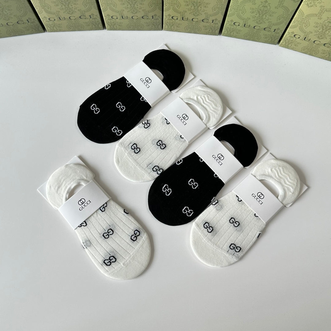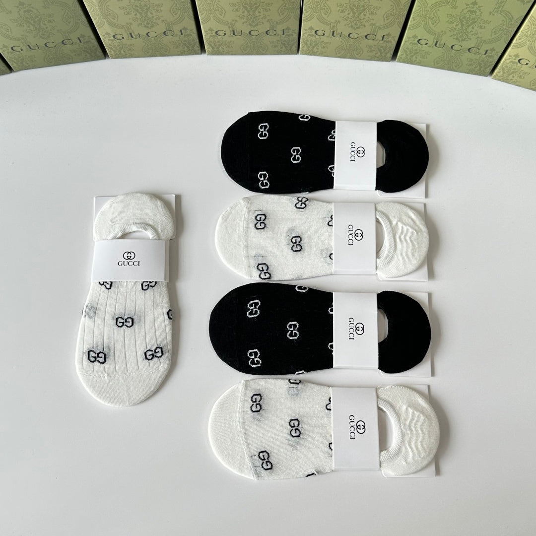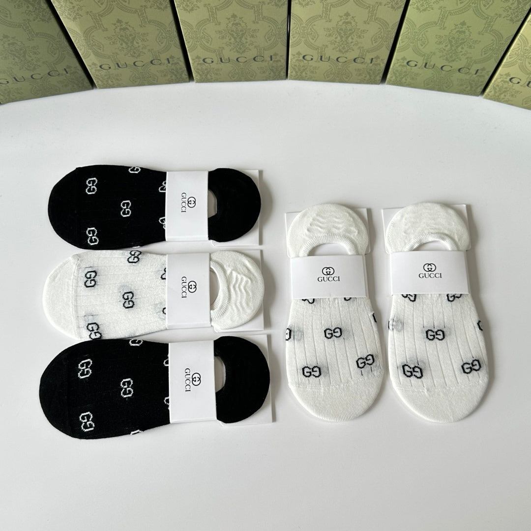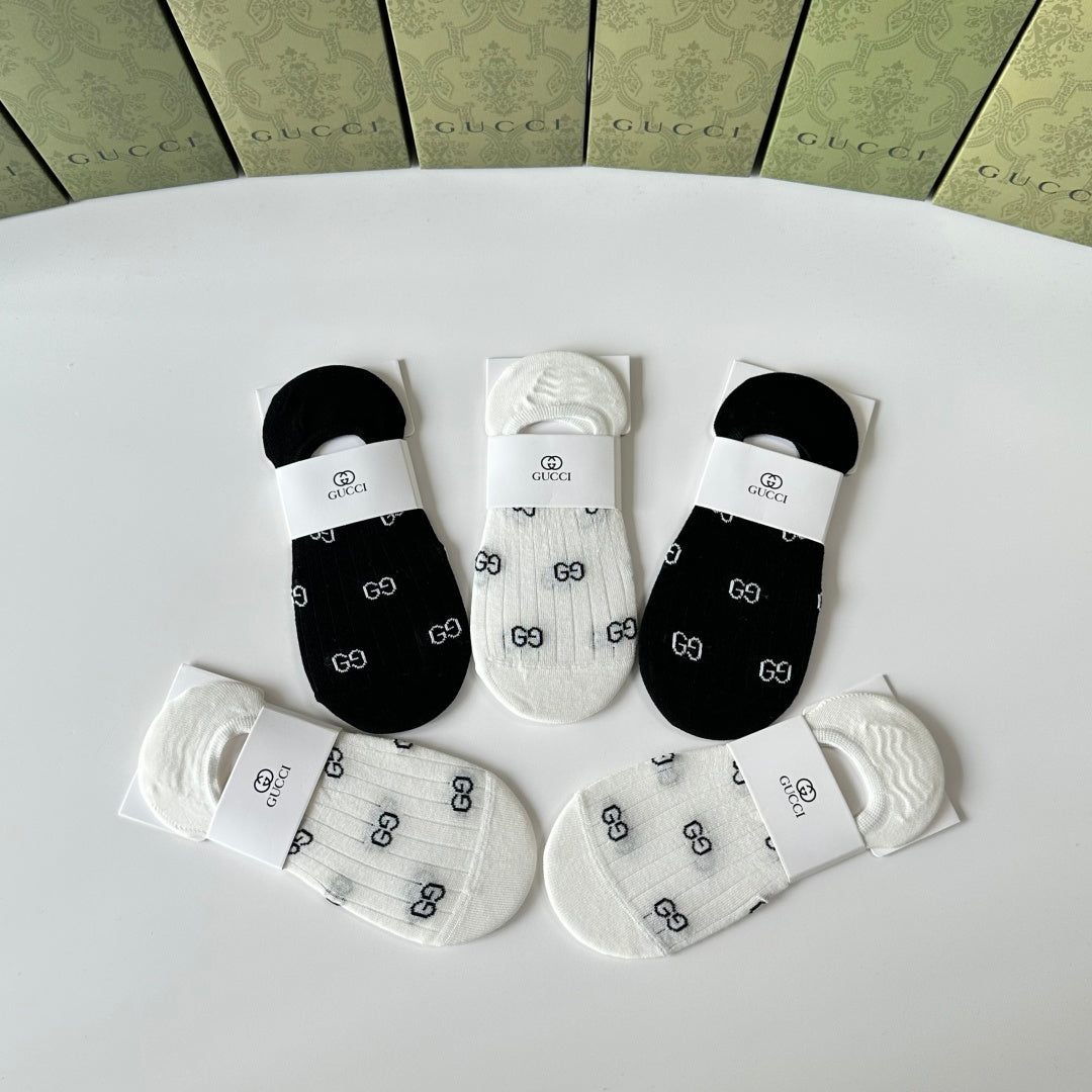 Step up your sock game with these Gucci Invisible Boat Socks. This stylish set includes five pairs, beautifully packaged for your convenience. Designed for effortless coordination with any outfit, these premium socks are a must-have for the modern fashionista. Elevate your everyday look with Gucci's signature quality and flair. Perfect for any occasion—experience luxury in every step!