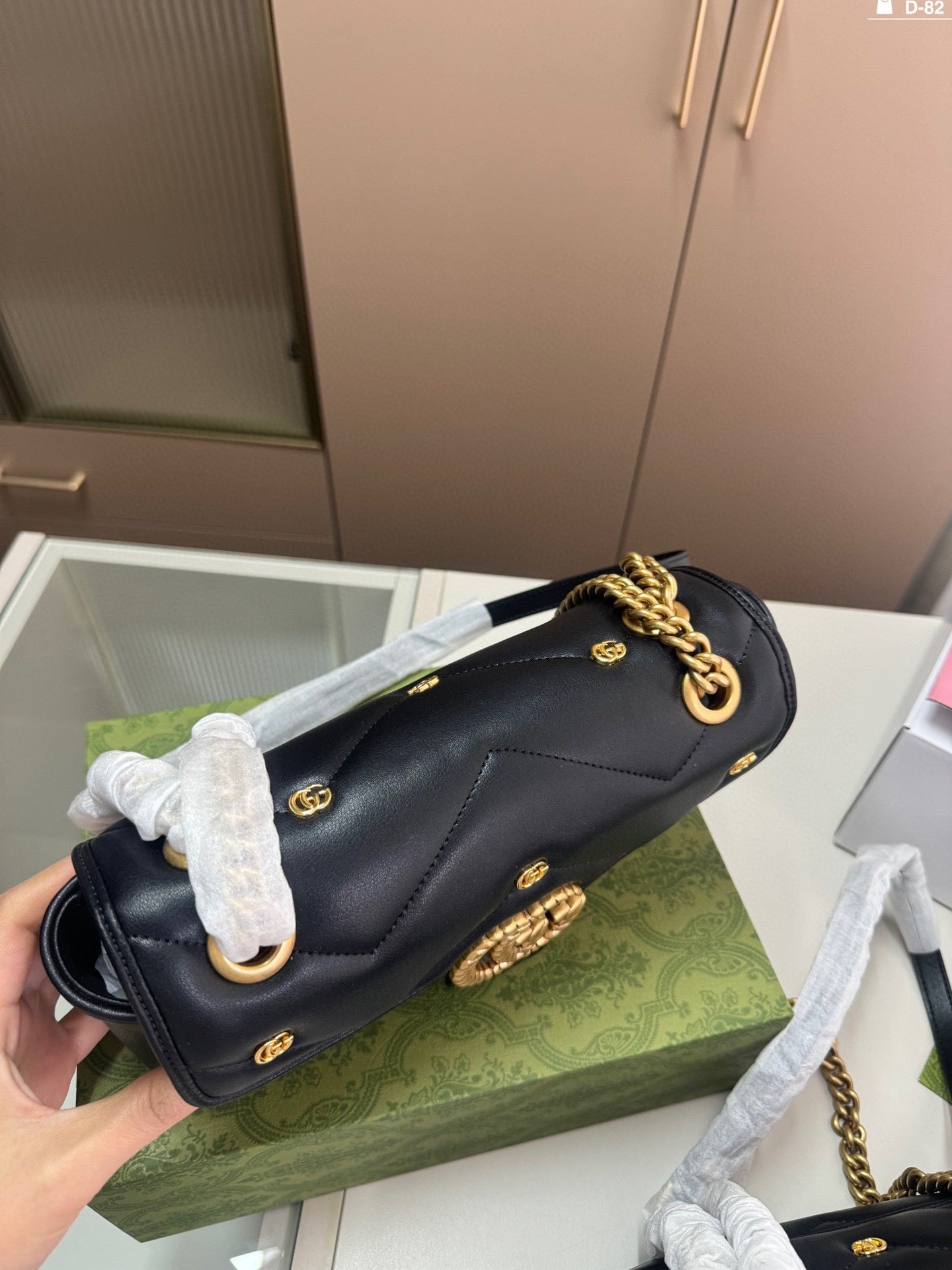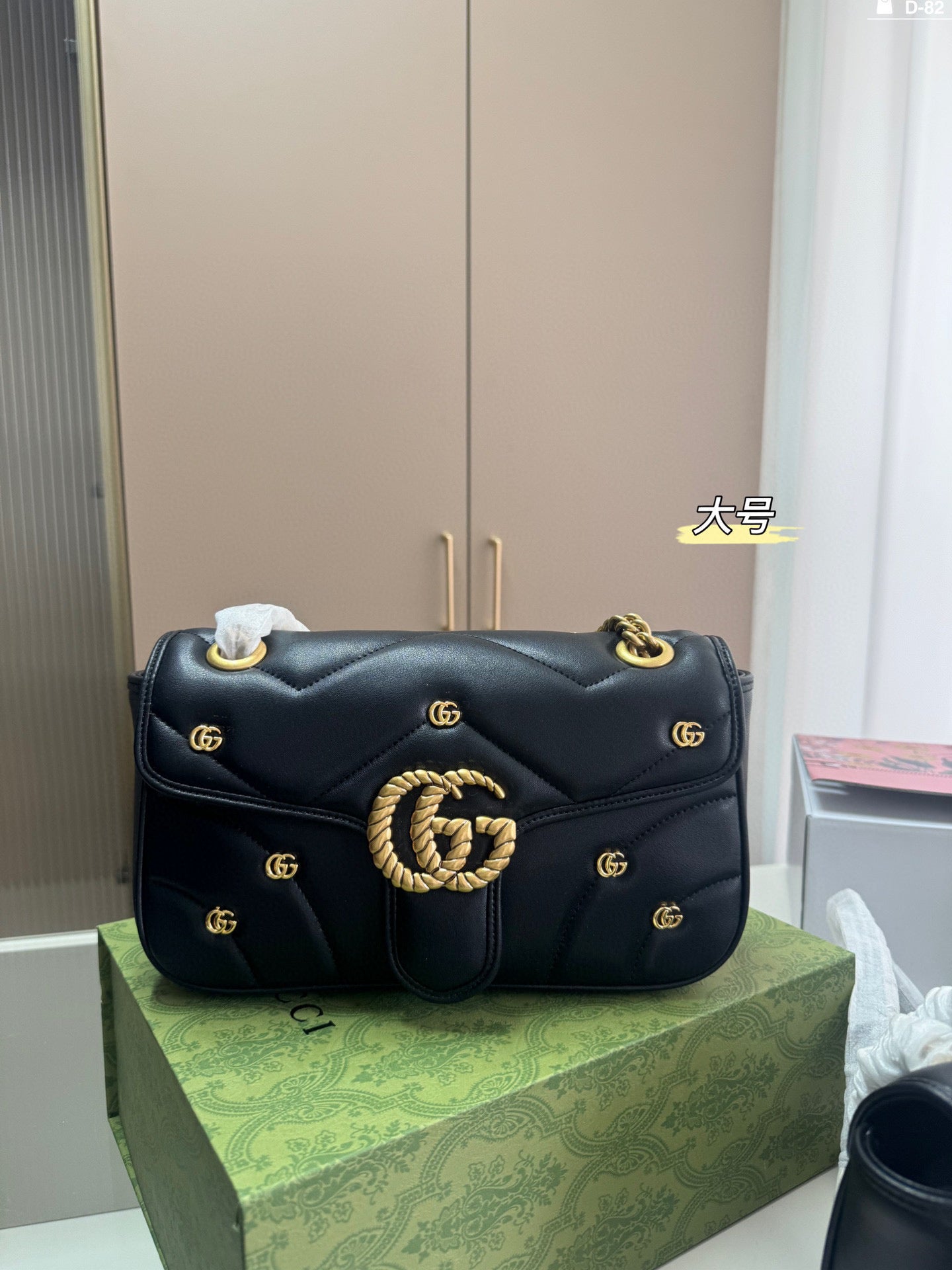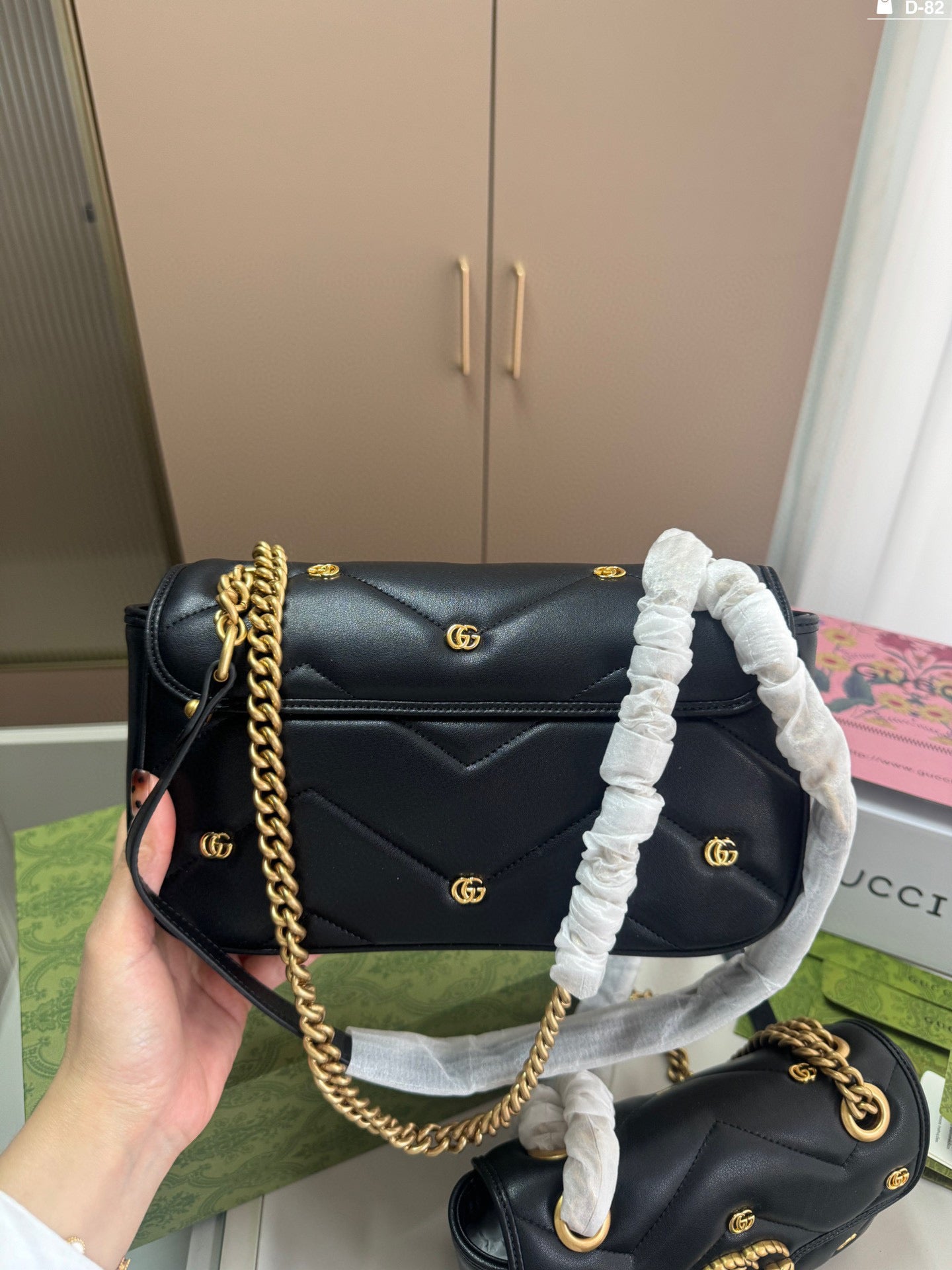 Introducing the Gucci Marmont Badge Chain Bag, a delightful accessory that perfectly combines style and functionality. Crafted from soft materials, this eye-catching bag features the iconic GG Marmont design and a unique puffy silhouette that adds a playful touch to any outfit. With dimensions of 25×15/20×13 cm, it conveniently folds into a compact box, making it ideal for travel or everyday use. Elevate your fashion game with this chic and versatile piece.