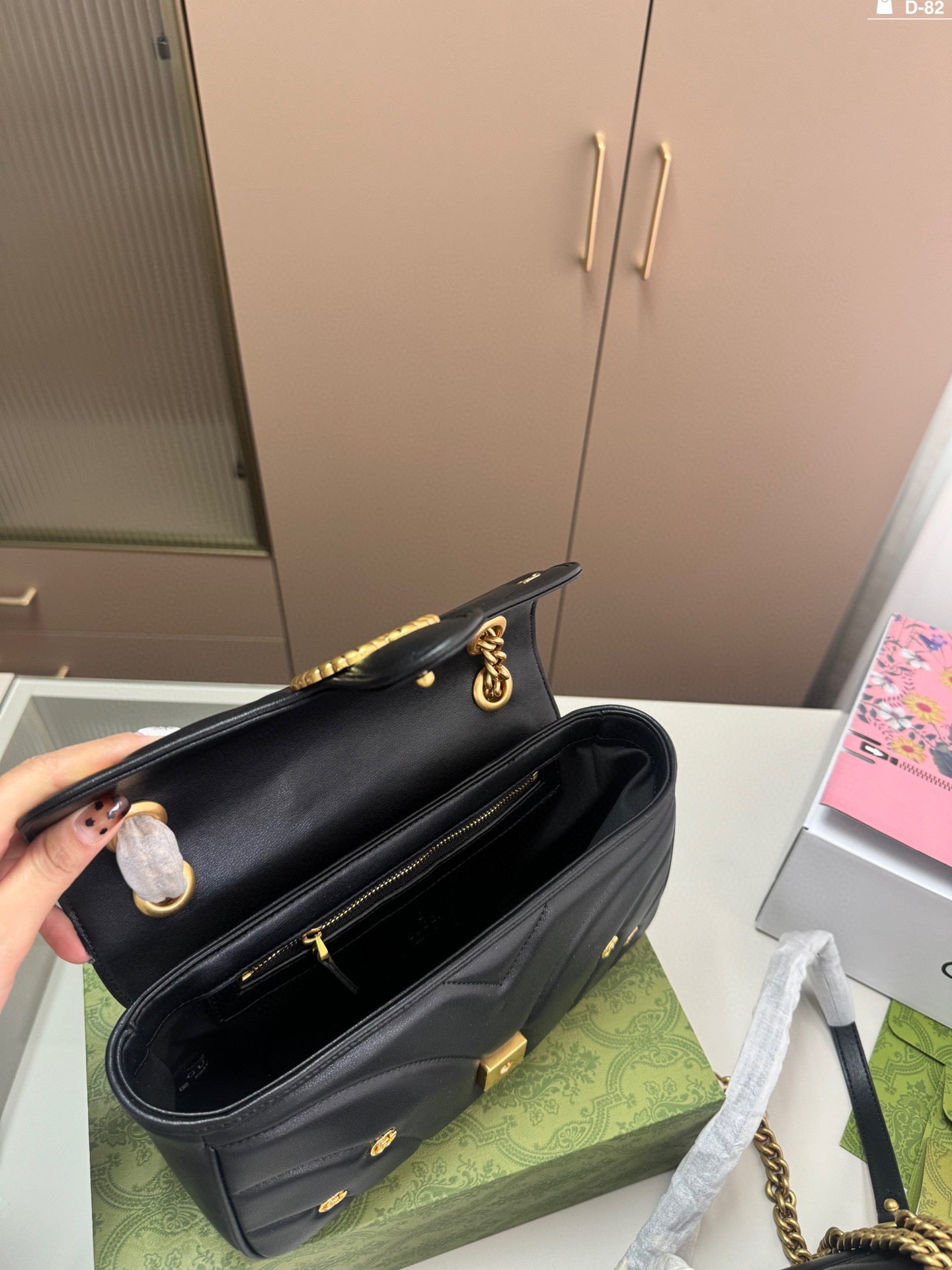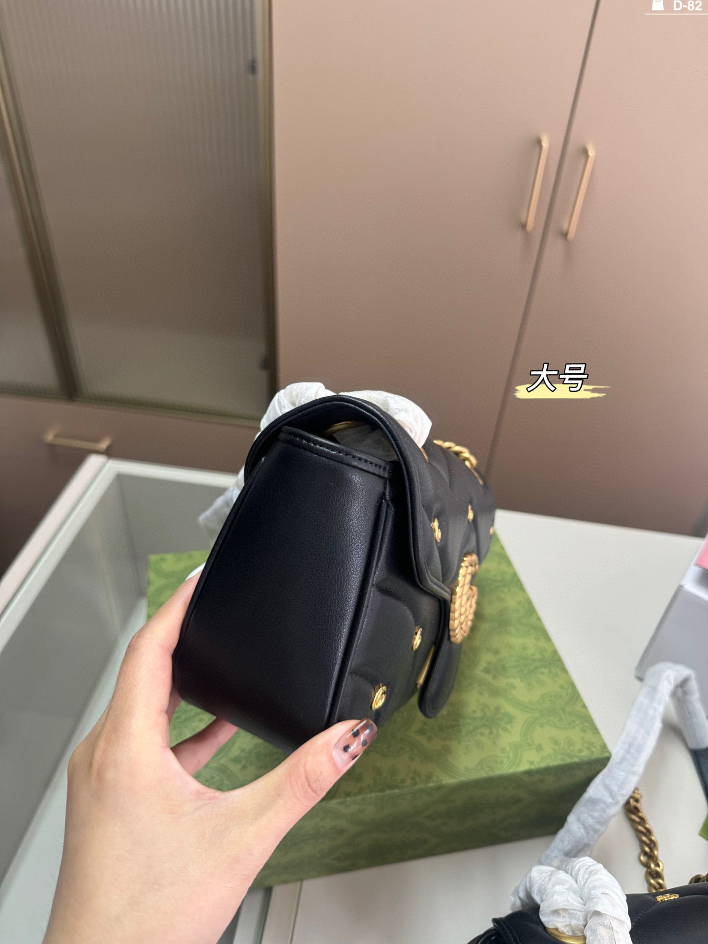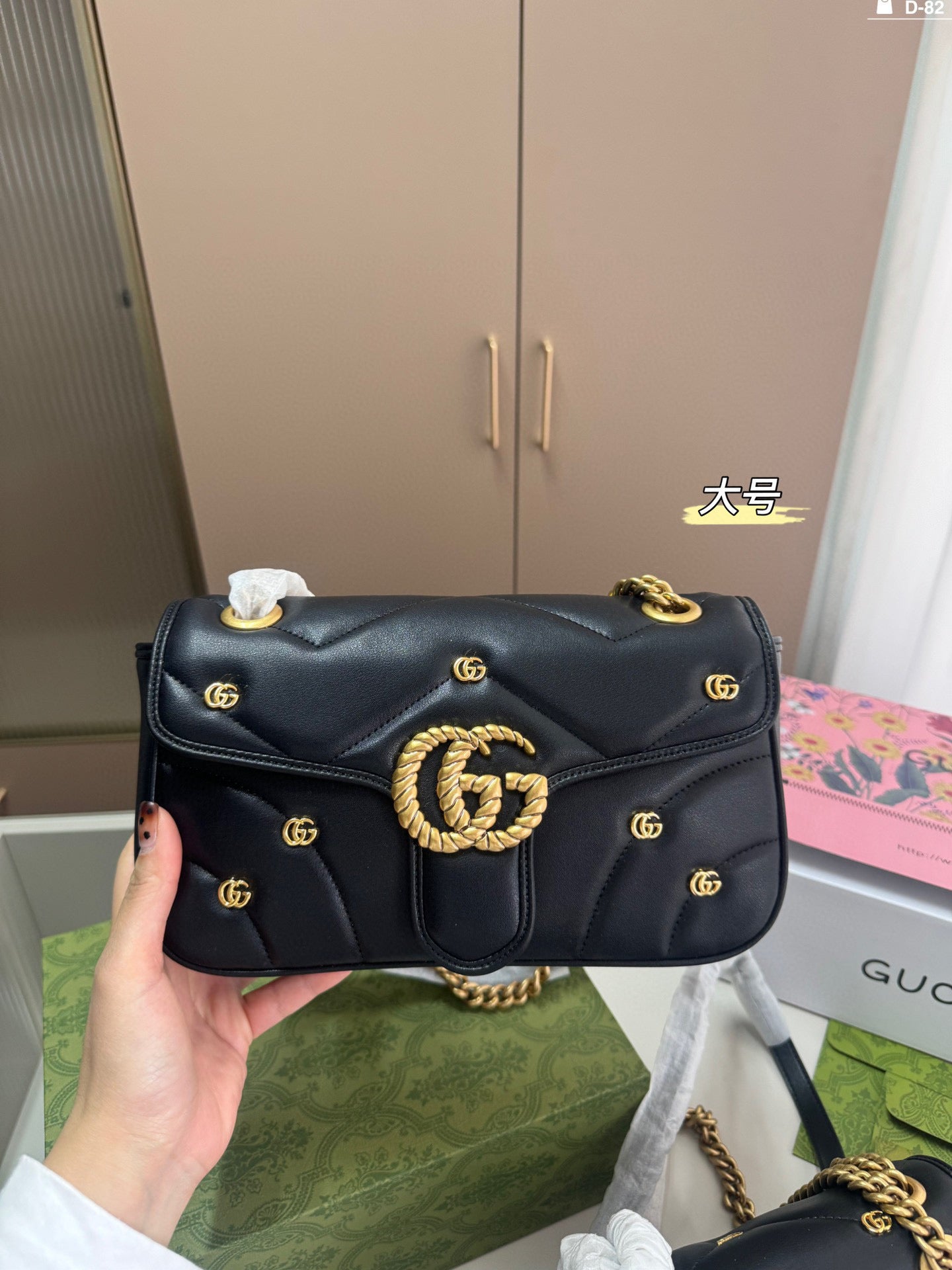 Introducing the Gucci Marmont Badge Chain Bag, a delightful accessory that perfectly combines style and functionality. Crafted from soft materials, this eye-catching bag features the iconic GG Marmont design and a unique puffy silhouette that adds a playful touch to any outfit. With dimensions of 25×15/20×13 cm, it conveniently folds into a compact box, making it ideal for travel or everyday use. Elevate your fashion game with this chic and versatile piece.