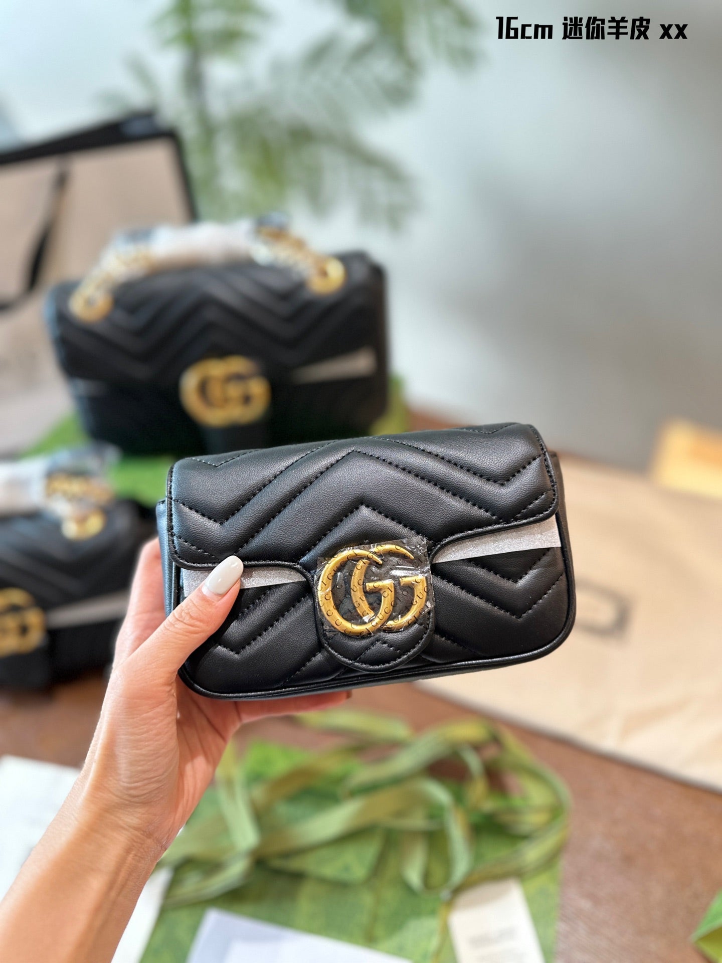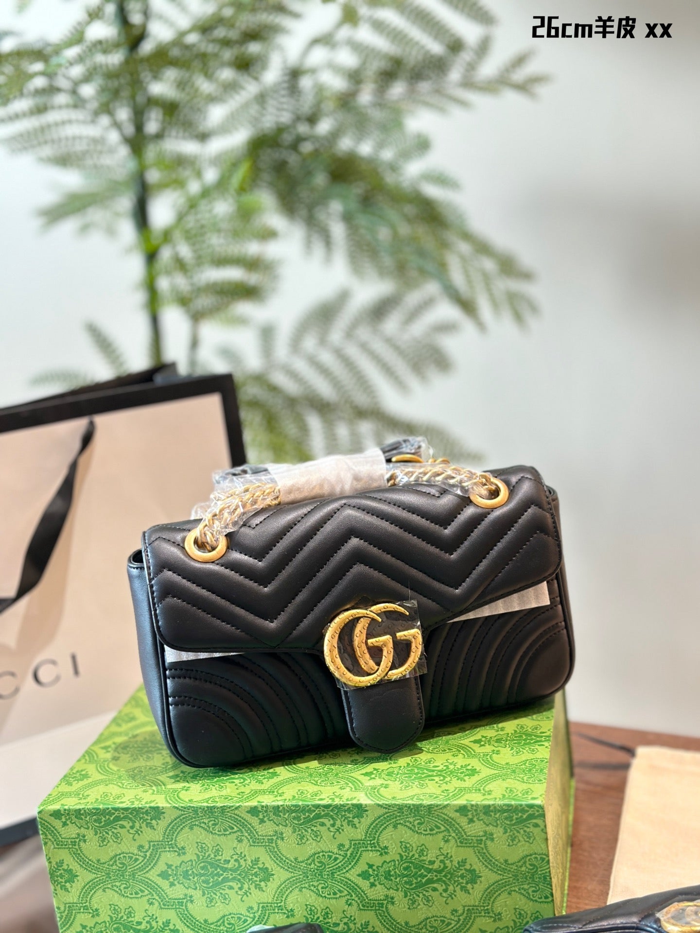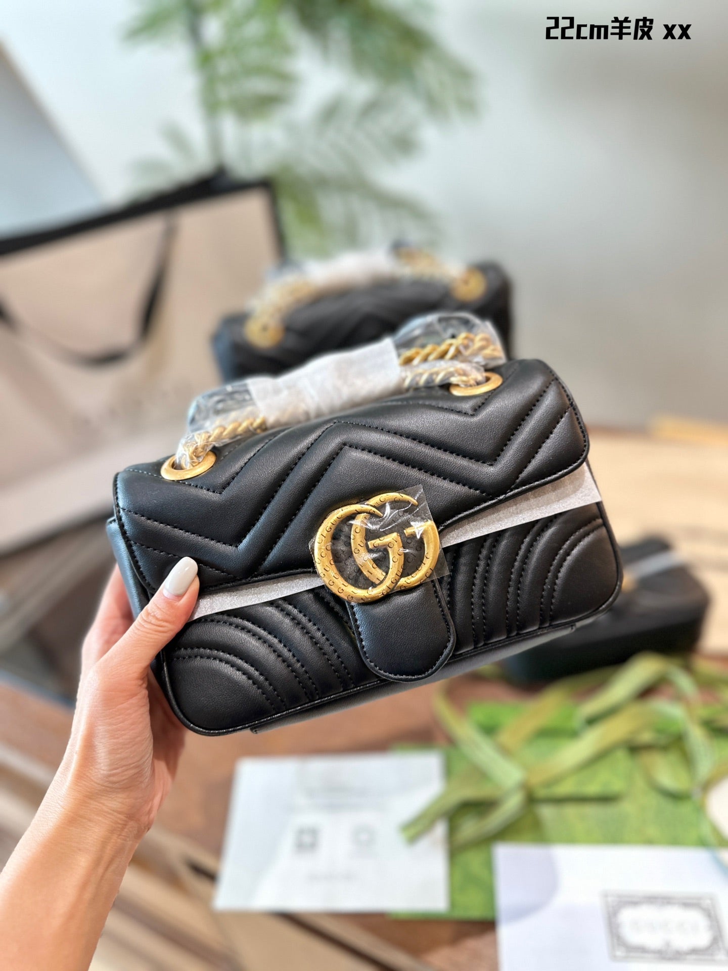 Elevate your style with the Gucci Marmont Classic Chain Bag, a perfect blend of sophistication and versatility. Measuring 22cm x 26cm, this iconic bag features a distinctive gold double G logo and retro distressed hardware, exuding luxury. Crafted from high-quality calfskin, it boasts a shiny finish and remarkable durability.