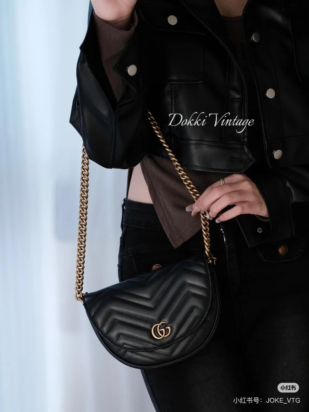 Elevate your style with the Gucci Marmont Semi-Circle Saddle Bag. This chic handbag features a unique semi-circular design that combines modern sophistication with timeless elegance. Crafted from high-quality materials, it showcases the iconic GG logo and exquisite detailing, making it a standout accessory for any outfit. The adjustable strap ensures comfortable wear, whether you carry it over the shoulder or as a crossbody. Perfect for both everyday use and special occasions, this luxury bag effortlessly enhances your wardrobe. Discover the perfect blend of fashion and functionality with the Gucci Marmont Semi-Circle Saddle Bag.