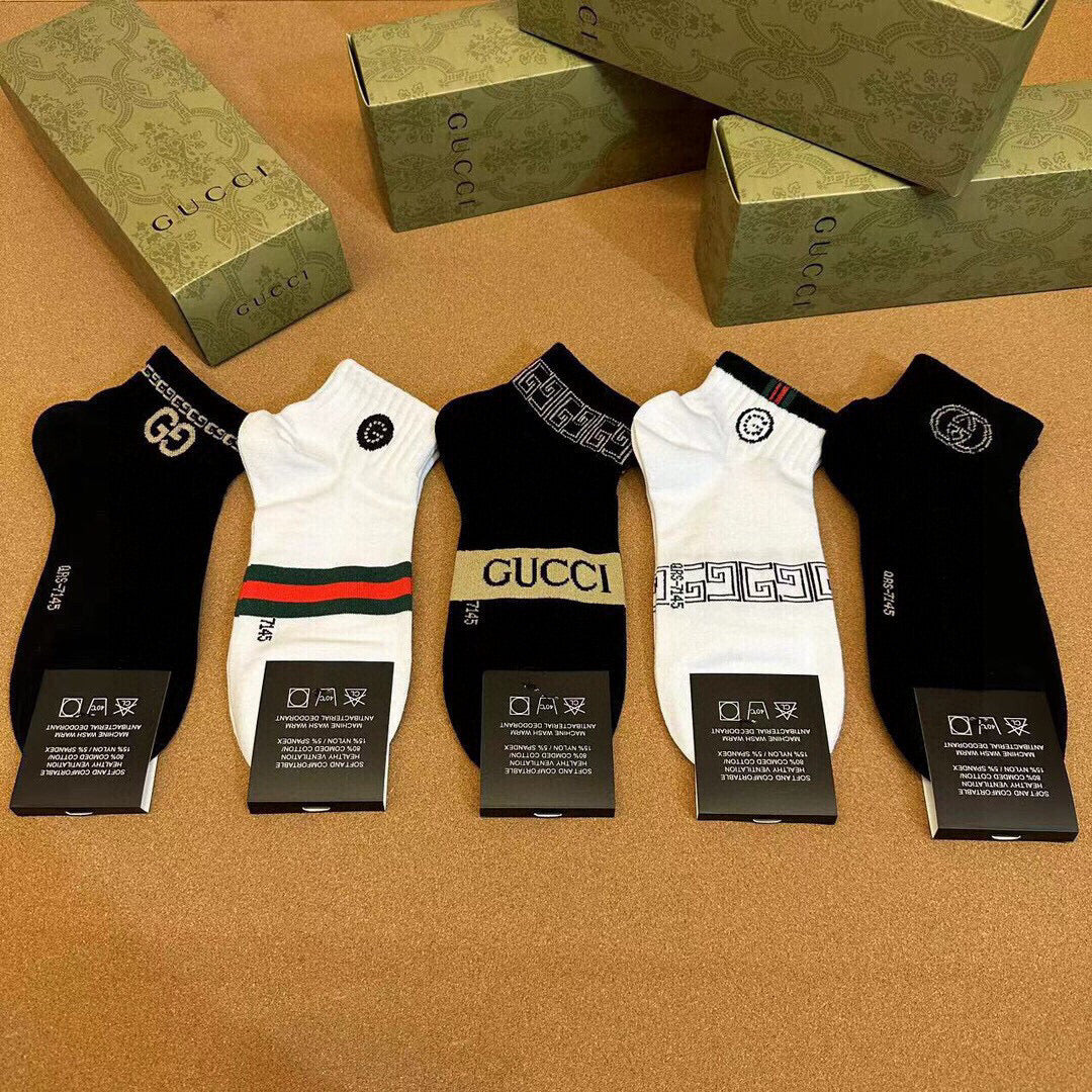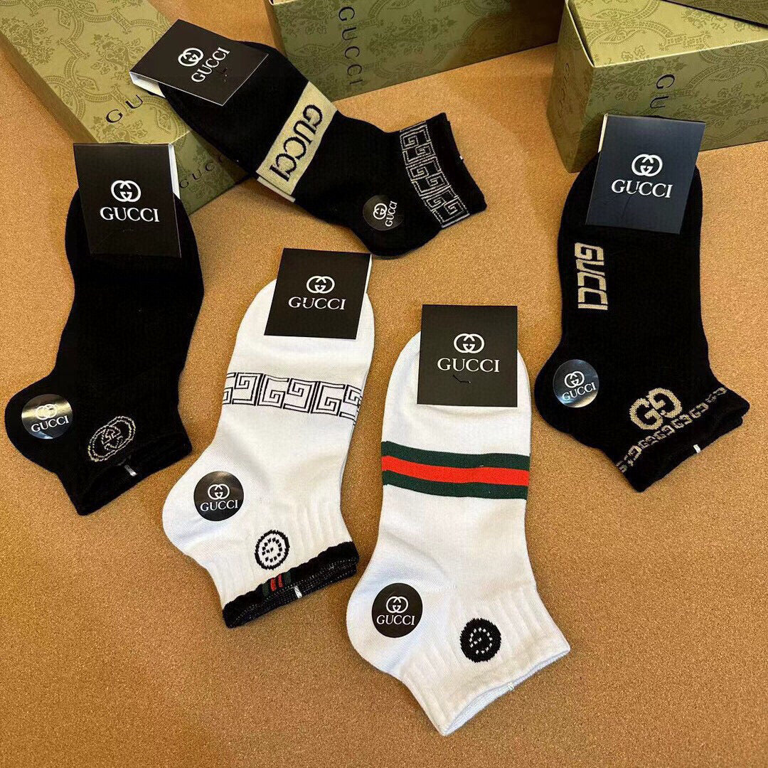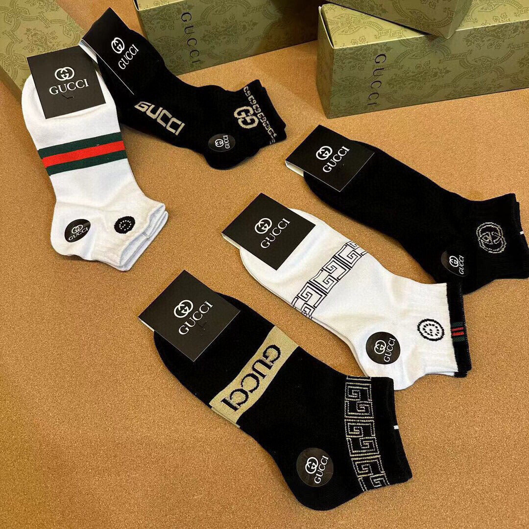 Elevate your wardrobe with the new Gucci men's socks, featuring a classic jacquard logo design. This exclusive set comes with five pairs, all beautifully packaged in a stylish box. Known for their sophistication and comfort, these socks are the perfect accessory for fashion enthusiasts. Effortlessly versatile, they complement any outfit, making them an essential addition to your collection. Discover the luxury of Gucci in every step you take.
