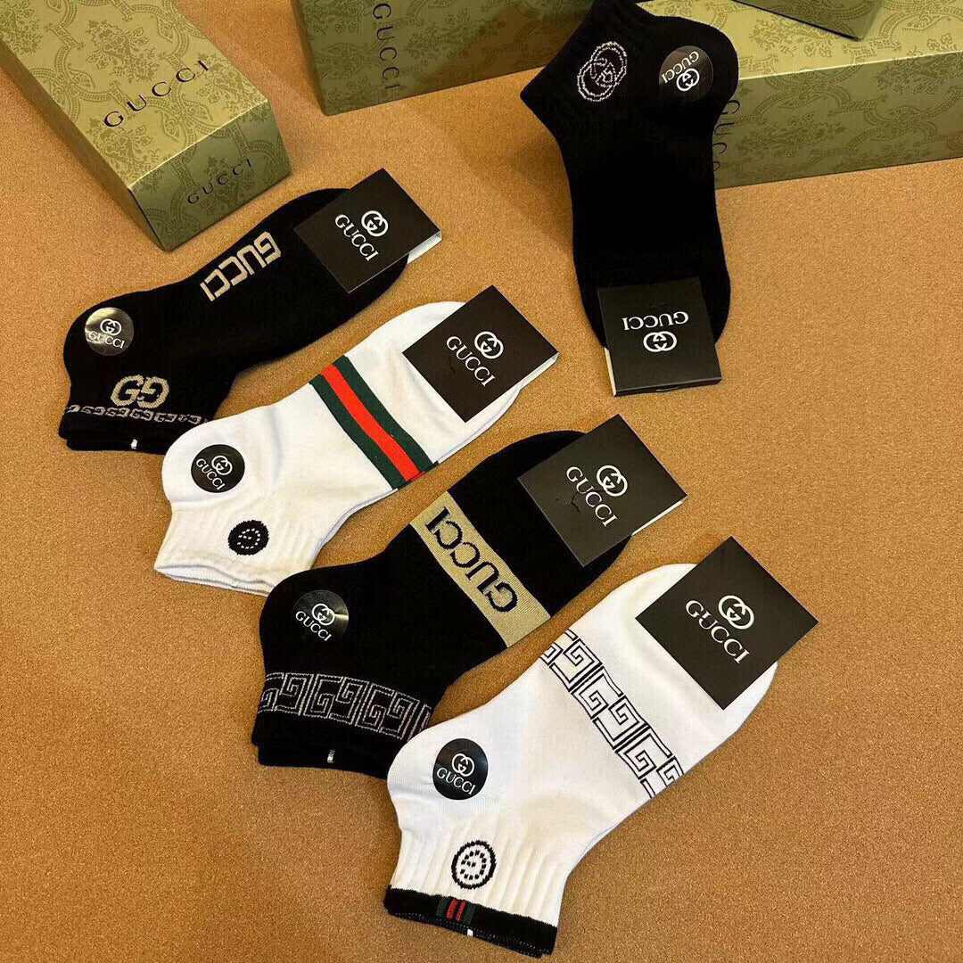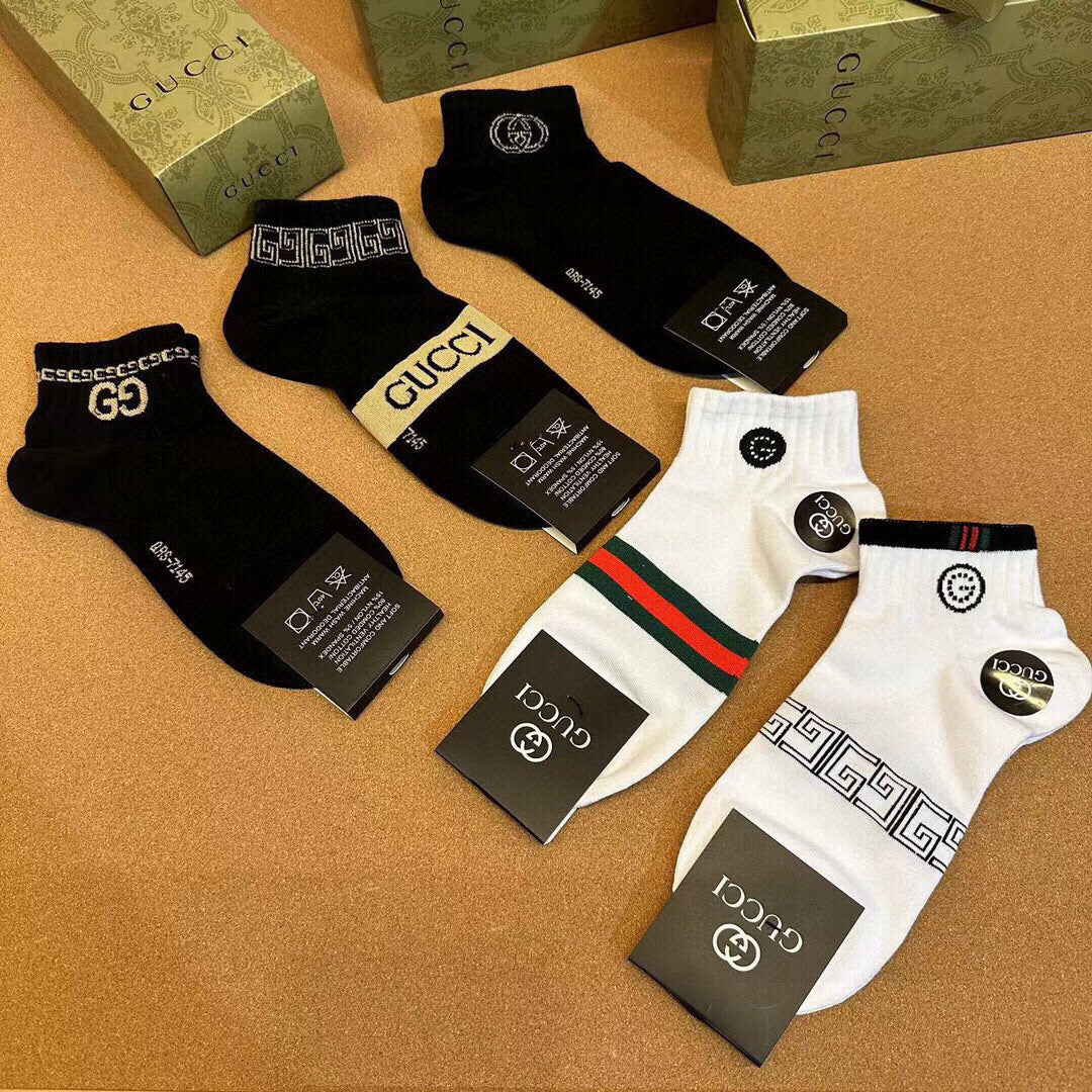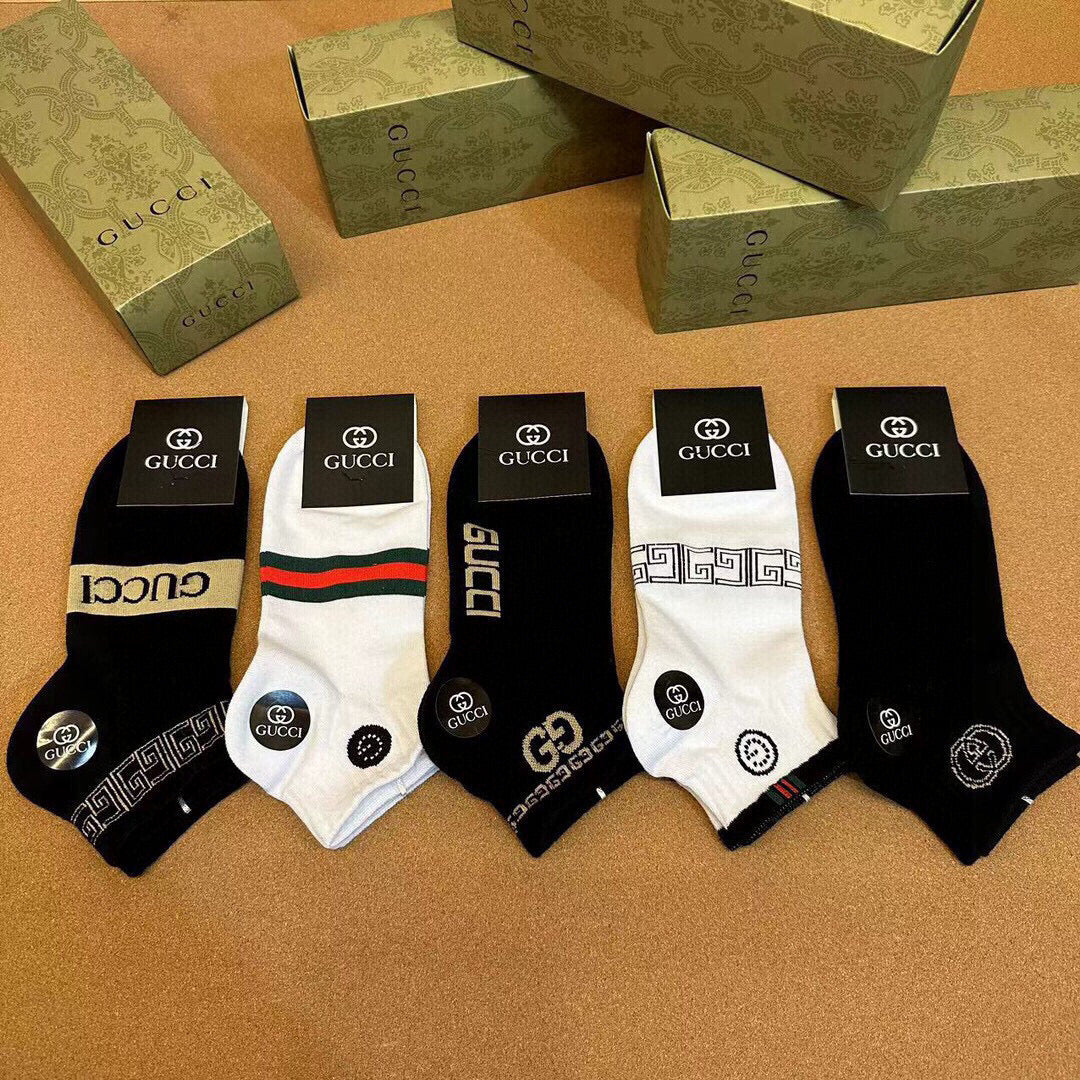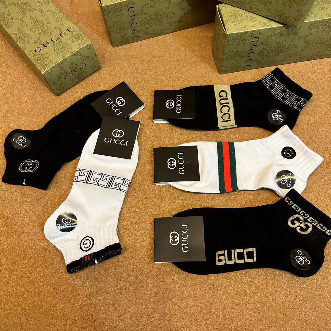 Elevate your wardrobe with the new Gucci men's socks, featuring a classic jacquard logo design. This exclusive set comes with five pairs, all beautifully packaged in a stylish box. Known for their sophistication and comfort, these socks are the perfect accessory for fashion enthusiasts. Effortlessly versatile, they complement any outfit, making them an essential addition to your collection. Discover the luxury of Gucci in every step you take.