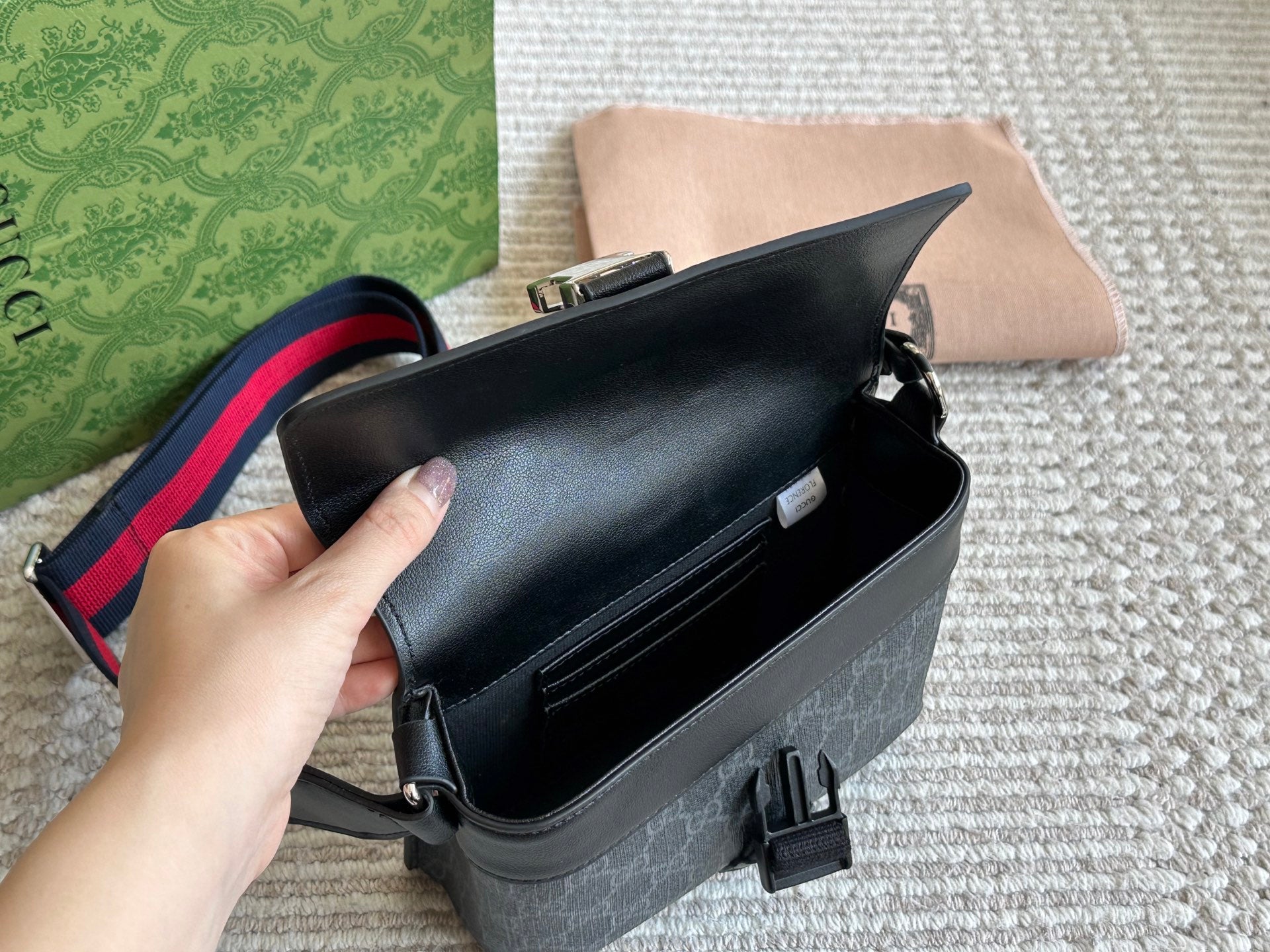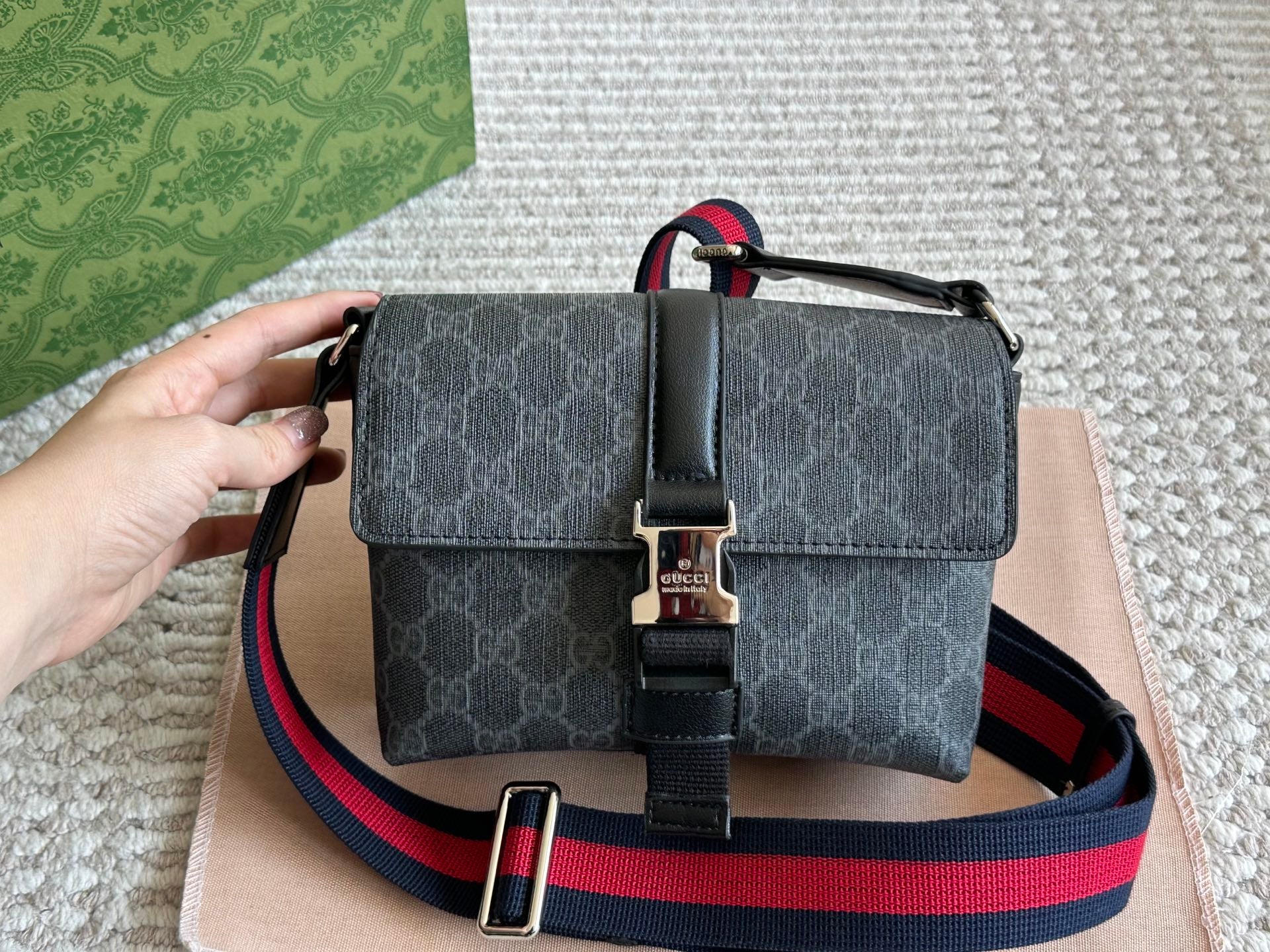 Elevate your style with the Gucci Men's Crossbody Bag, featuring a sleek design and practical functionality. This one-shoulder bag is crafted for durability and resistance to wear, making it an excellent companion for everyday use. Its versatile design allows for effortless pairing with any outfit, whether you're heading to work or enjoying a casual day out. Embrace convenience and sophistication with this essential accessory. Box size: 20 x 15 cm.
