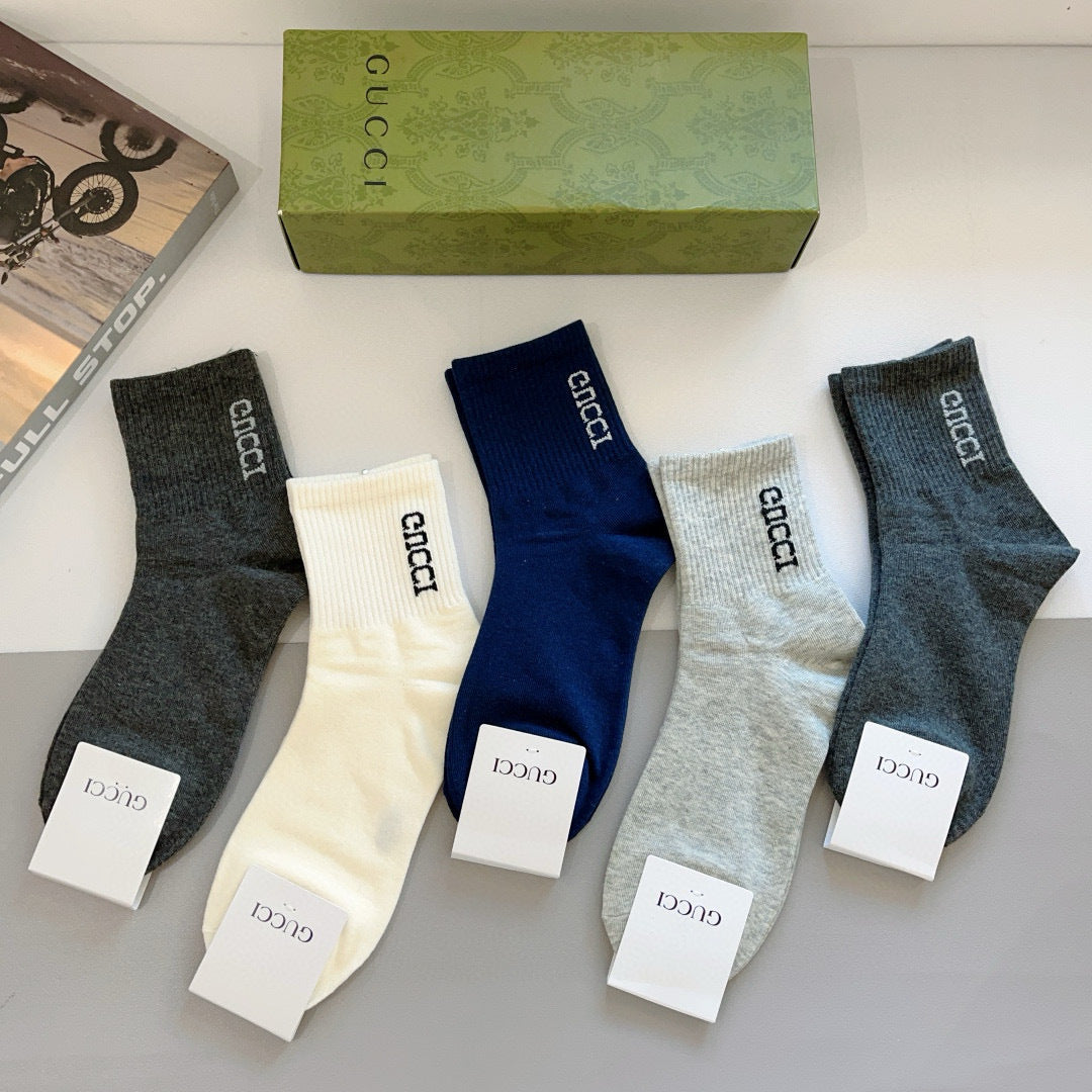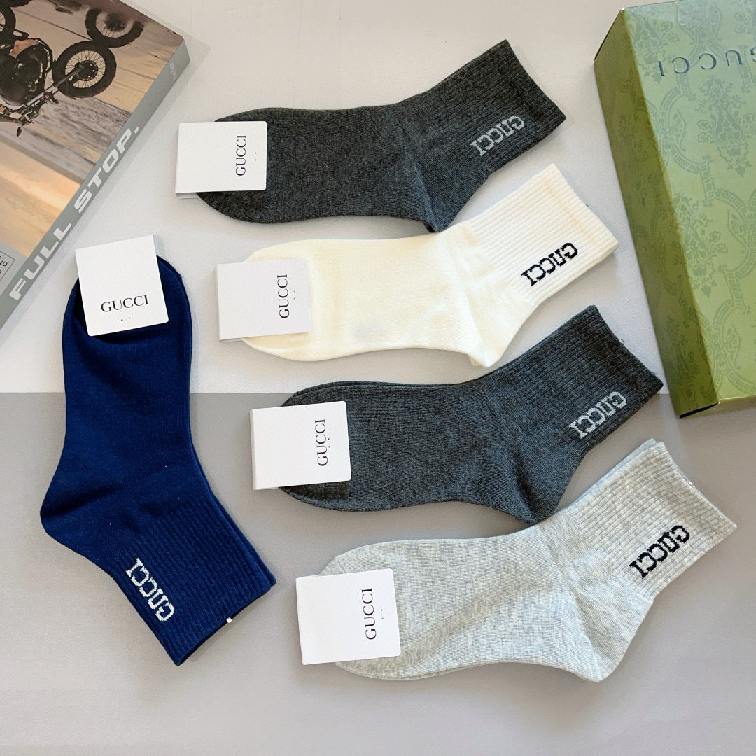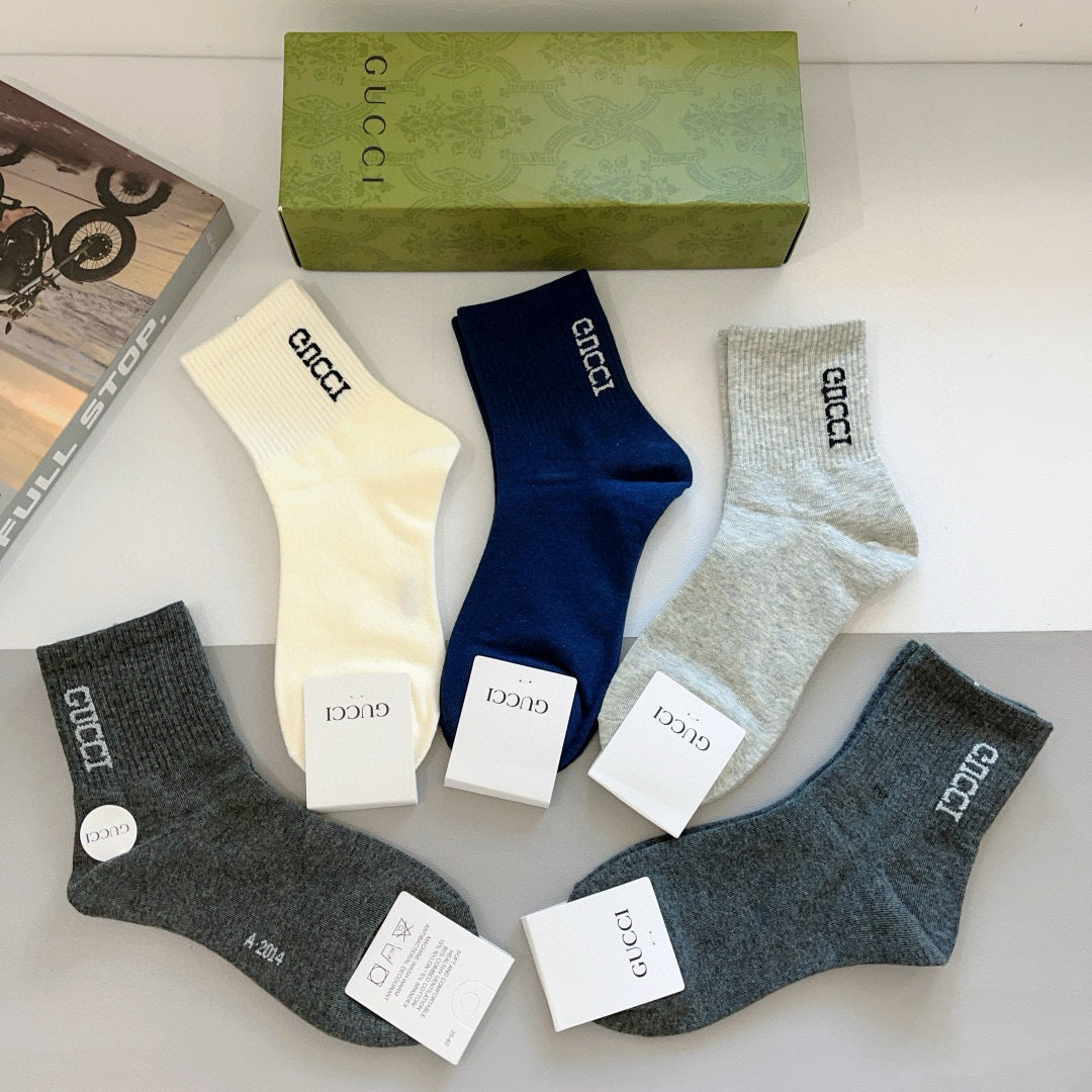 Elevate your wardrobe with GUCCI's new mid-calf socks, crafted from pure cotton for comfort and durability. Each box includes five stylish pairs, featuring trendy patterns that are perfect for the fashion-forward individual. These synchronized socks are easy to pair with any outfit, making them a must-have accessory for style enthusiasts. Step out in confidence and showcase your love for big brands with these chic socks! Perfect for both casual and dressy occasions.