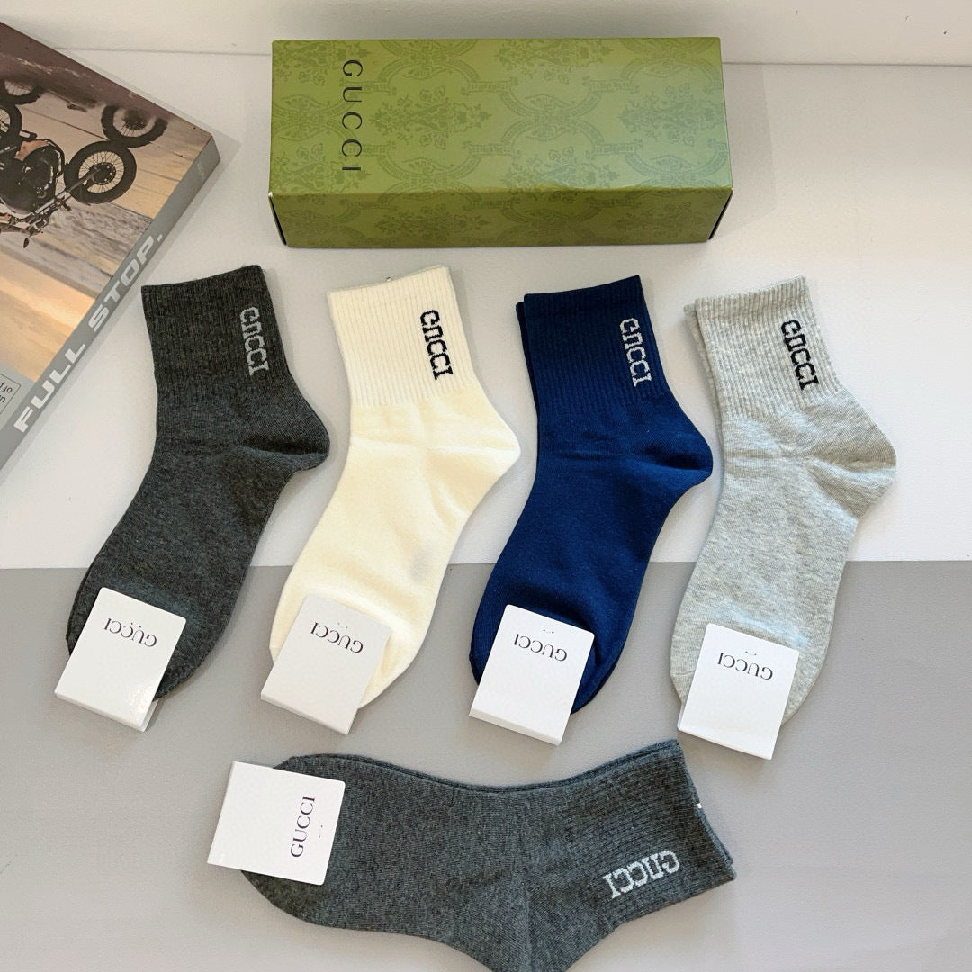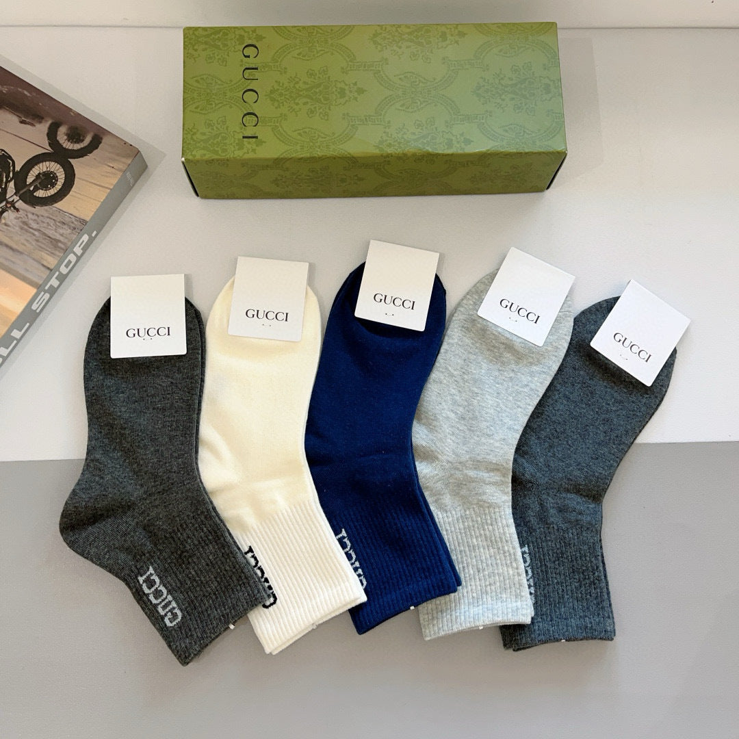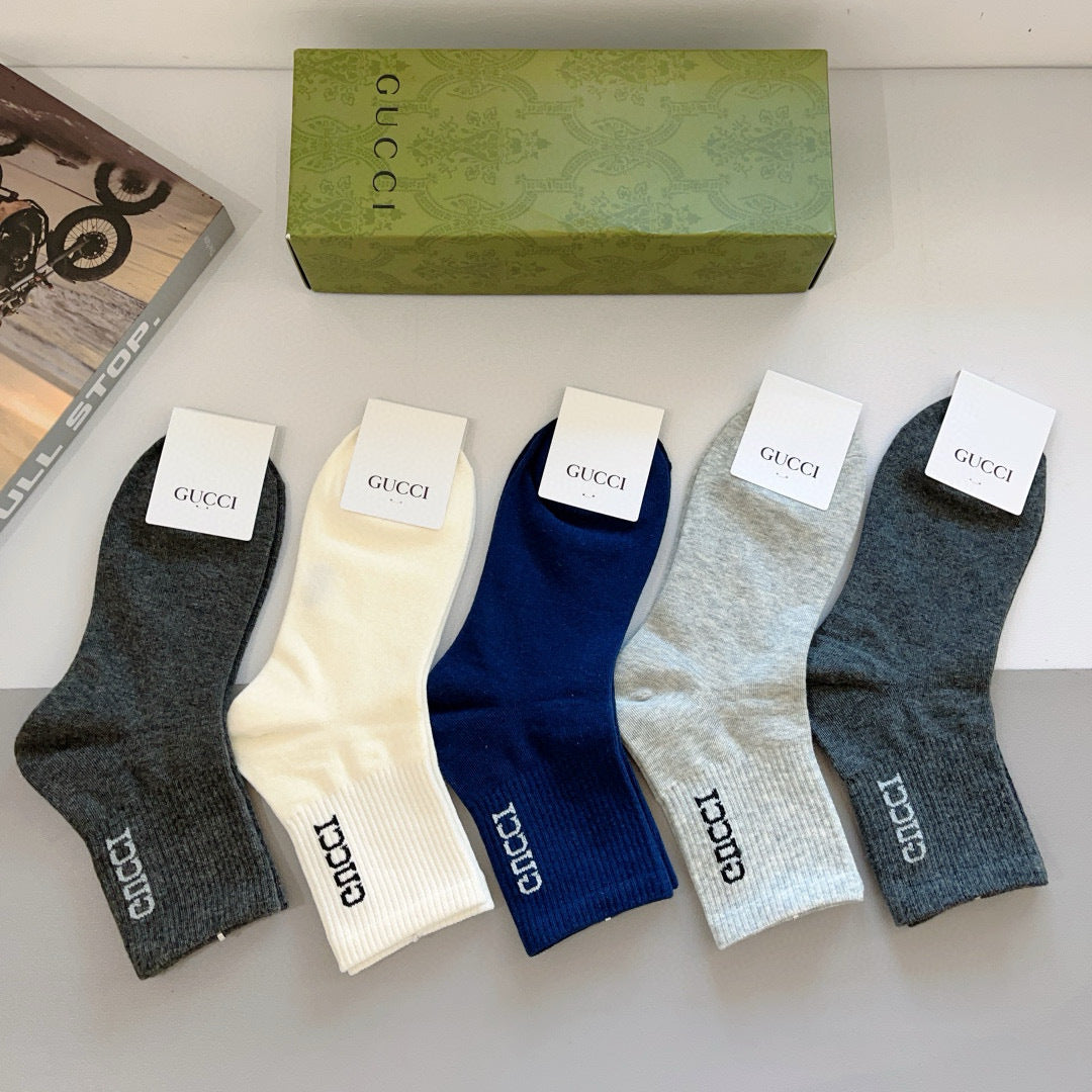 Elevate your wardrobe with GUCCI's new mid-calf socks, crafted from pure cotton for comfort and durability. Each box includes five stylish pairs, featuring trendy patterns that are perfect for the fashion-forward individual. These synchronized socks are easy to pair with any outfit, making them a must-have accessory for style enthusiasts. Step out in confidence and showcase your love for big brands with these chic socks! Perfect for both casual and dressy occasions.
