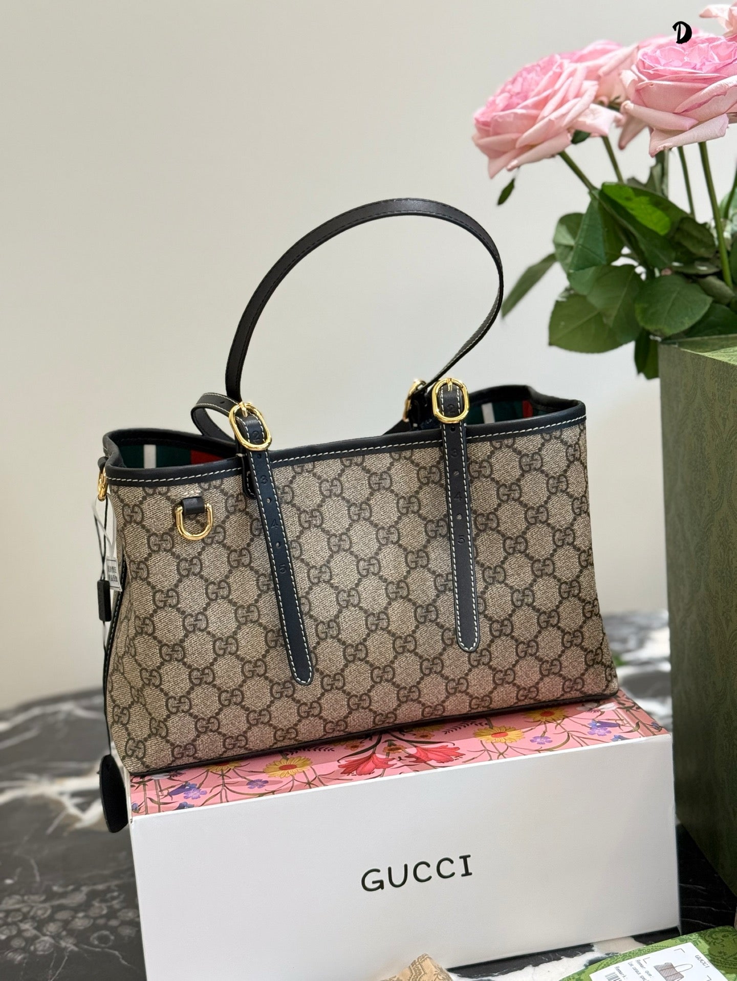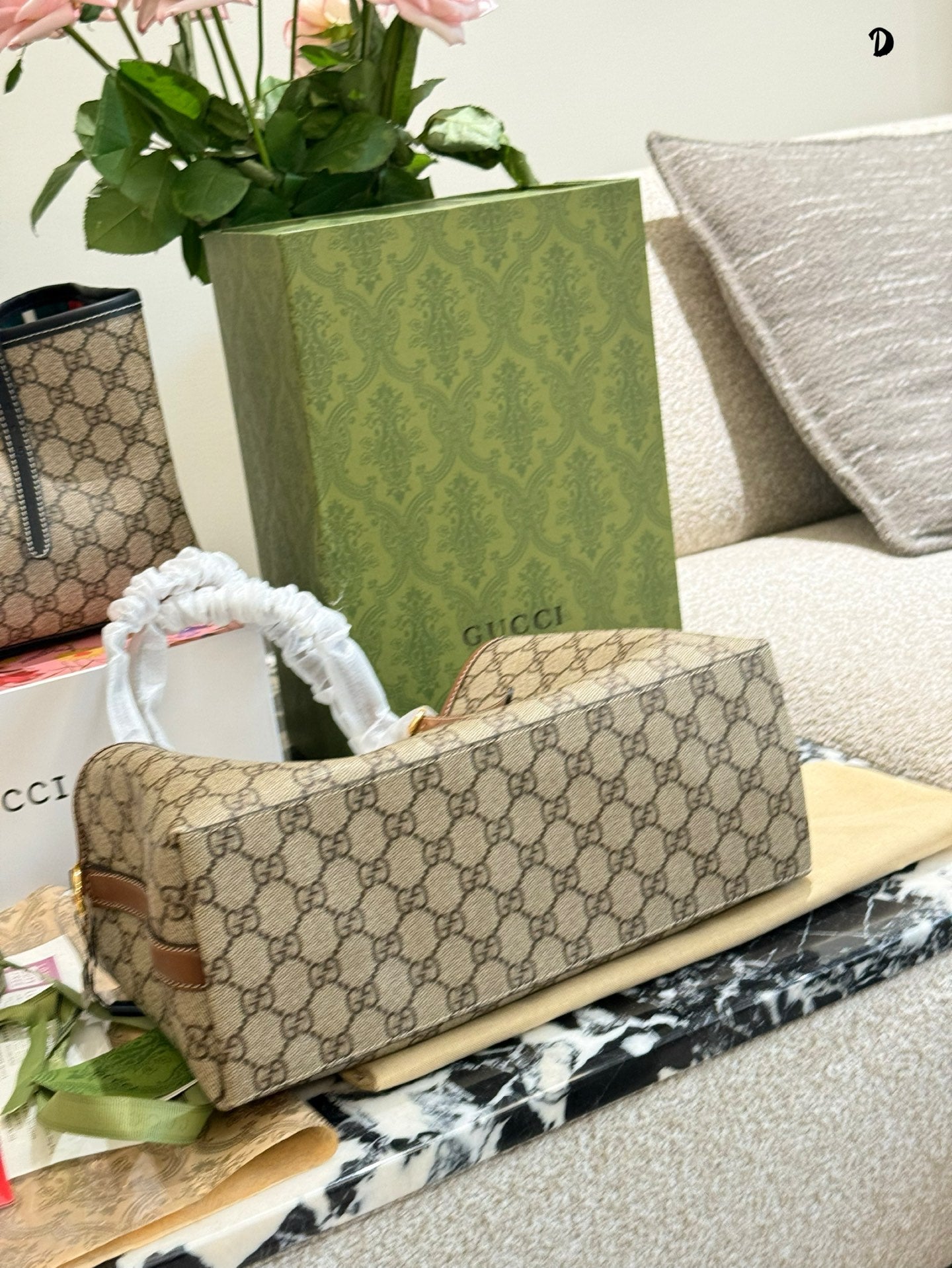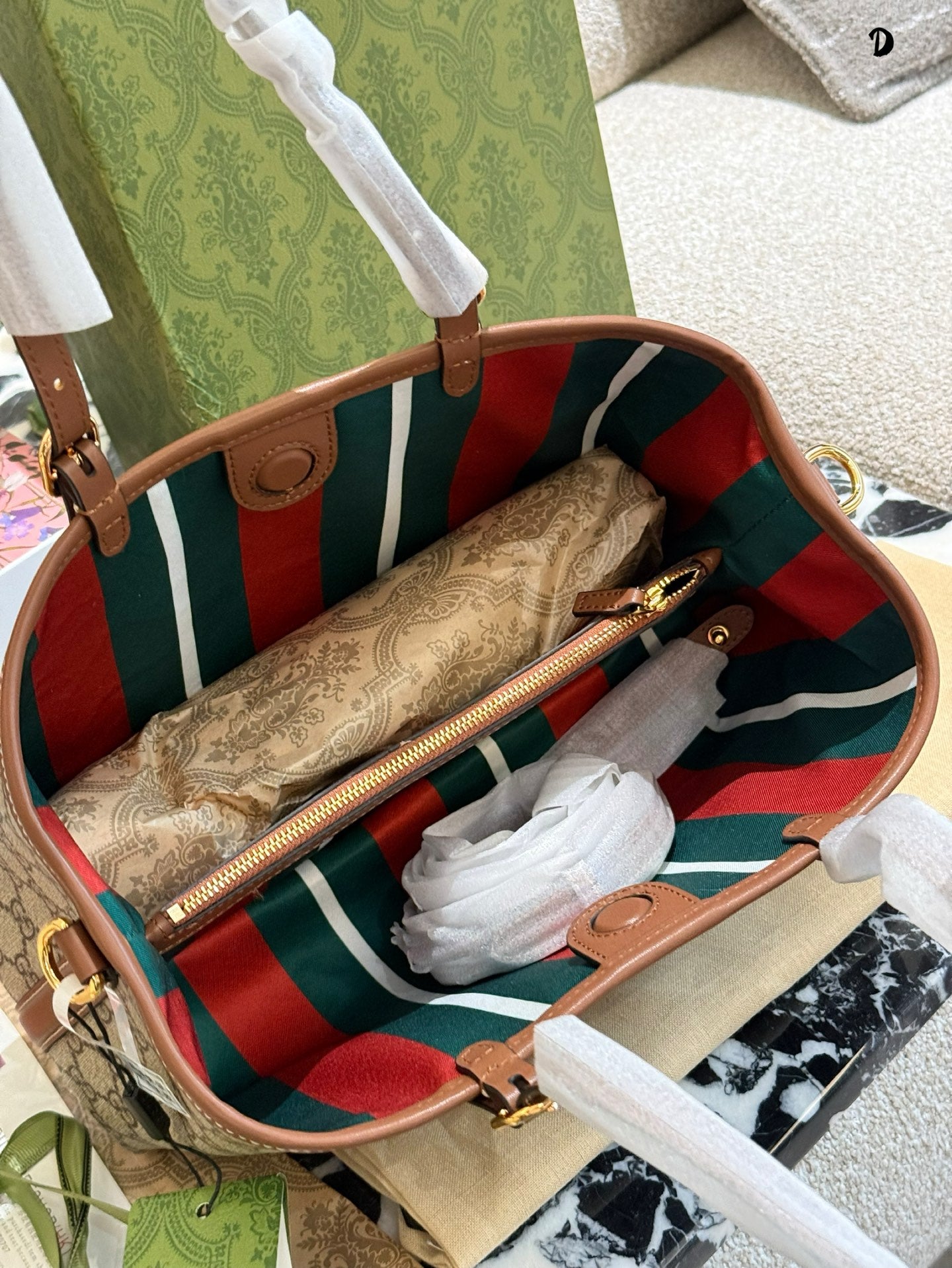 Discover the elegance of the Gucci Ophidia Tote Bag, featuring the iconic GG pattern and distinctive striped webbing. This stylish shopping bag seamlessly blends classic design with contemporary flair. Its spacious dimensions (31 x 18 x 11 cm) and included box make it a perfect choice for both everyday use and special occasions. Elevate your accessory collection with this timeless piece from the evolving Ophidia line.