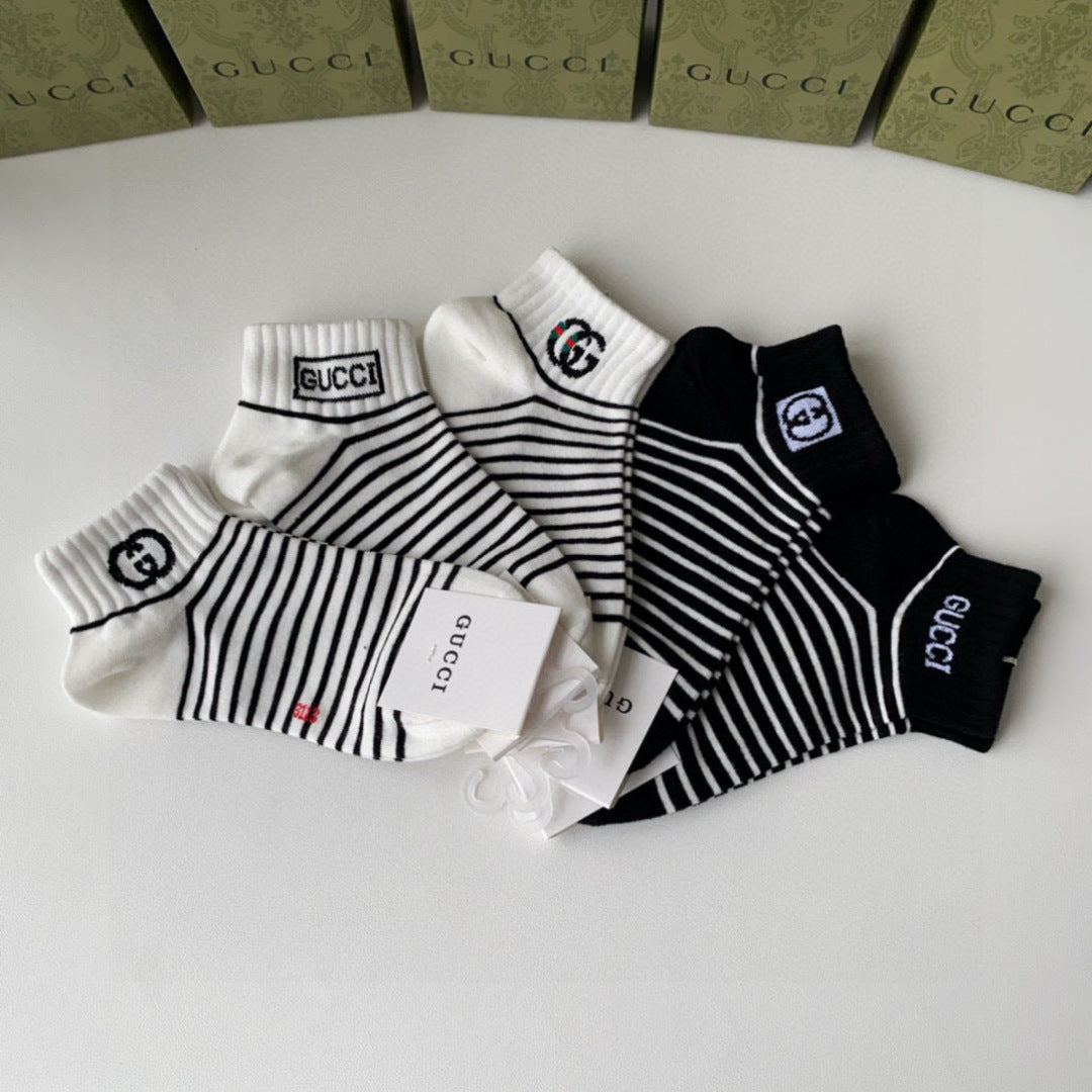 Elevate your footwear collection with Gucci's new short and medium style pile socks. This set includes five pairs, beautifully packaged and perfect for display. These versatile tube socks are a must-have for fashion enthusiasts, making it easy to complement any outfit. Discover the blend of luxury and practicality with Gucci – your new go-to for stylish, everyday wear.
