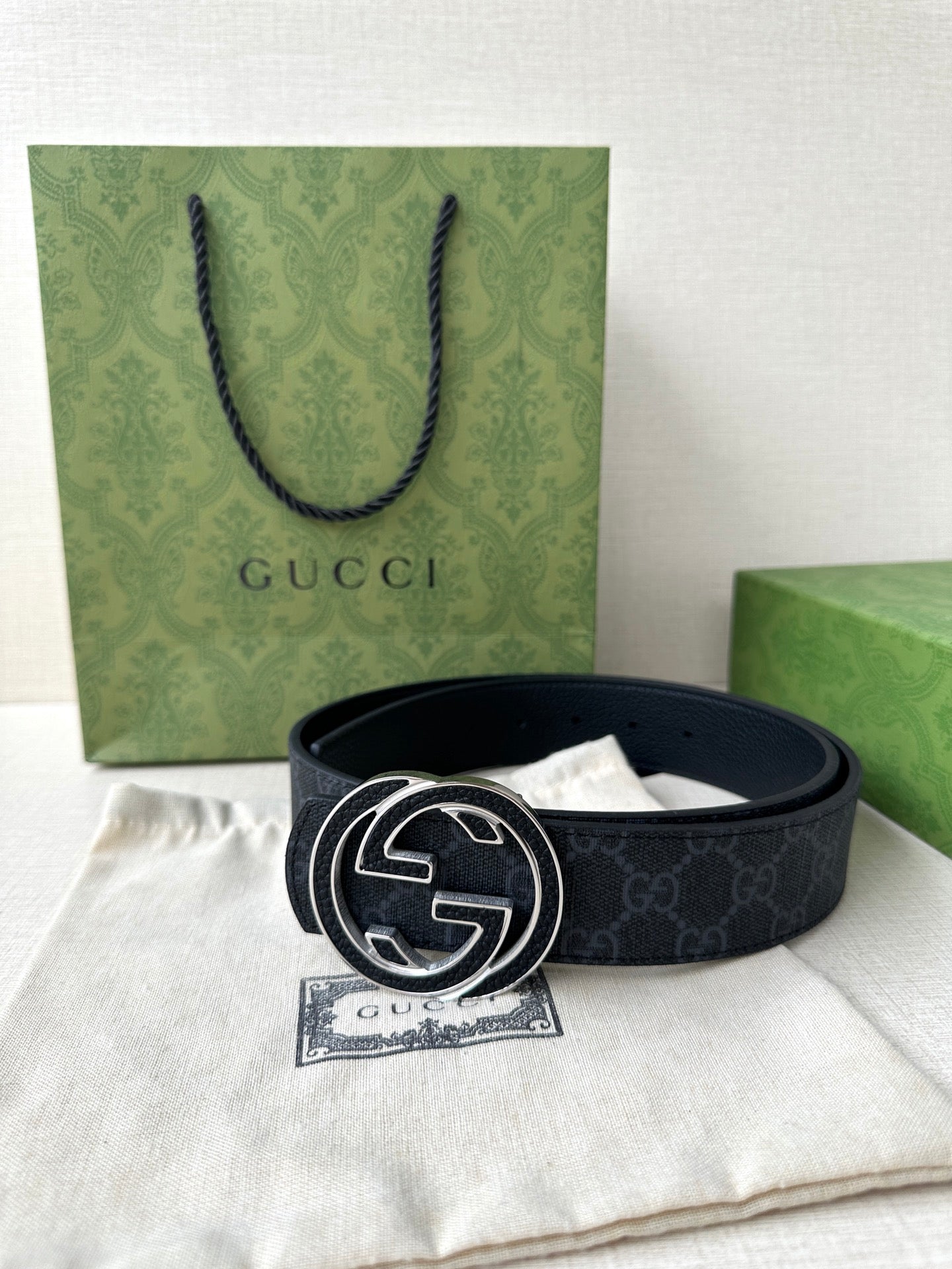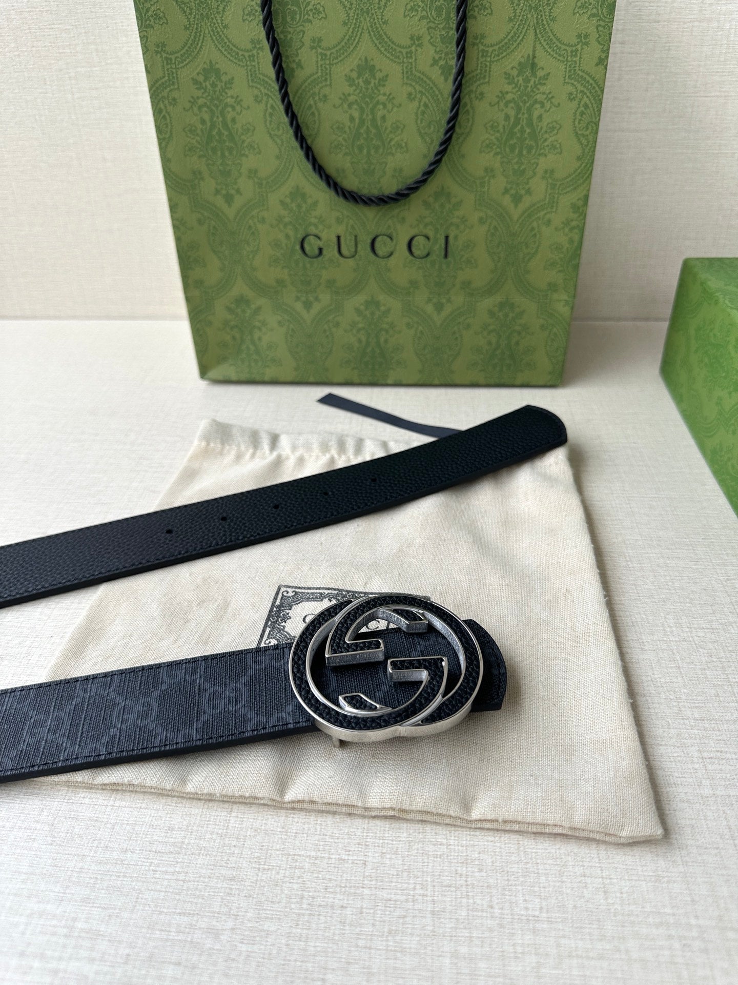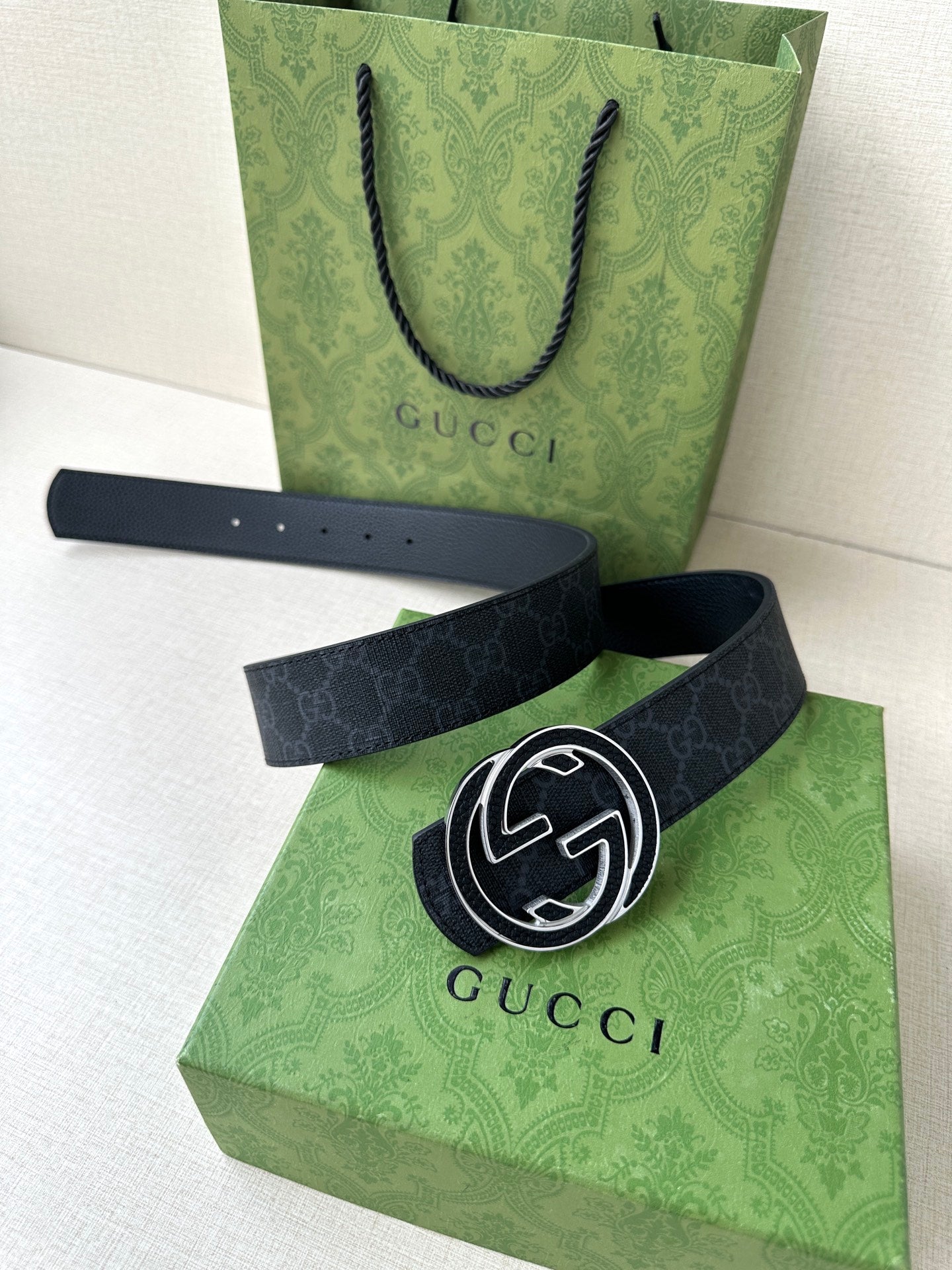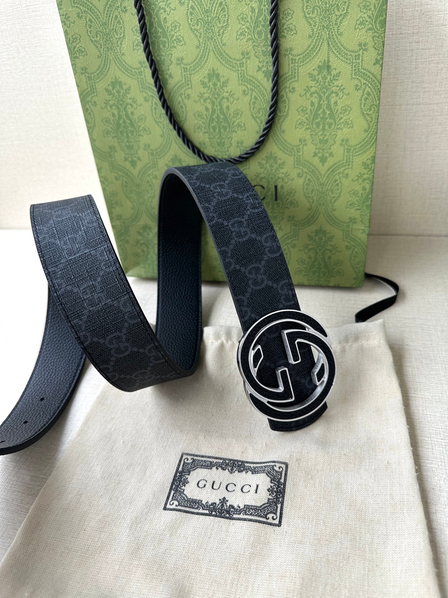 Discover the essence of modern elegance with Gucci's 4.0cm width early spring series belt. Expertly crafted from premium cow leather, this luxurious accessory features a striking interlocking Double G buckle that showcases the brand's iconic heritage. With a sophisticated gray leather front and a versatile black leather back, this reversible belt offers a stylish solution for any occasion. Elevate your wardrobe with this timeless piece that combines classic design with contemporary flair.