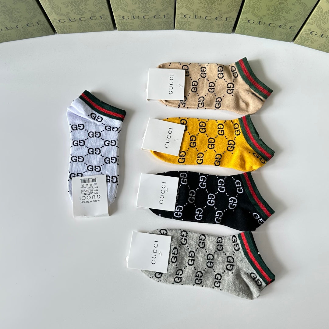Elevate your sock collection with our exclusive Gucci Short and Medium Pile Socks, featuring a stylish counter display. This set includes five pairs of versatile tube socks, perfect for any fashion-forward wardrobe. Effortlessly paired with a variety of outfits, these socks combine comfort with chic design. A must-have for fashionistas and an excellent gift choice!