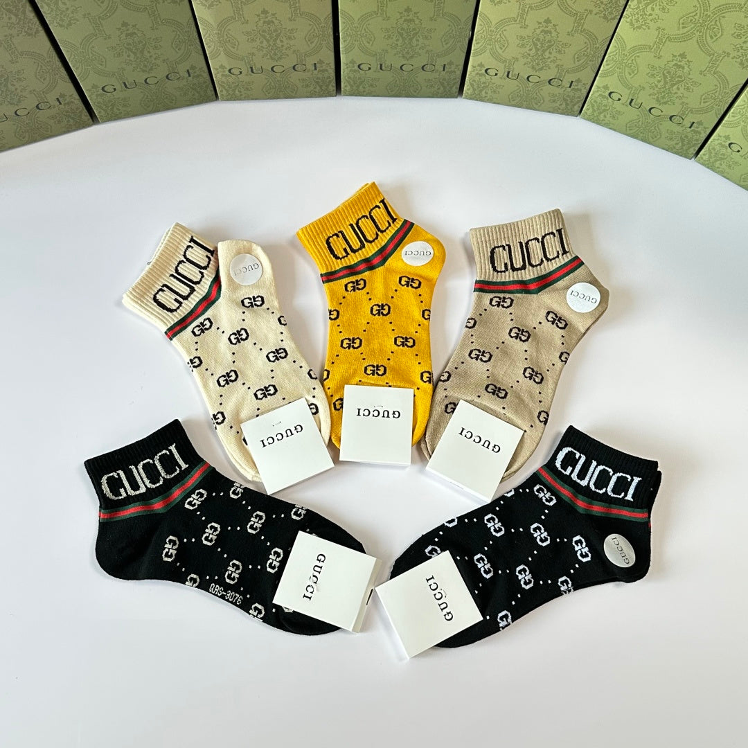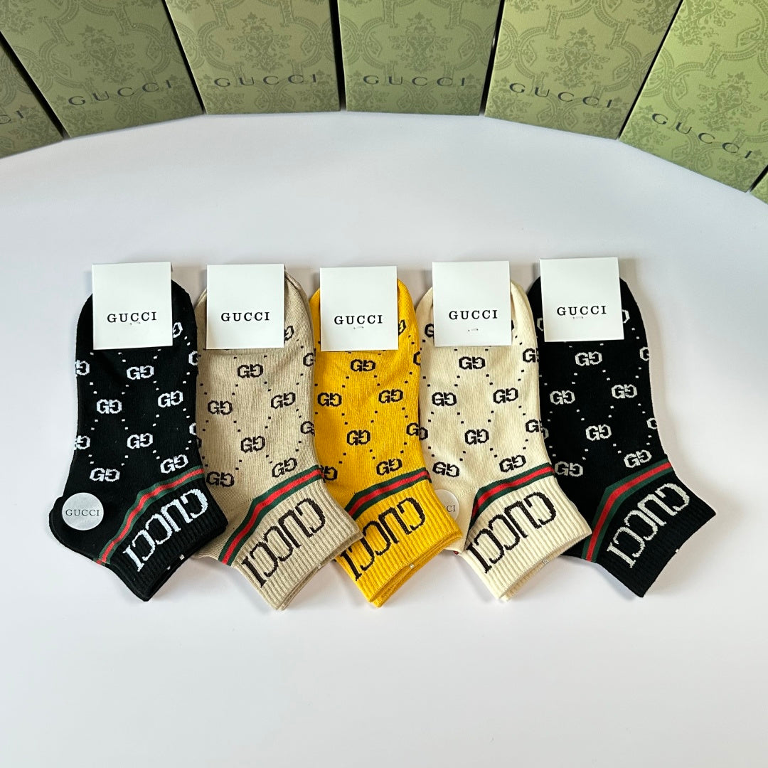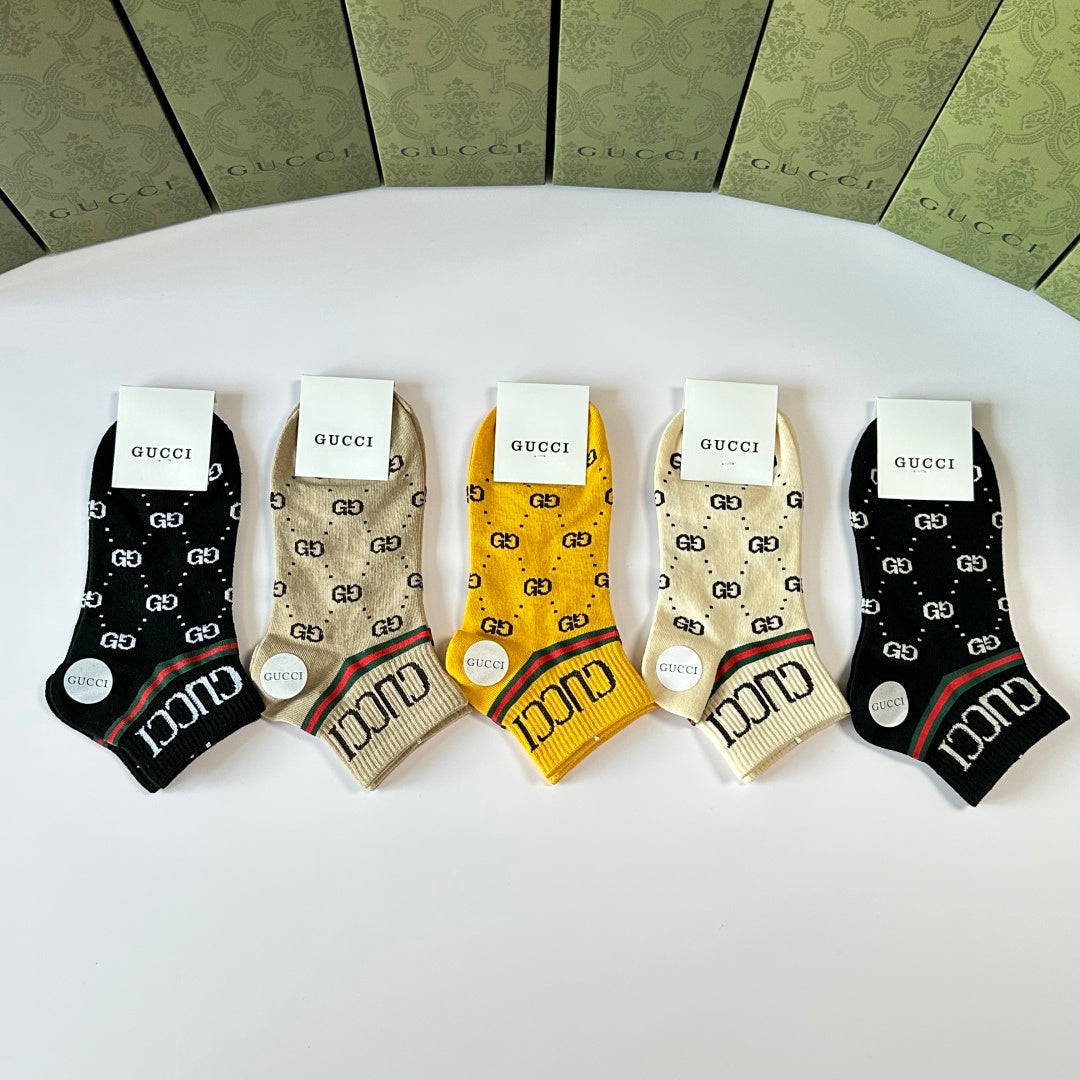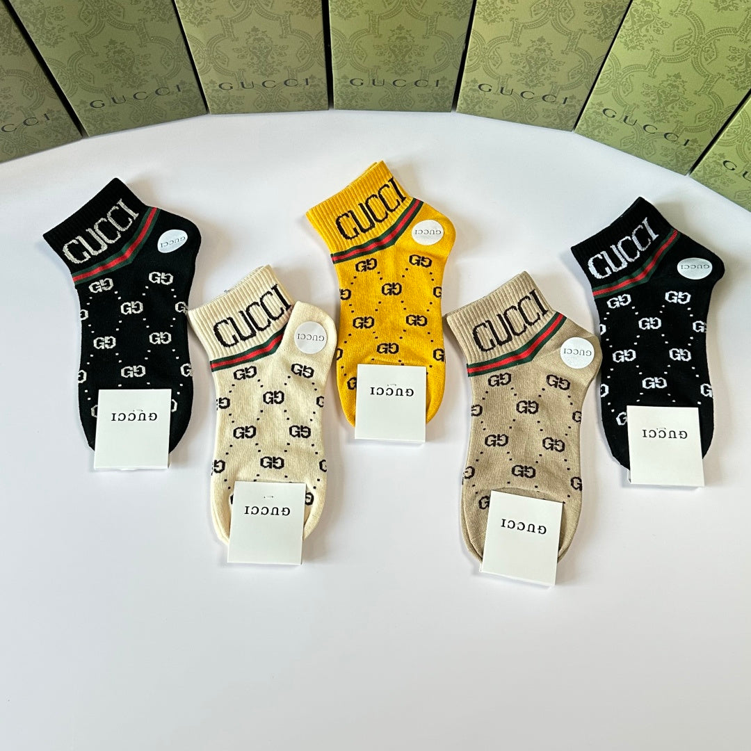 Elevate your sock game with Gucci's stylish short and medium style pile socks. This curated five-pair set comes in an elegant counter display, making it the perfect addition to any fashionista's collection. Versatile and easy to match, these trendy tube socks effortlessly complement a variety of outfits. Experience comfort and luxury with these must-have designer accessories.