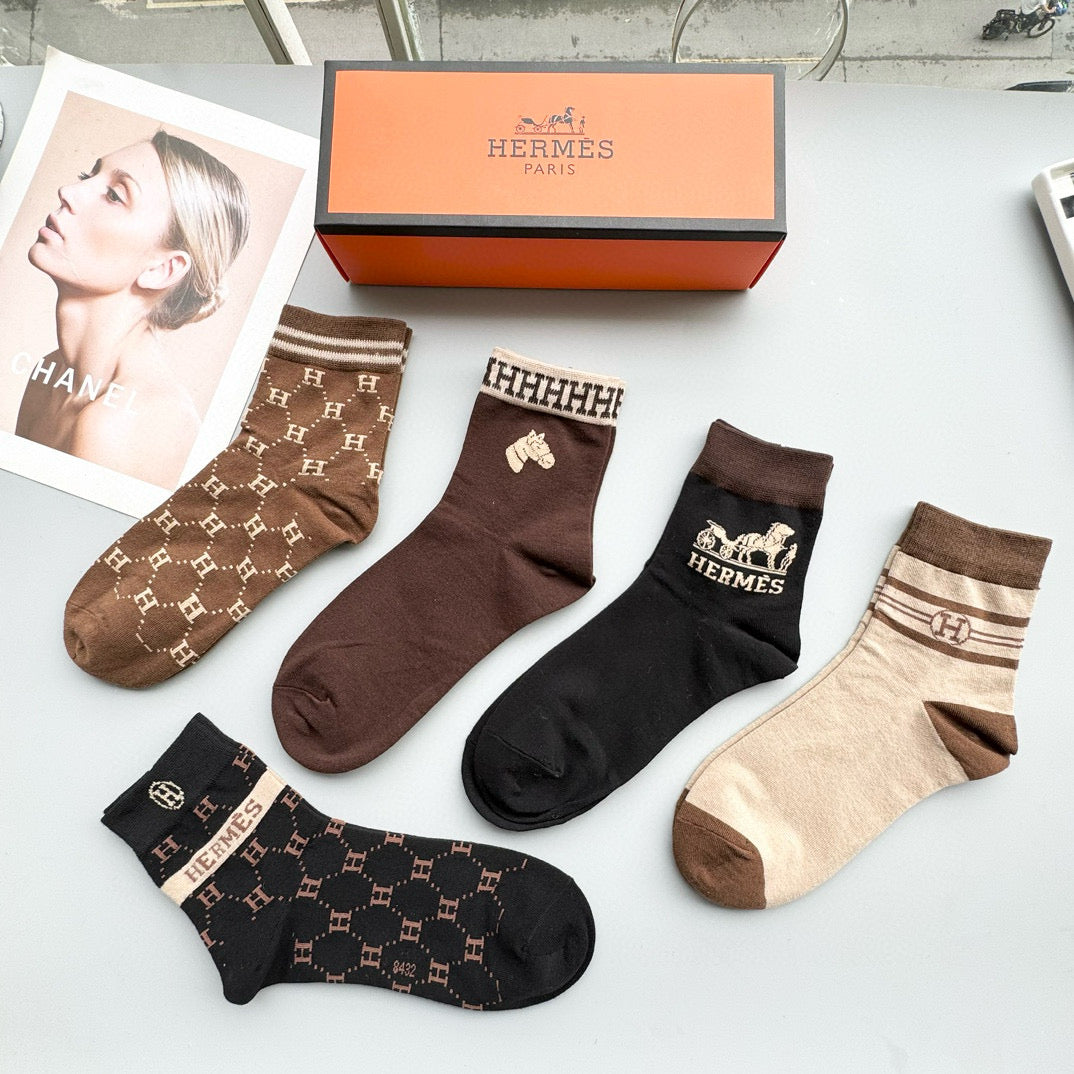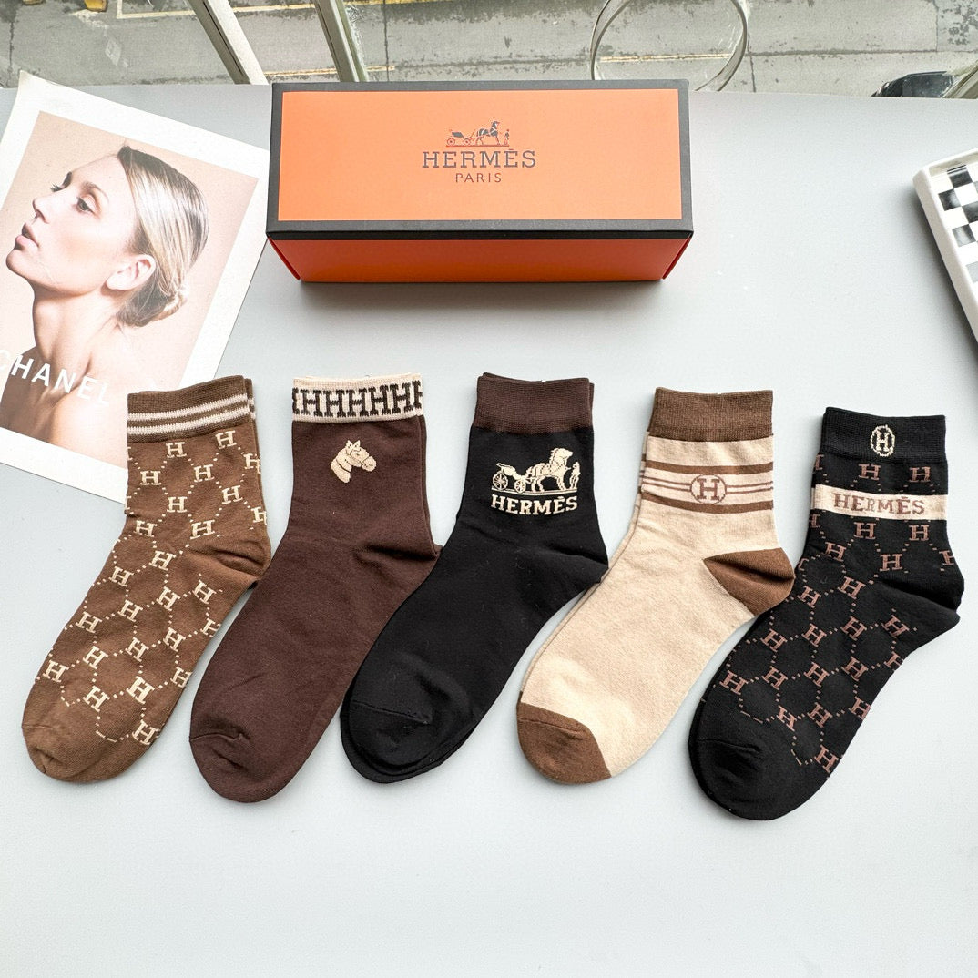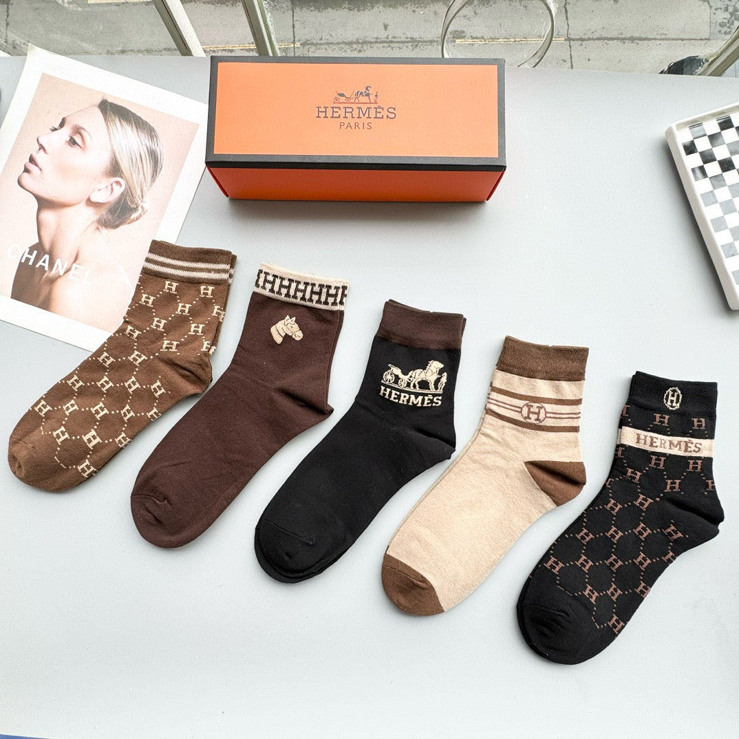 Hermès Classic Mid-Calf Socks - Pure Cotton, Embroidered Logo, 5 Pairs
