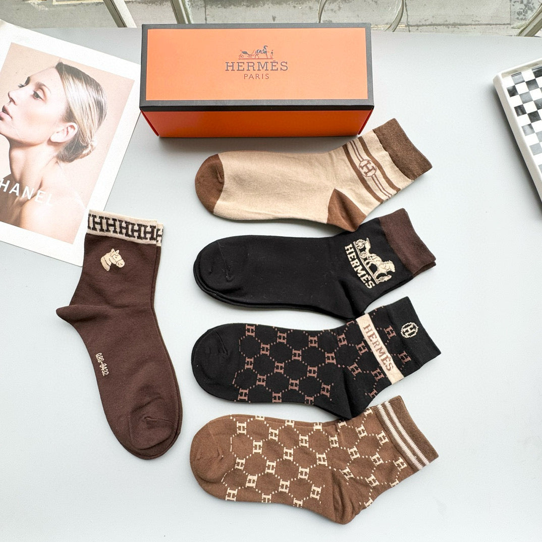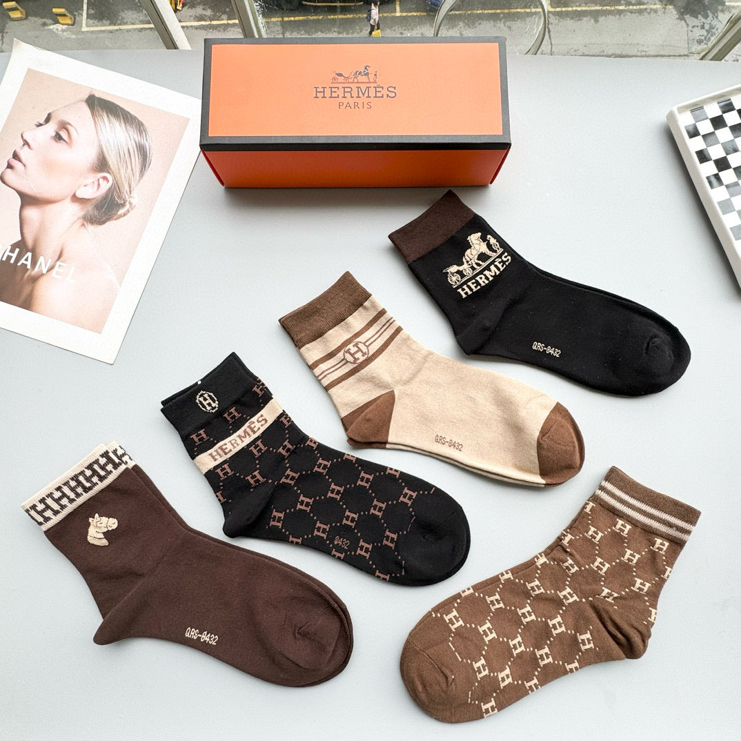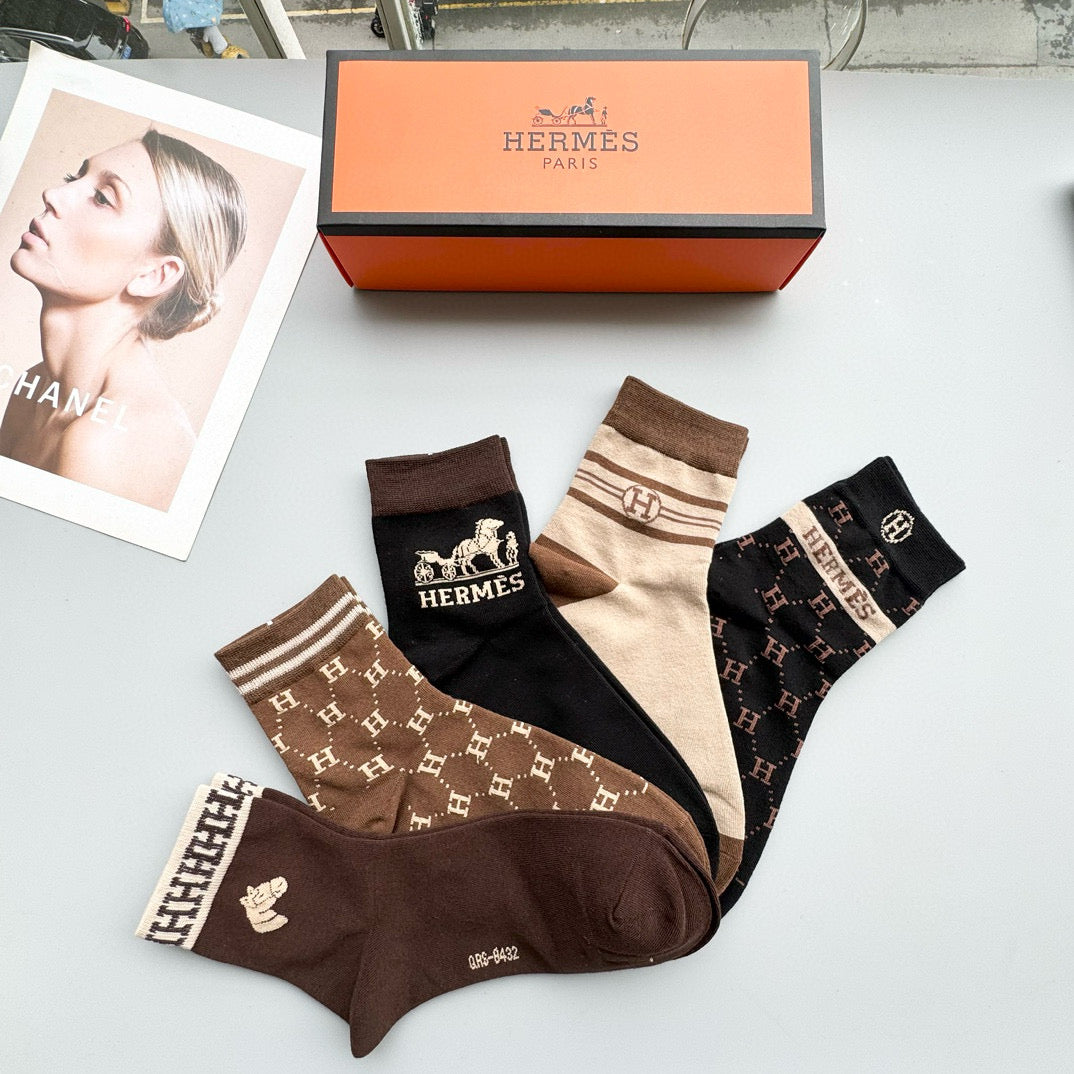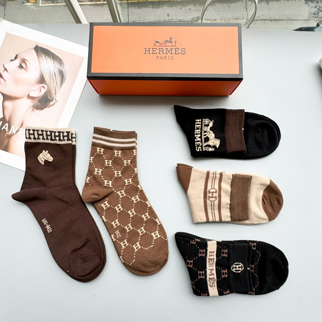 Hermès Classic Mid-Calf Socks - Pure Cotton, Embroidered Logo, 5 Pairs