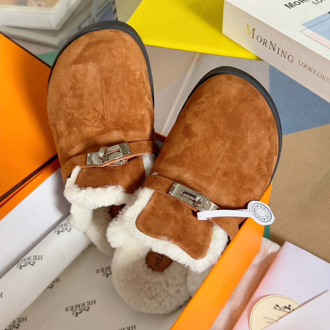Perfectly packaged for a delightful unboxing experience, these mules combine fashion and practicality effortlessly. Upgrade your style with the Hermès Kelly Buckle Teddy Mules today! ðŸ›ðŸ“¦