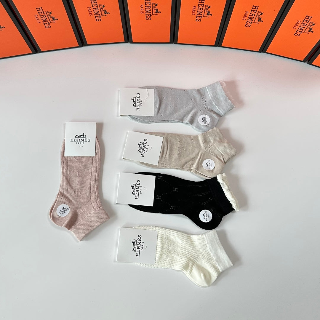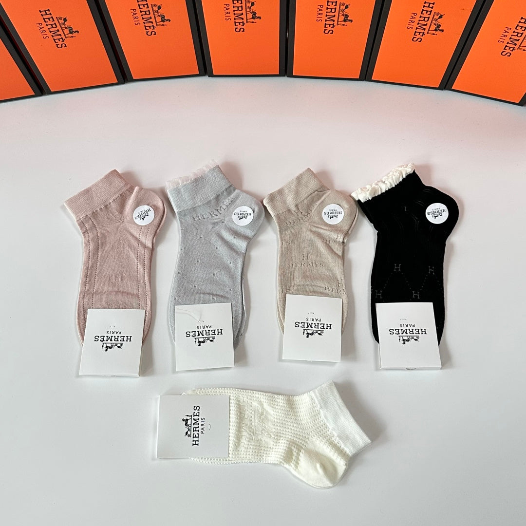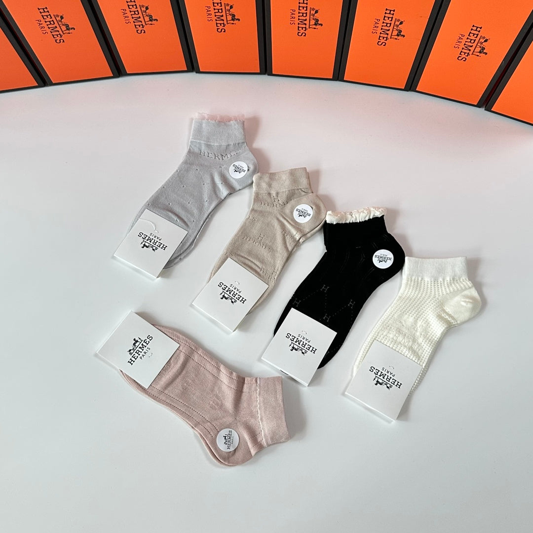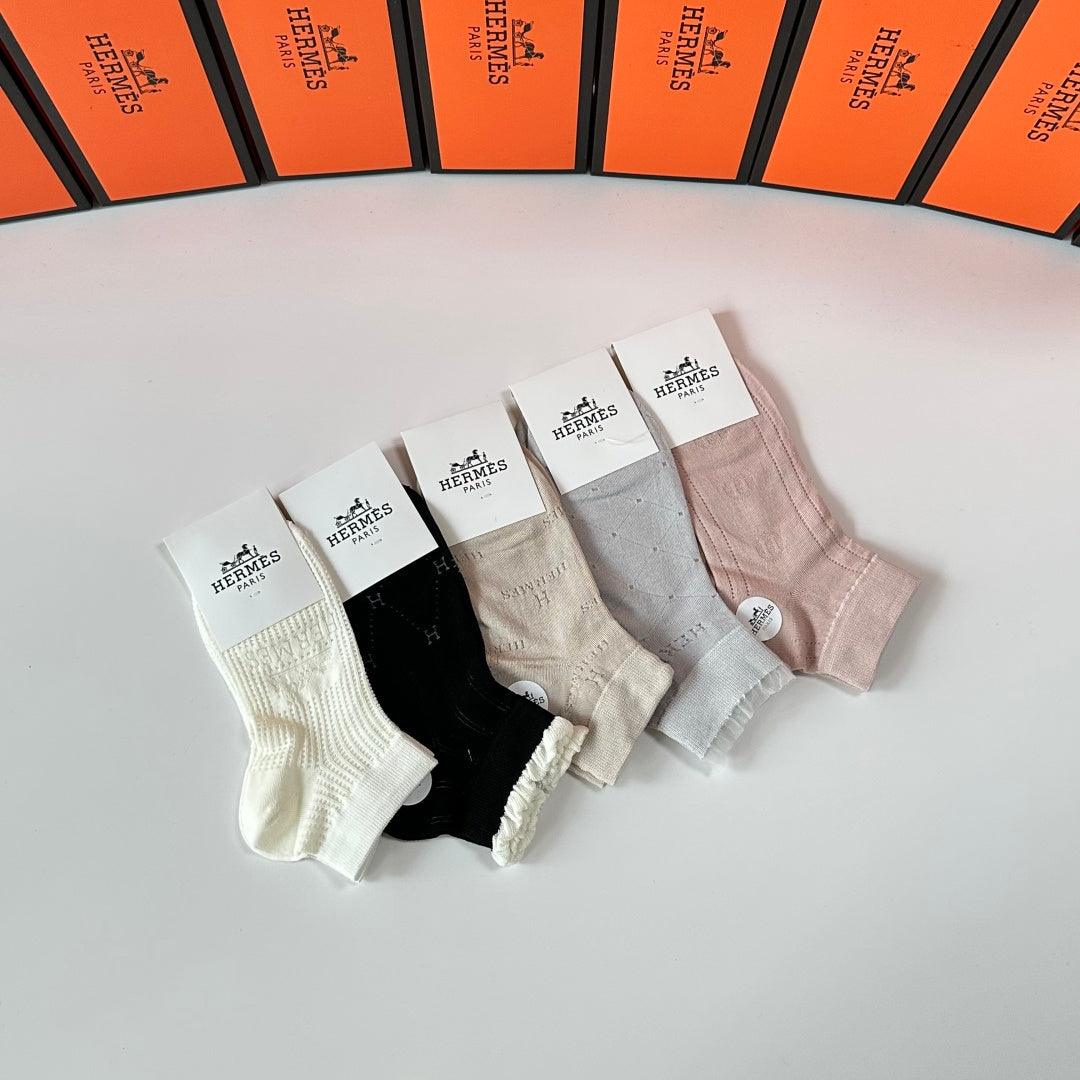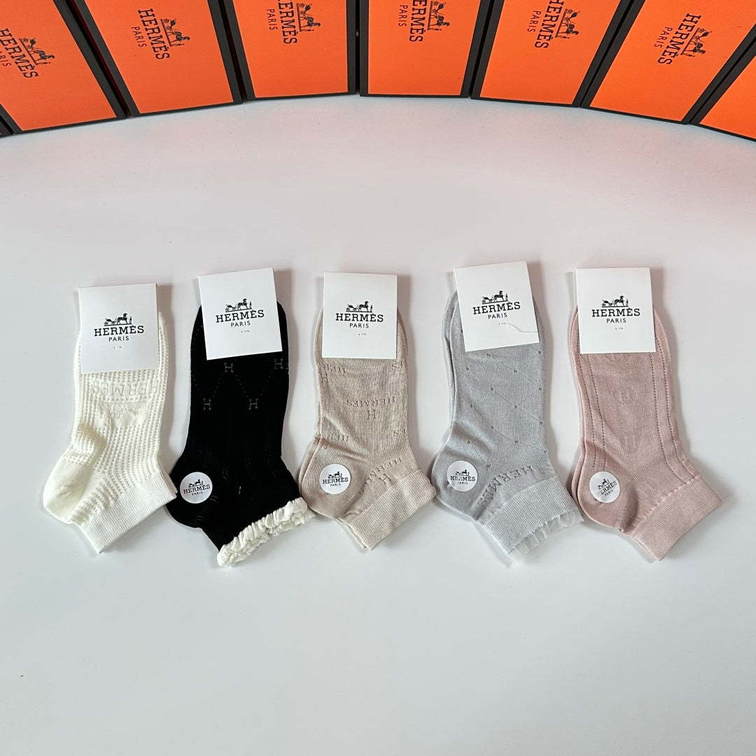 Elevate your sock collection with the new Hermes short and medium style pile socks. This stylish set includes five pairs, beautifully packaged for easy display. Designed for fashion-forward individuals, these synchronized tube socks effortlessly complement any outfit. A must-have for every fashionista, they offer both comfort and versatility. Make a statement with Hermes socks and enhance your wardrobe today!
