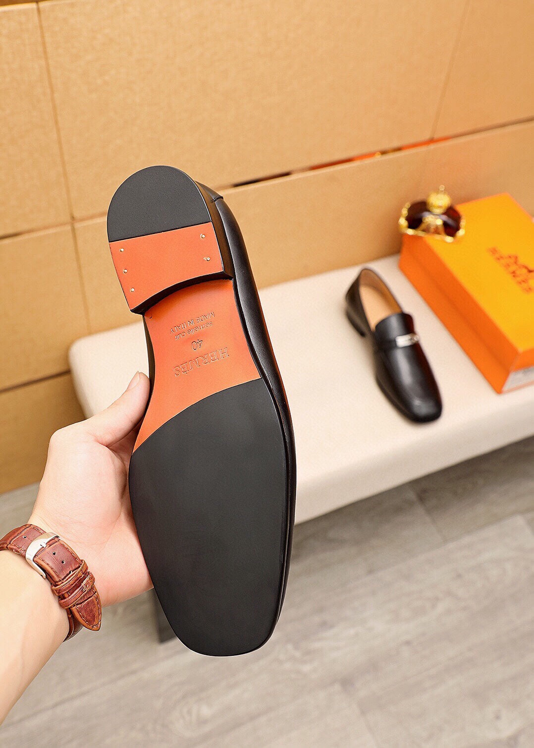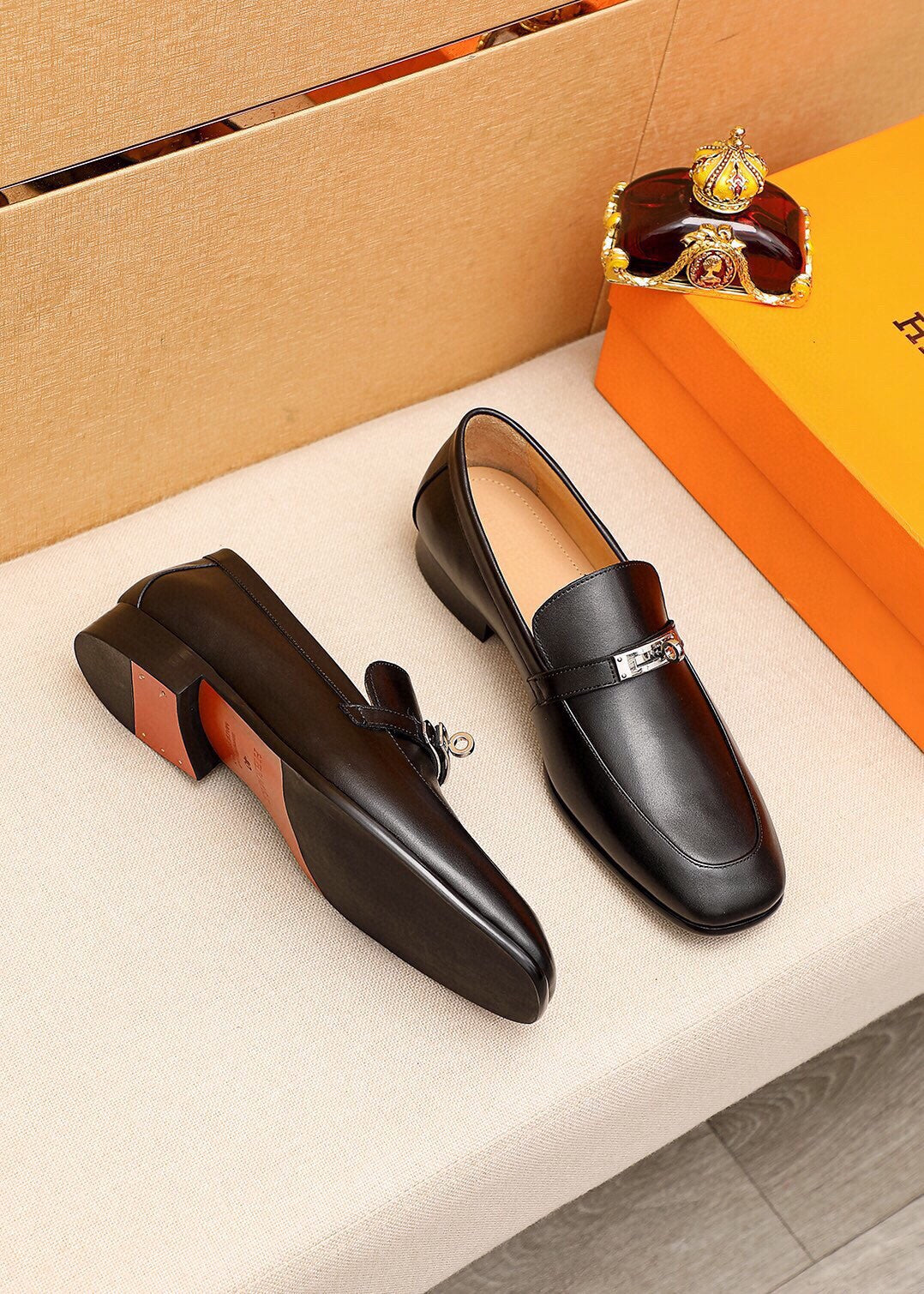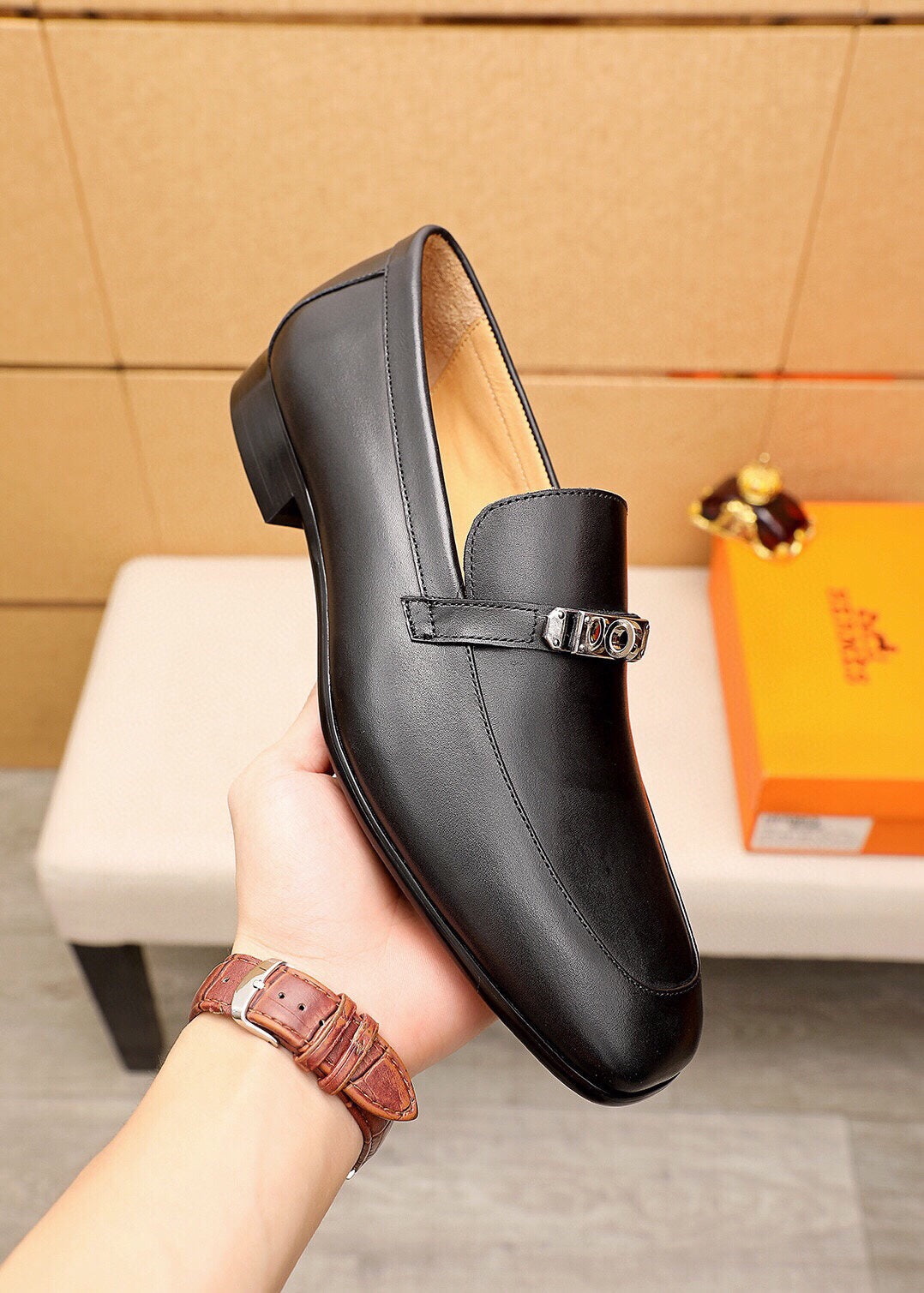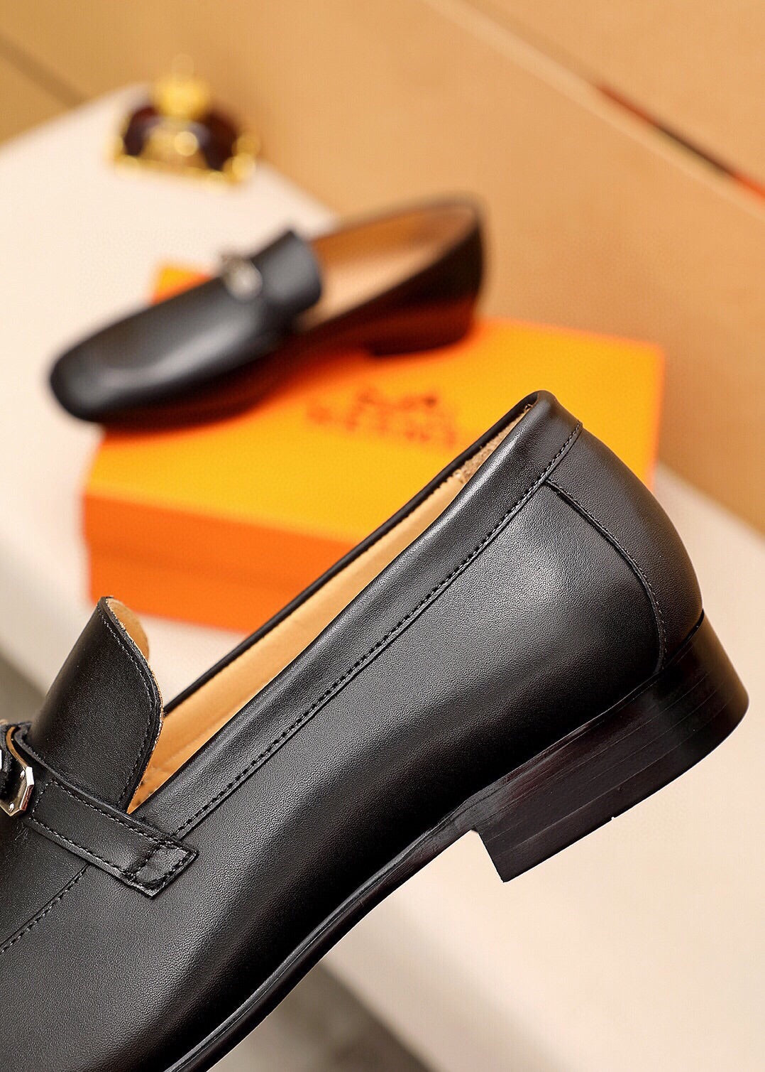 Elevate your footwear collection with the Hermes fashionable casual leather shoes. Crafted from premium first-layer calfskin, these shoes offer a luxurious touch with a classic hardware buckle that enhances their stylish appeal. The imported water-dyed cowhide lining ensures maximum comfort, while the strong three-dimensional visual effect adds uniqueness to your look. Featuring a durable simulated leather outsole, these shoes are designed to withstand daily wear and tear.