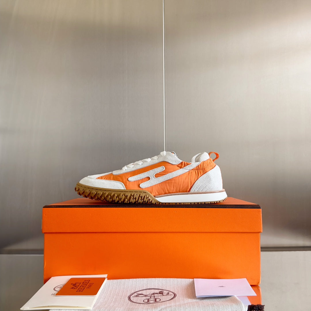 Step up your casual footwear game with the Hermes Jet Series Couples Casual Sports Shoes. Crafted from original customized imported cowhide, these stylish sneakers feature exquisite suede goatskin adorned with contrasting patterns and the iconic "H" logo, showcasing an avant-garde retro aesthetic.
