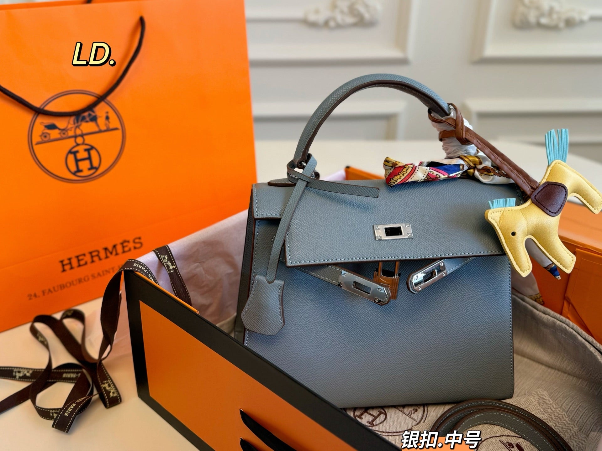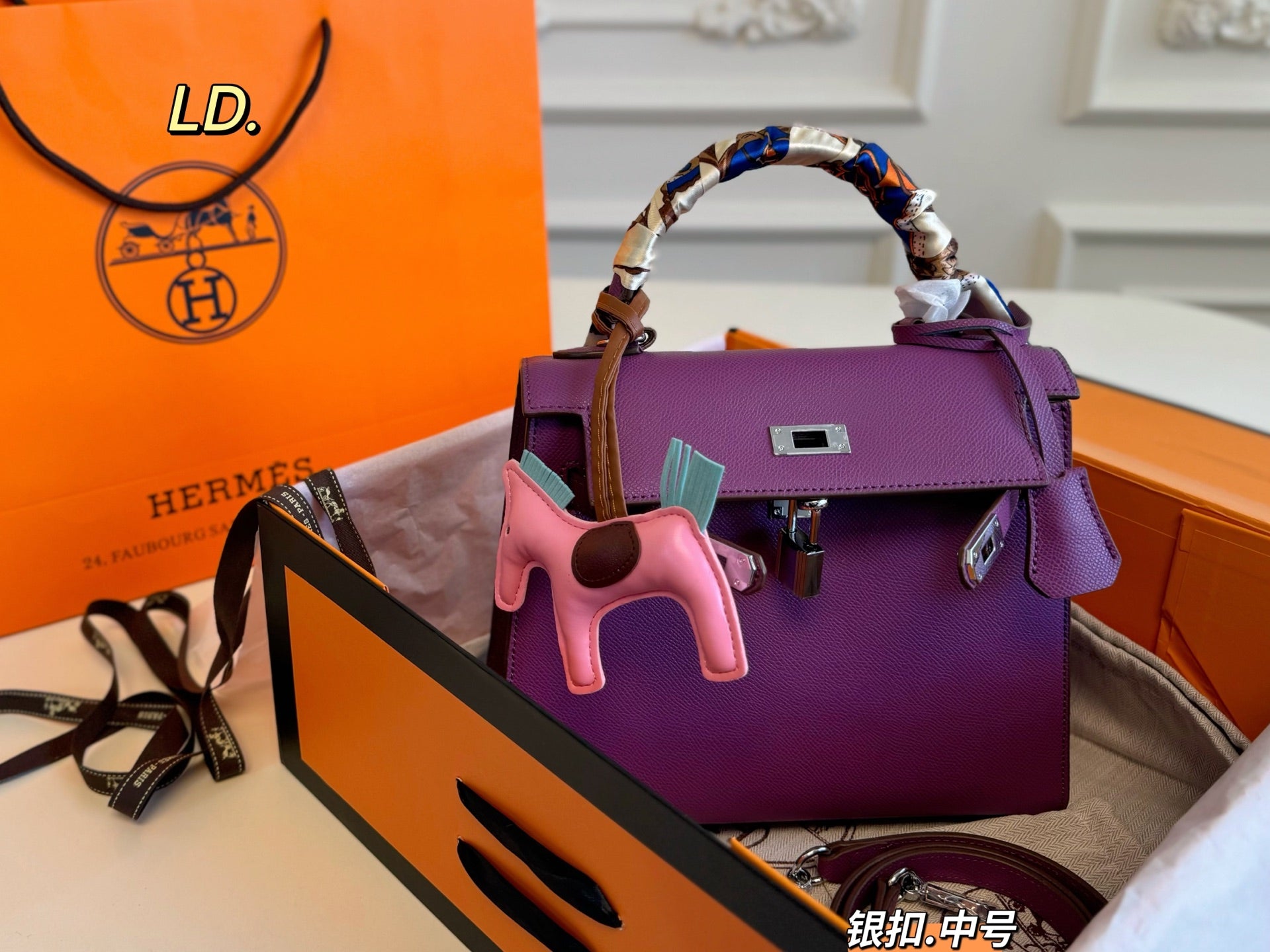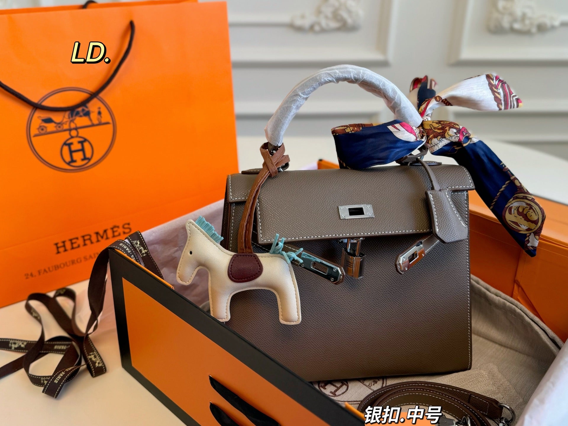 Elevate your style with our Hermes Kelly Bag, featuring a sleek and sophisticated design. This medium-sized handbag (24×19 cm) comes as a complete set, including a folding box, a pony pendant, and a luxurious scarf. Crafted with original quality materials, it showcases a stunning silver buckle that adds a touch of elegance and enhances your overall look. Perfect for any occasion, this bag combines a tough, cool shape with high-end appeal, making it an essential addition to your collection. Complete with a complimentary ribbon and pony pendant, this bag not only serves as a chic accessory but also a statement piece that reflects your unique temperament.