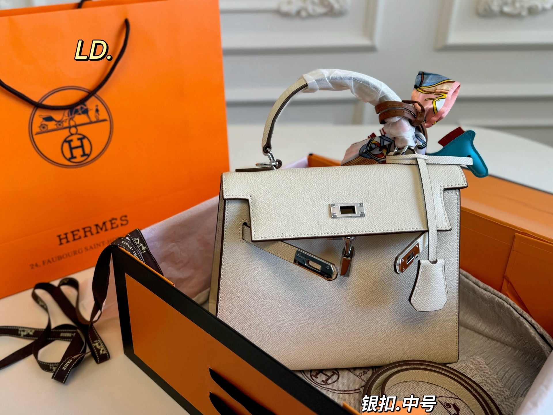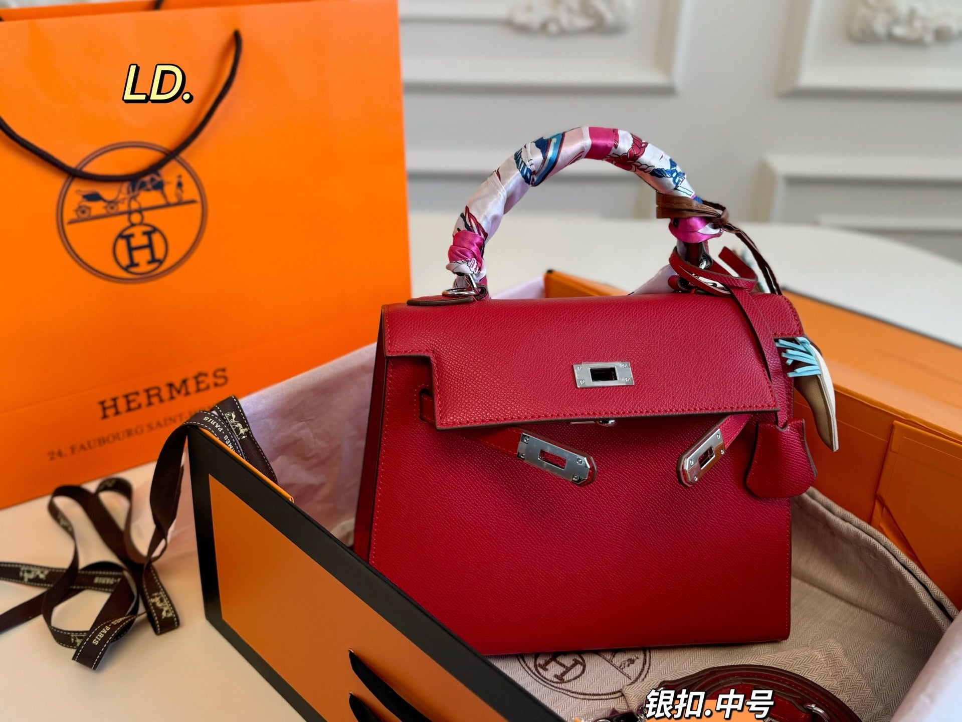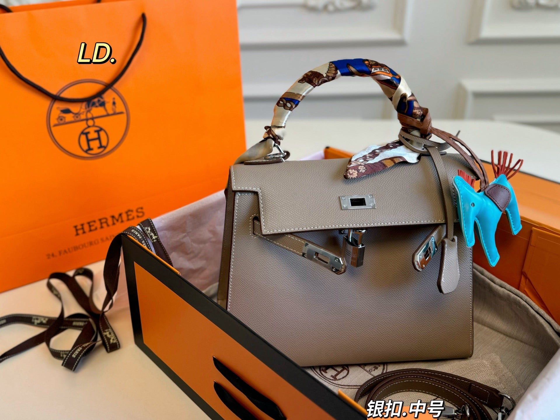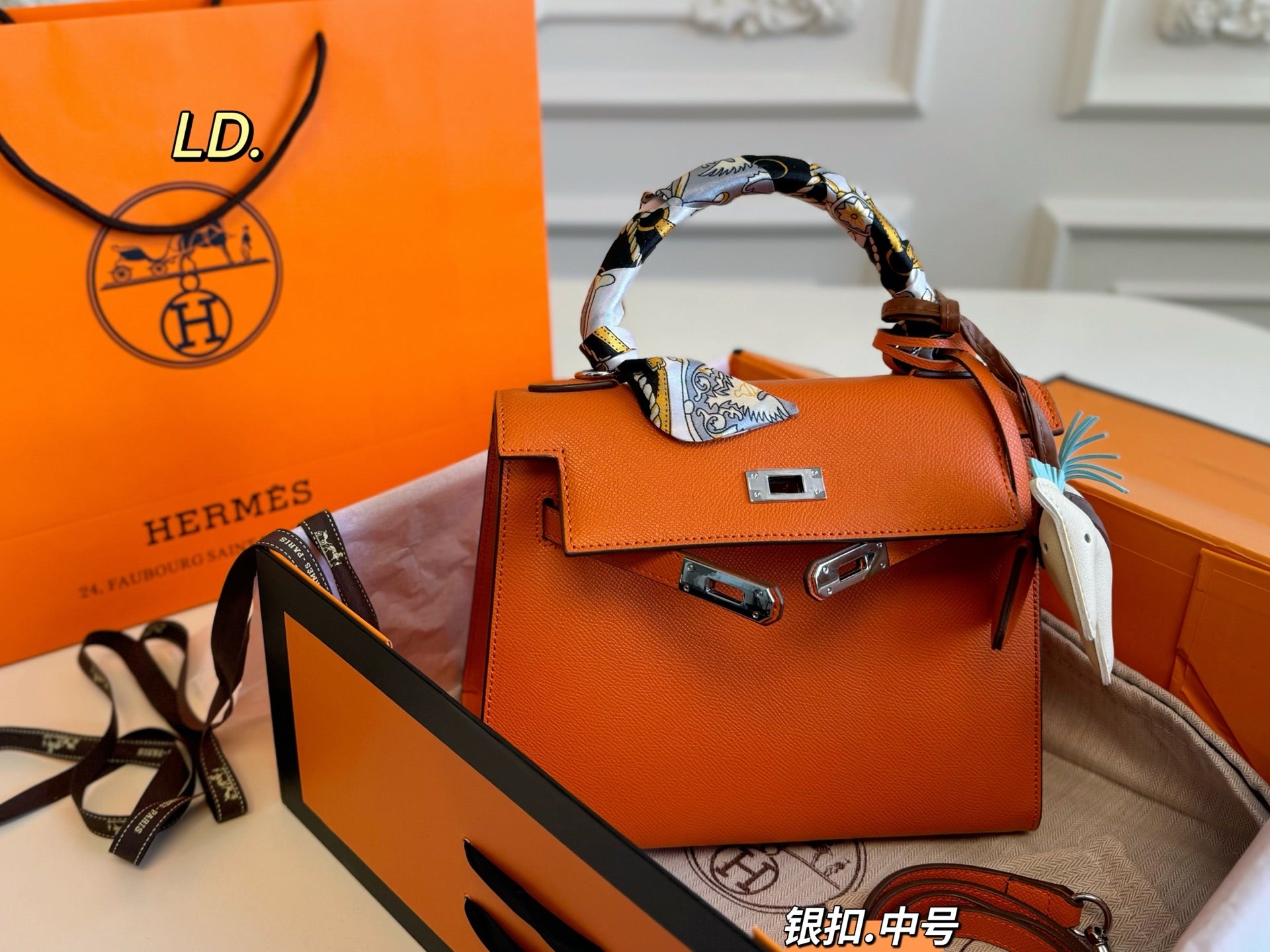 Elevate your style with our Hermes Kelly Bag, featuring a sleek and sophisticated design. This medium-sized handbag (24×19 cm) comes as a complete set, including a folding box, a pony pendant, and a luxurious scarf. Crafted with original quality materials, it showcases a stunning silver buckle that adds a touch of elegance and enhances your overall look. Perfect for any occasion, this bag combines a tough, cool shape with high-end appeal, making it an essential addition to your collection. Complete with a complimentary ribbon and pony pendant, this bag not only serves as a chic accessory but also a statement piece that reflects your unique temperament.