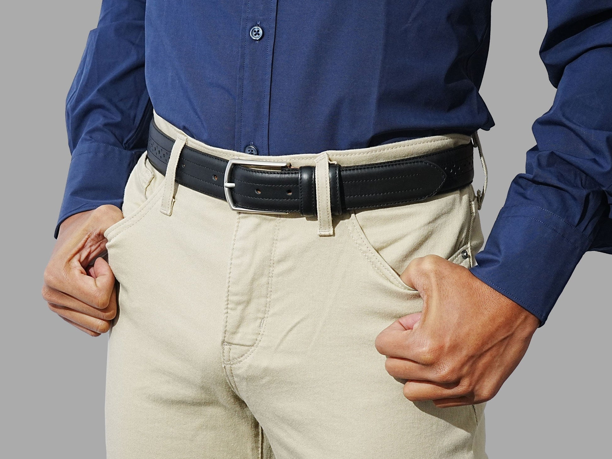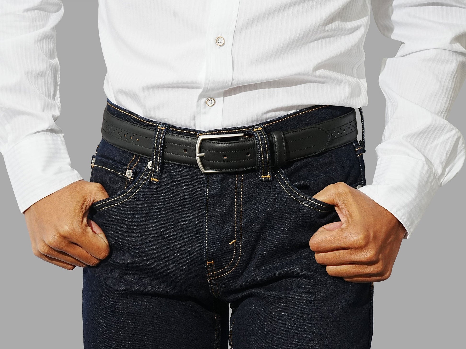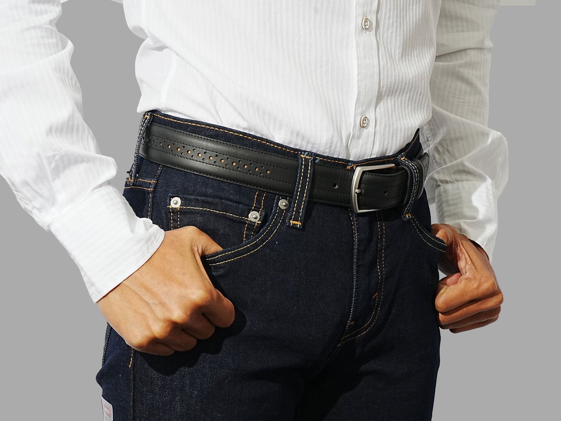 The Highland black brogue belt is more than an accessory, it’s a statement. The intricate perforated detailing sets it apart from traditional black belts, offering a refined look that works for both formal and casual settings.