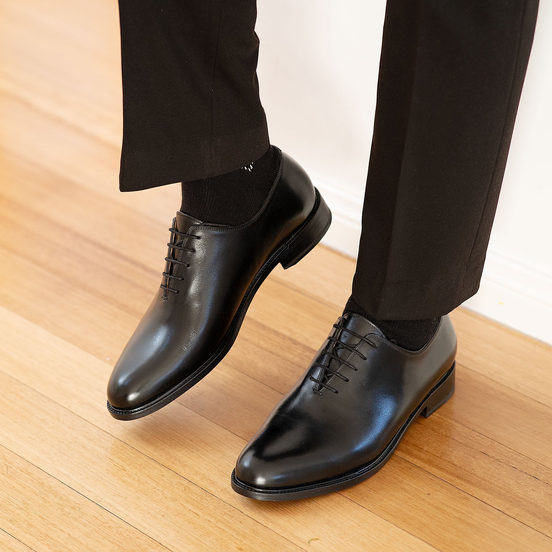 The Kingston black oxford wholecut embodies elegance, sleekness, and silhouette without broguing nor detailing at the toe cap. Working with a single piece of box calf leather, the Artisan has fewer options than when working with multiple pieces; thus, only the most experienced can pull off this craftmanship.