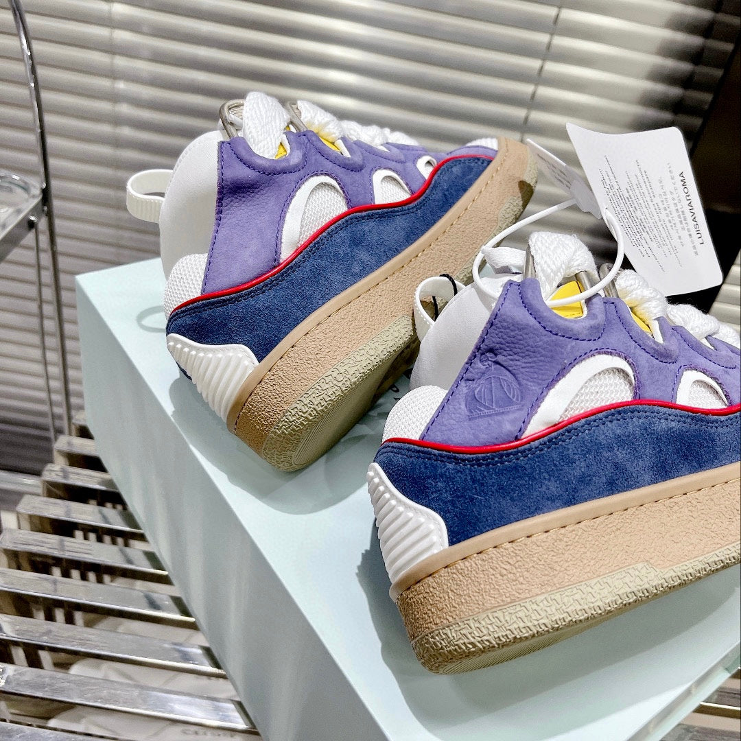 Constructed from premium nappa calfskin, suede, and breathable mesh, the intricate patchwork design features a rounded shape and a padded tongue for unparalleled comfort. The iconic LANVIN mother-daughter logo is prominently displayed on the upper, underscoring the shoe's commitment to quality and sophistication.