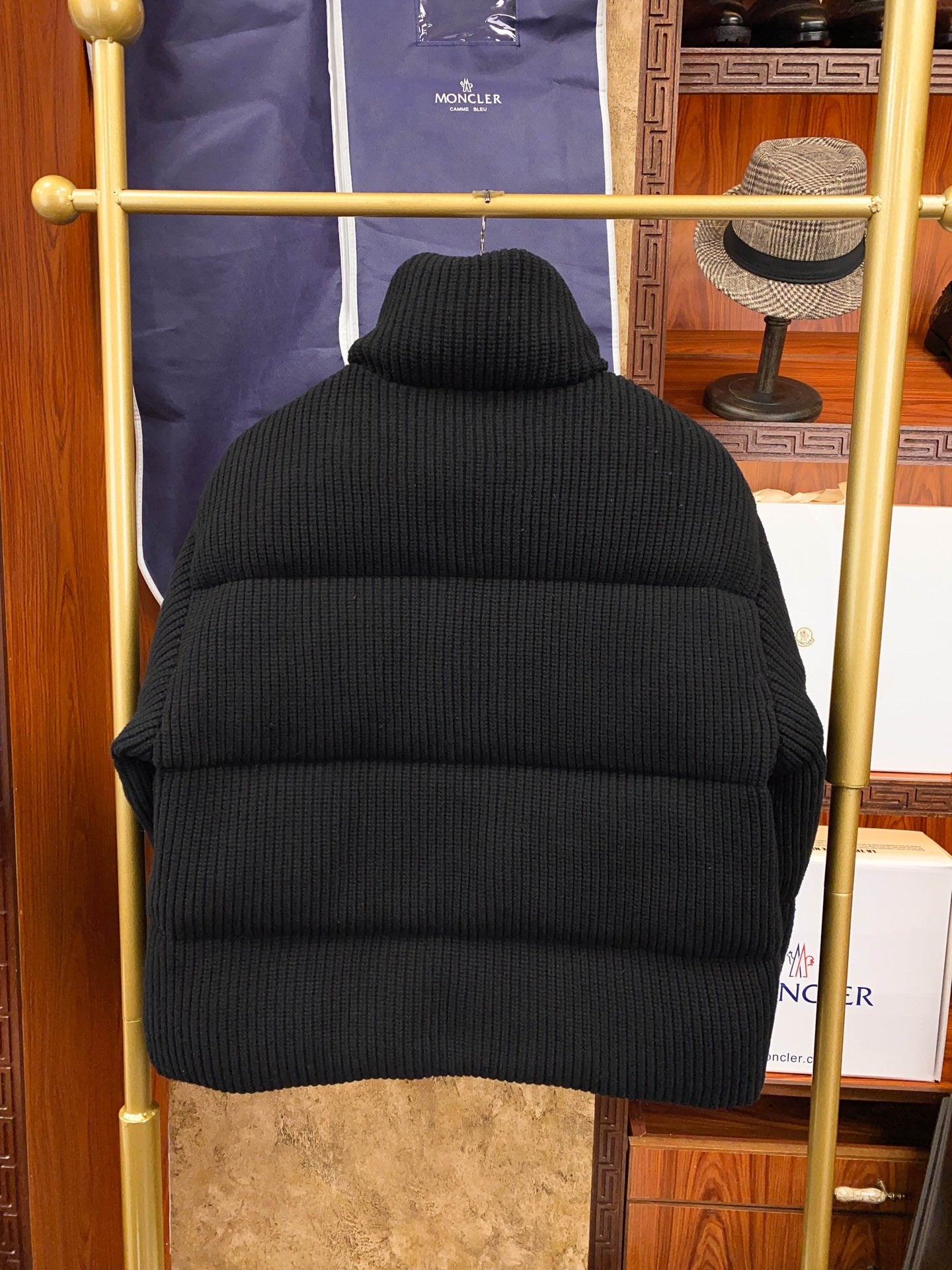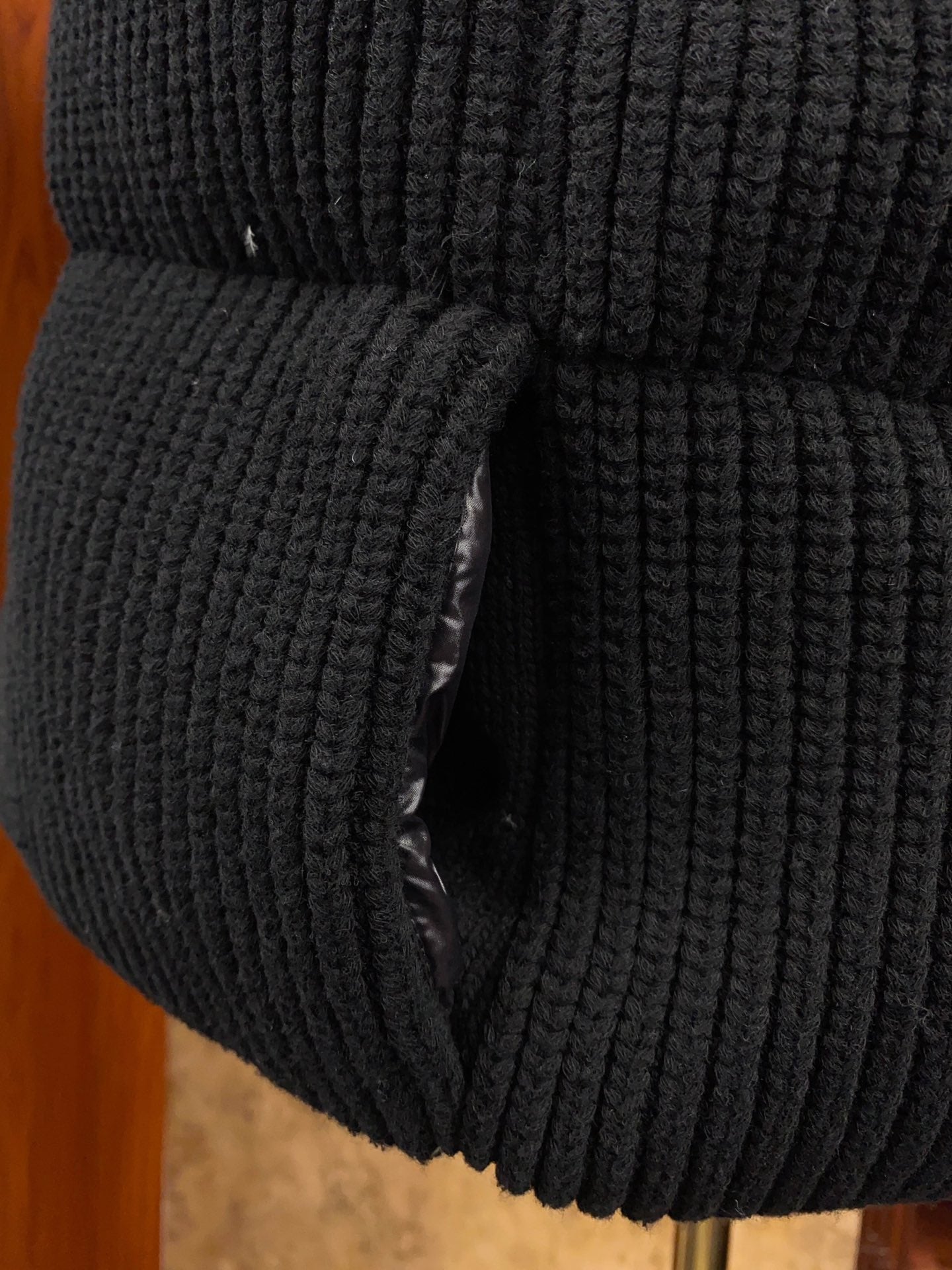 Introducing the Limited Edition Moncler A-Line Down Jacket in a striking purple-black hue. This beautifully crafted piece stands out as this year’s most coveted design, expertly made with an innovative knitted fabric technology. Each section is meticulously cut and woven using a German Stoll flat knitting machine, ensuring unique construction in every jacket.