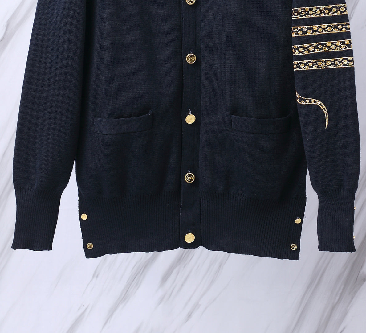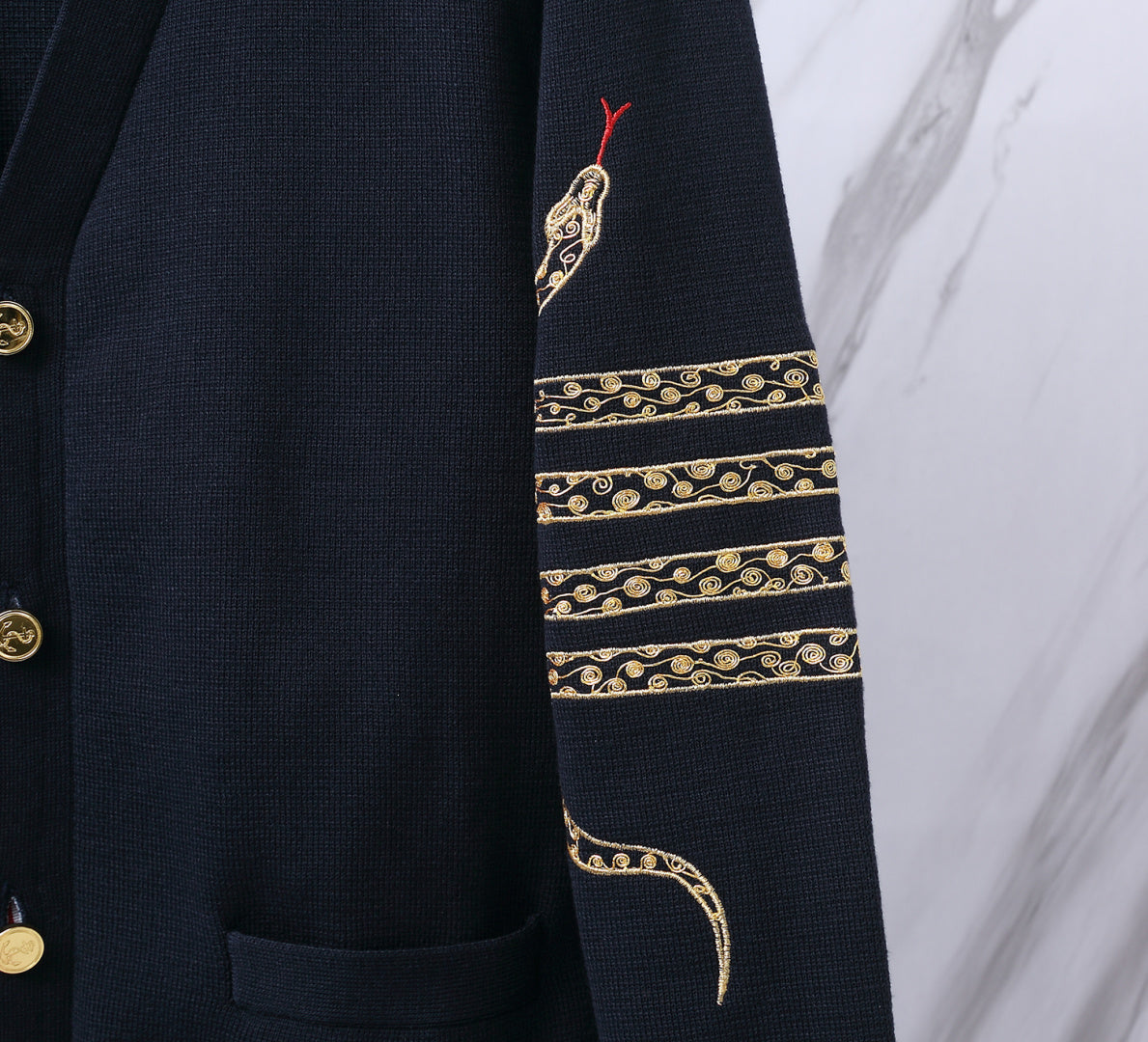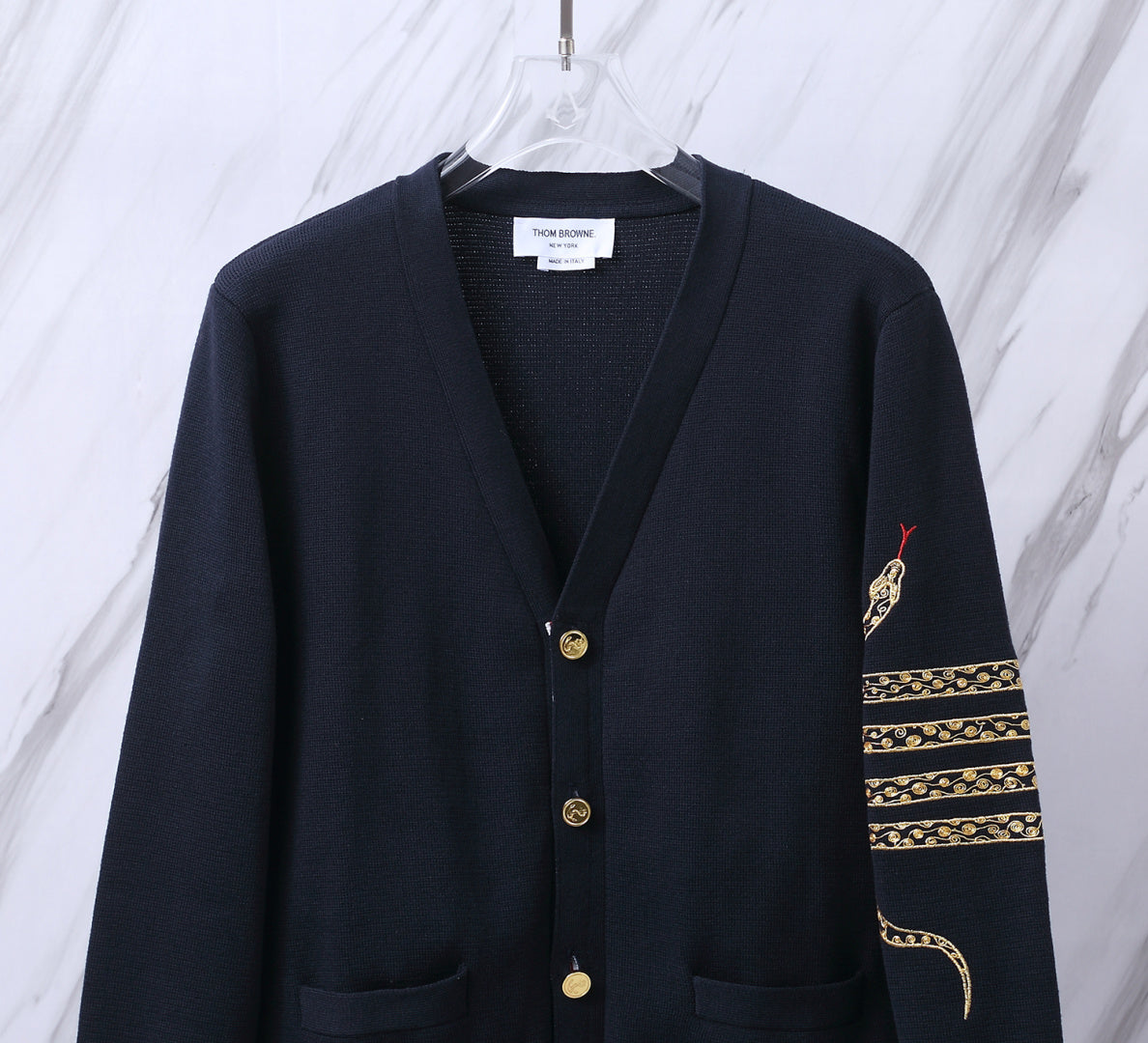 Elevate your wardrobe with the exclusive TB M50 Men's Year of the Snake Cardigan, designed by Thom Browne. This limited edition piece features a unique five-button design with custom metal copper buttons, beautifully crafted for couples.