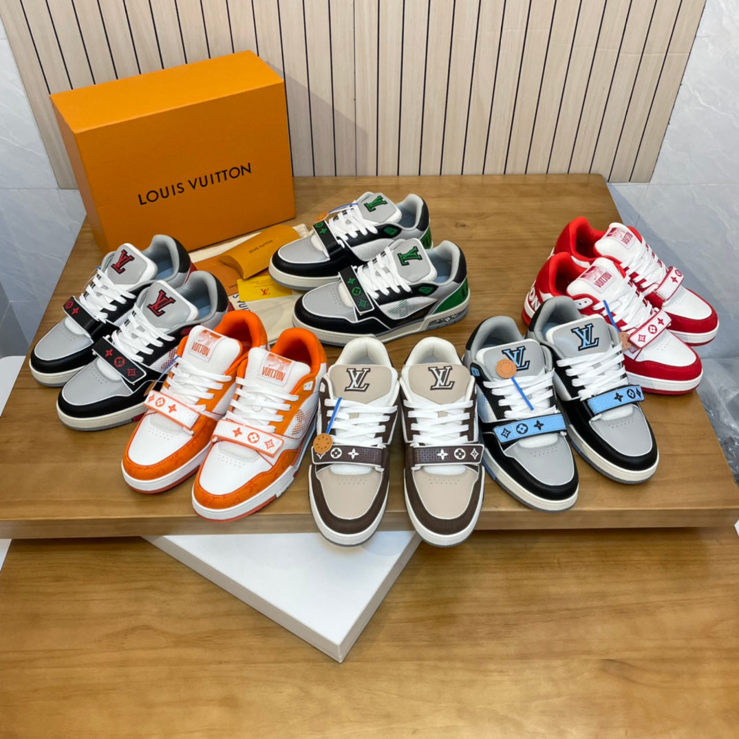 Introducing the latest addition to the Louis Vuitton collection: the 2023 Velcro Skateboard Sneakers. Renowned for their iconic design, these sneakers combine luxury with a nostalgic nod to the chunky skate shoes of the 90s. Crafted with a blend of premium leather and breathable mesh, they feature an eye-catching thick silhouette and bold shoelaces. Available in a variety of vibrant colors, these trainers are tailored for both men (sizes 39-46) and women (sizes 35-40). Elevate your sneaker game with this perfect fusion of style and comfort, designed for the fashion-forward skate enthusiast.
