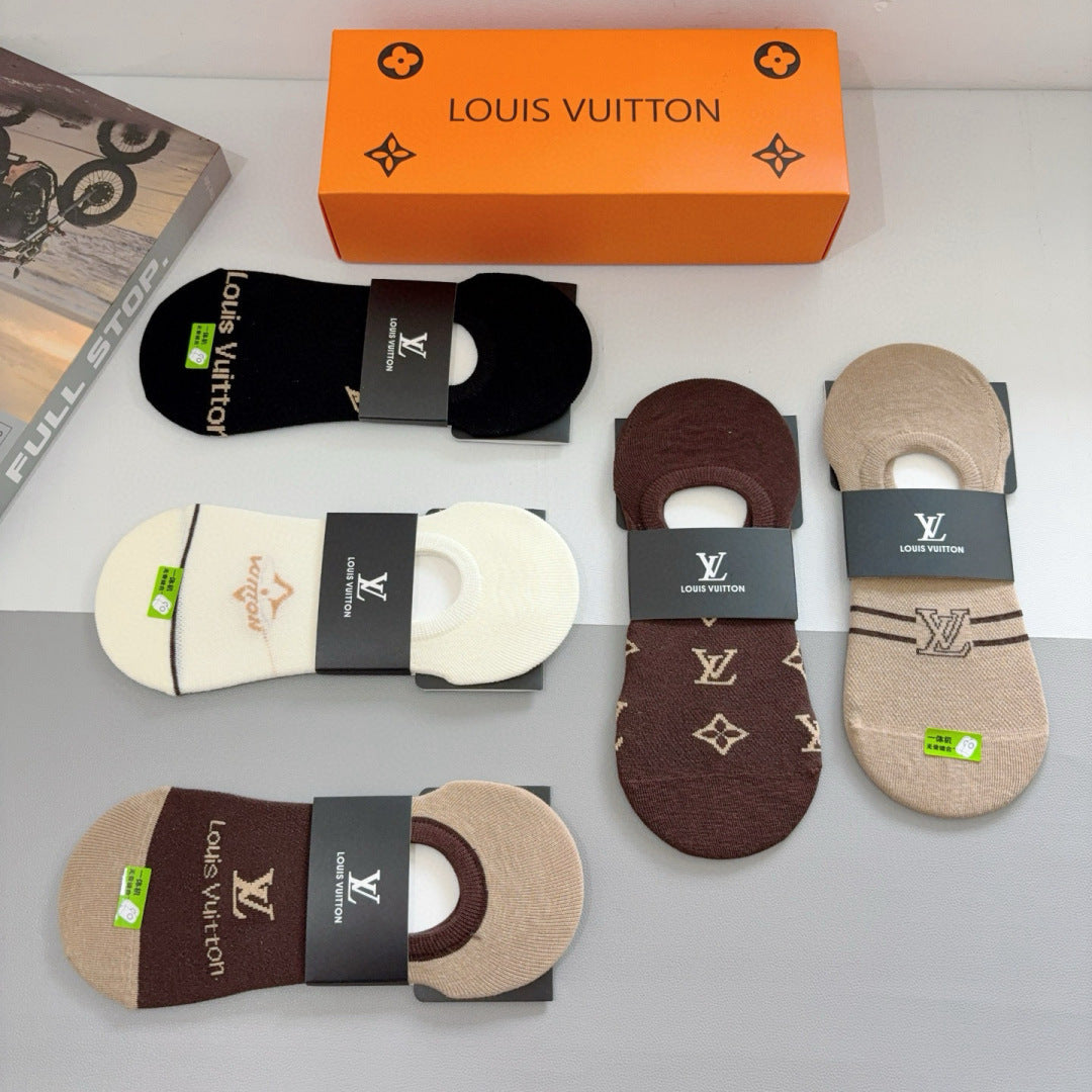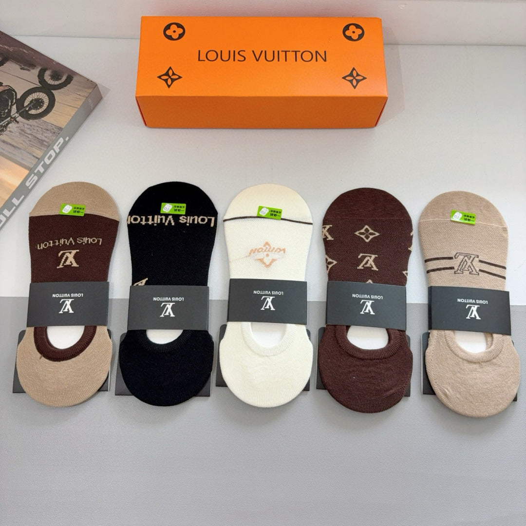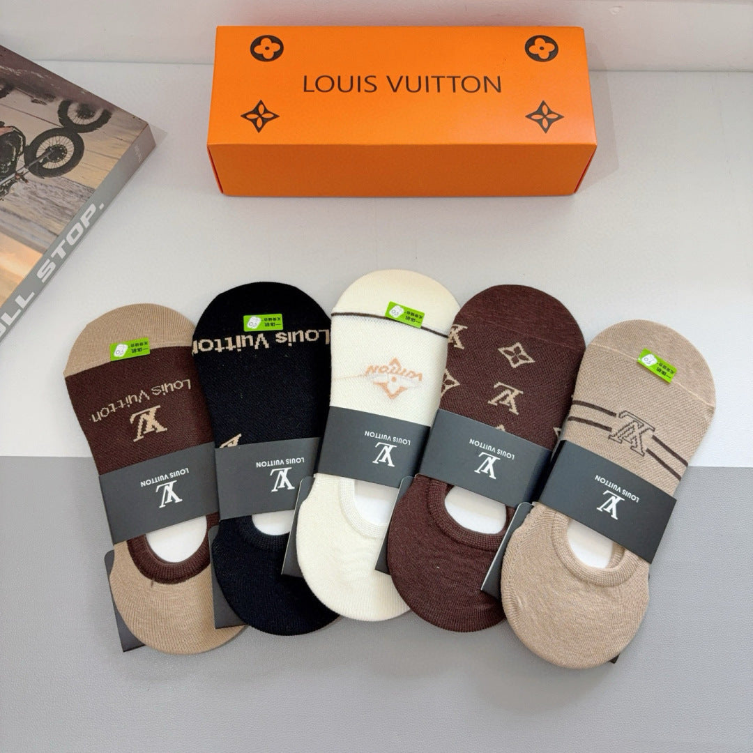 Elevate your sock collection with our Louis Vuitton high-quality bamboo cotton boat socks, available in a convenient box of five pairs. Featuring a classic logo pattern, these stylish socks are designed for comfort and versatility, making them a must-have accessory for fashion enthusiasts. Perfect for pairing with a variety of outfits, these exquisite socks are a statement piece that combines luxury and everyday elegance. Indulge in the perfect blend of style and functionality with this exclusive offering.