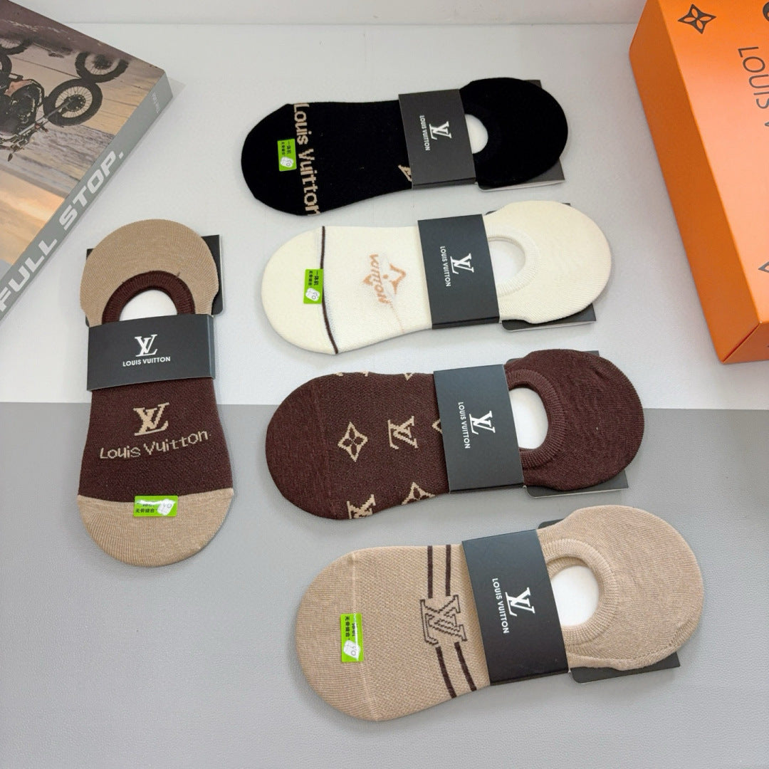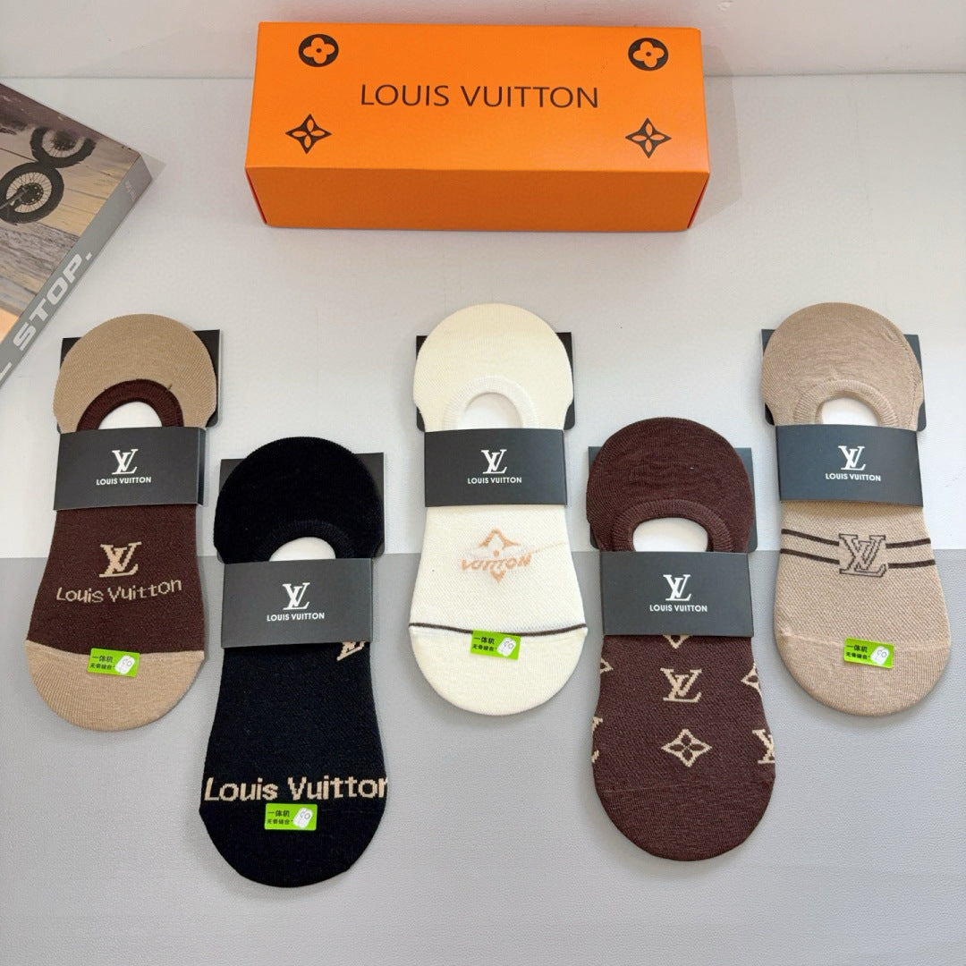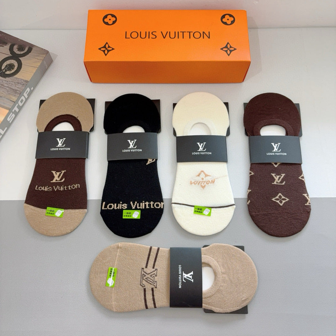 Elevate your sock collection with our Louis Vuitton high-quality bamboo cotton boat socks, available in a convenient box of five pairs. Featuring a classic logo pattern, these stylish socks are designed for comfort and versatility, making them a must-have accessory for fashion enthusiasts. Perfect for pairing with a variety of outfits, these exquisite socks are a statement piece that combines luxury and everyday elegance. Indulge in the perfect blend of style and functionality with this exclusive offering.