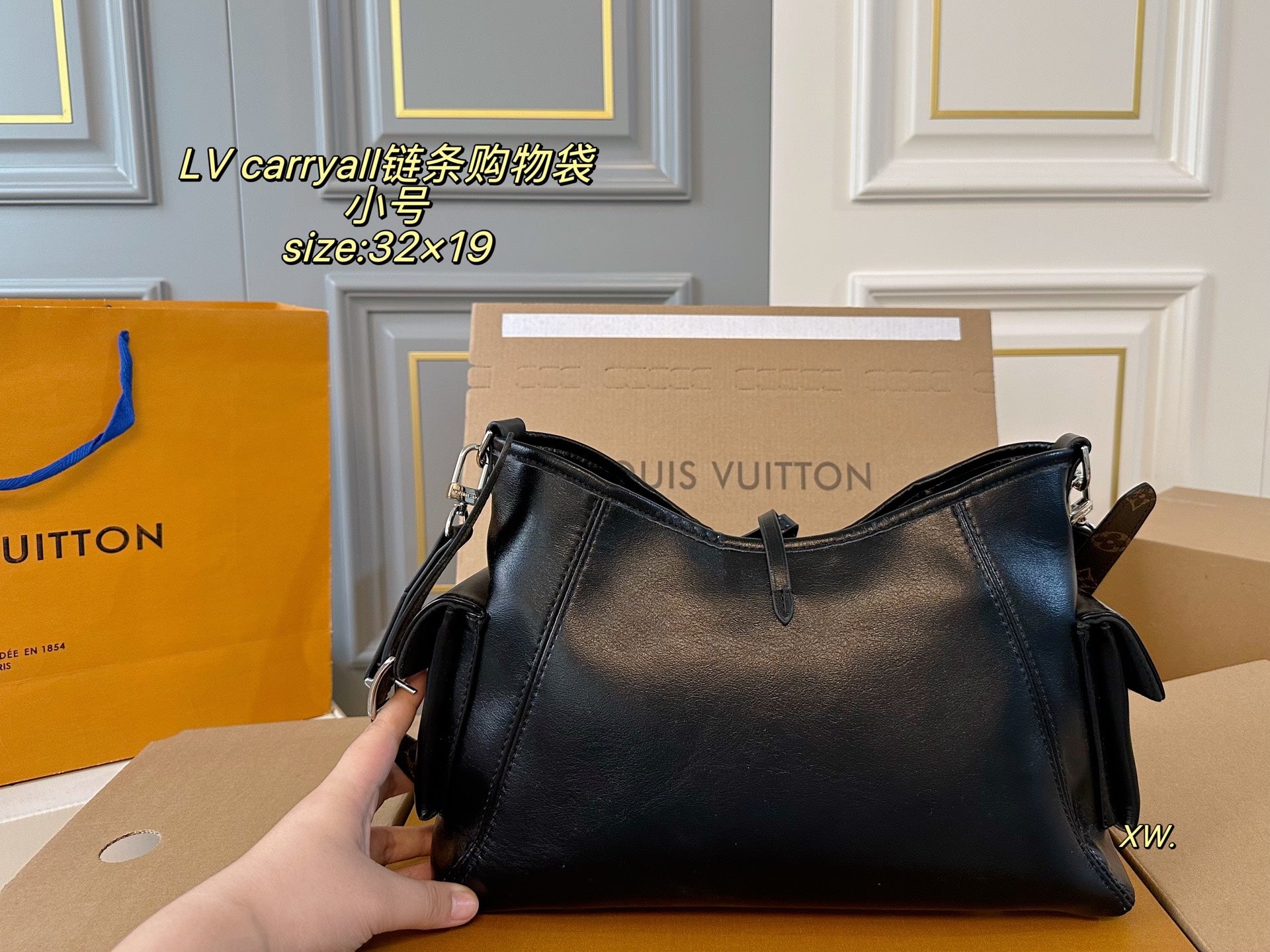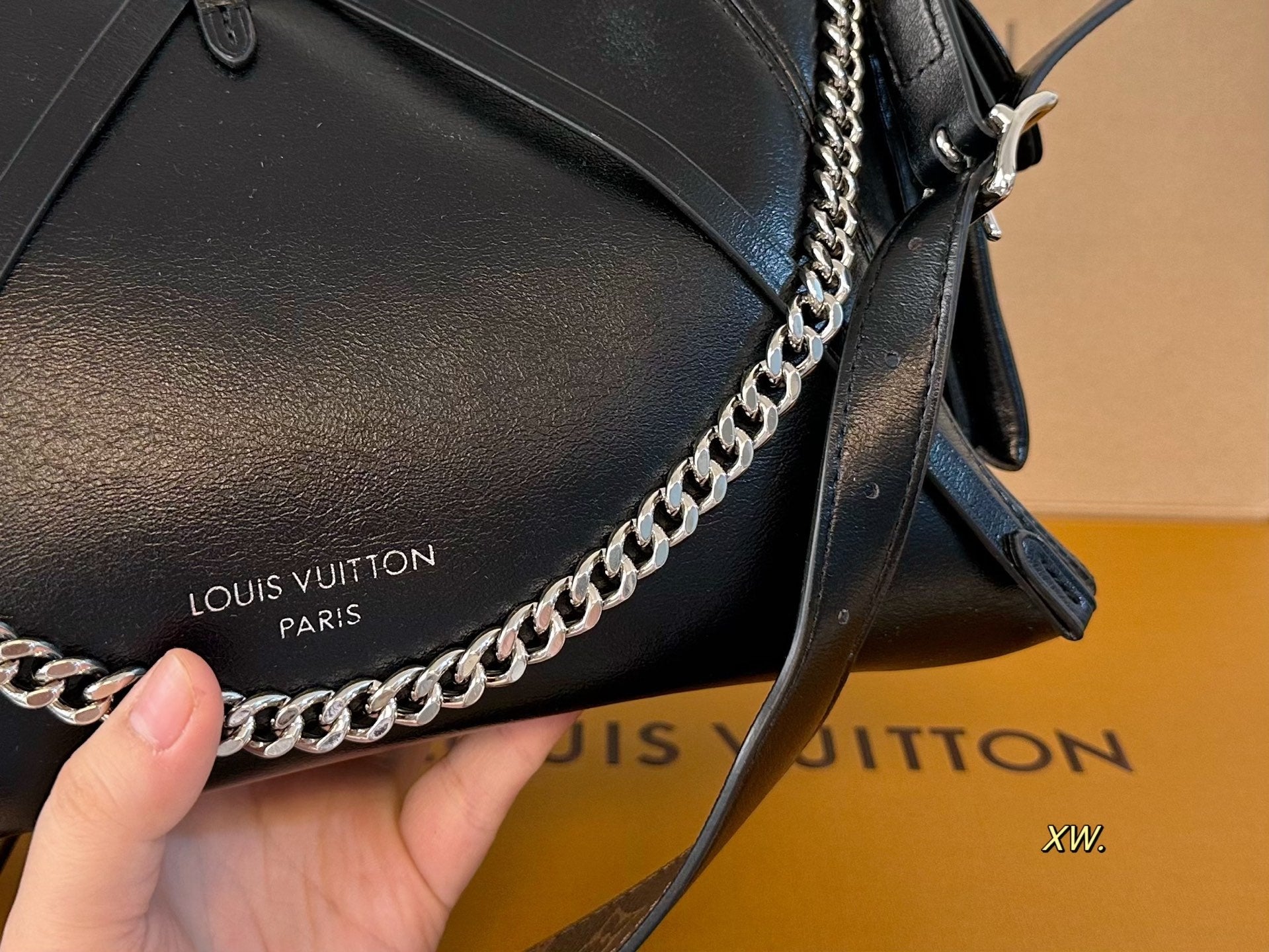 Discover the elegance of the Louis Vuitton Dark Cargo Carryall Chain Shopping Bag. This compact bag features an innovative folding design with dimensions of 32x19cm, perfect for carrying your essentials in style. Crafted from premium textured leather, it offers a casual yet sophisticated look. This all-black masterpiece is not just a fashion statement; it’s a spacious solution for your shopping needs, embodying the modern look of this season’s statement piece. Upgrade your accessory collection with this must-have bag from LV.