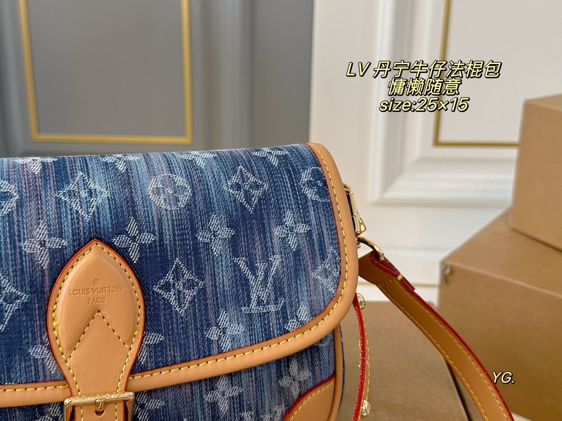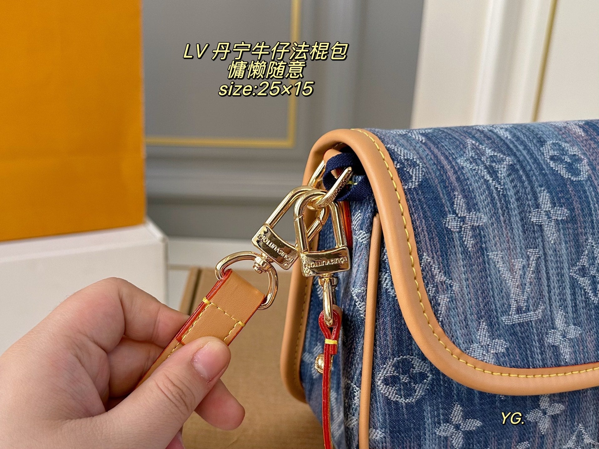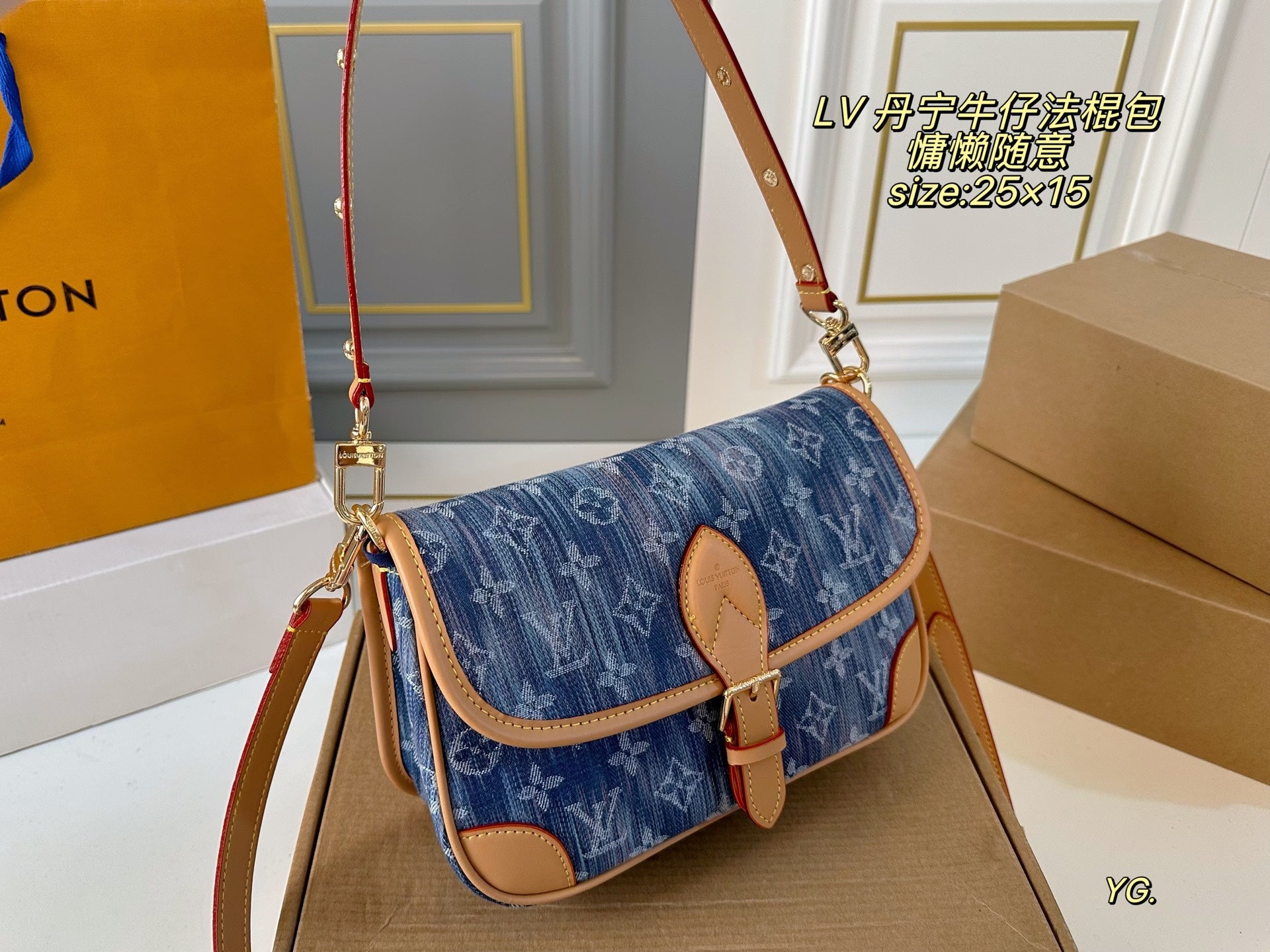 Elevate your style with the Louis Vuitton Denim Baguette Bag, measuring 25×15 cm. This versatile bag features two shoulder straps for your convenience: a chic armpit strap and a stylish crossbody option. The retro belt buckle design adds a classic touch, making it both practical and fashionable. Its minimalist silhouette allows for effortless styling, whether you prefer a salty or sweet look. Perfect for casual outings!