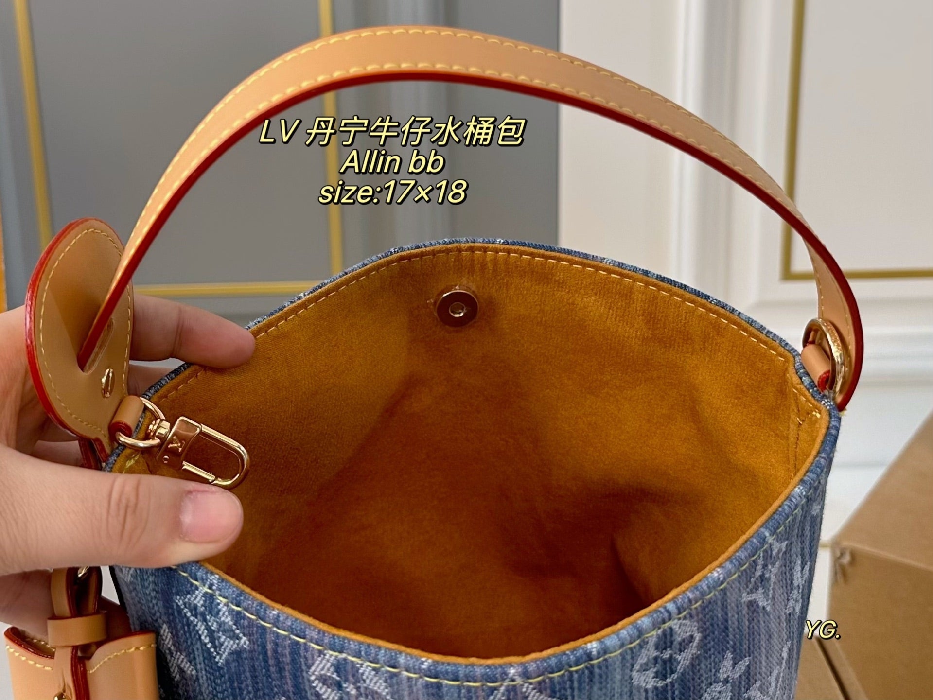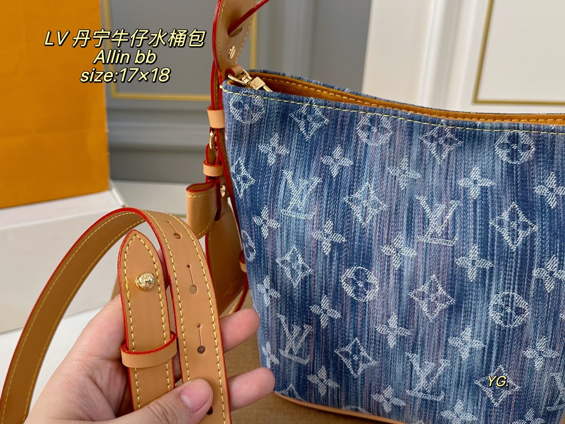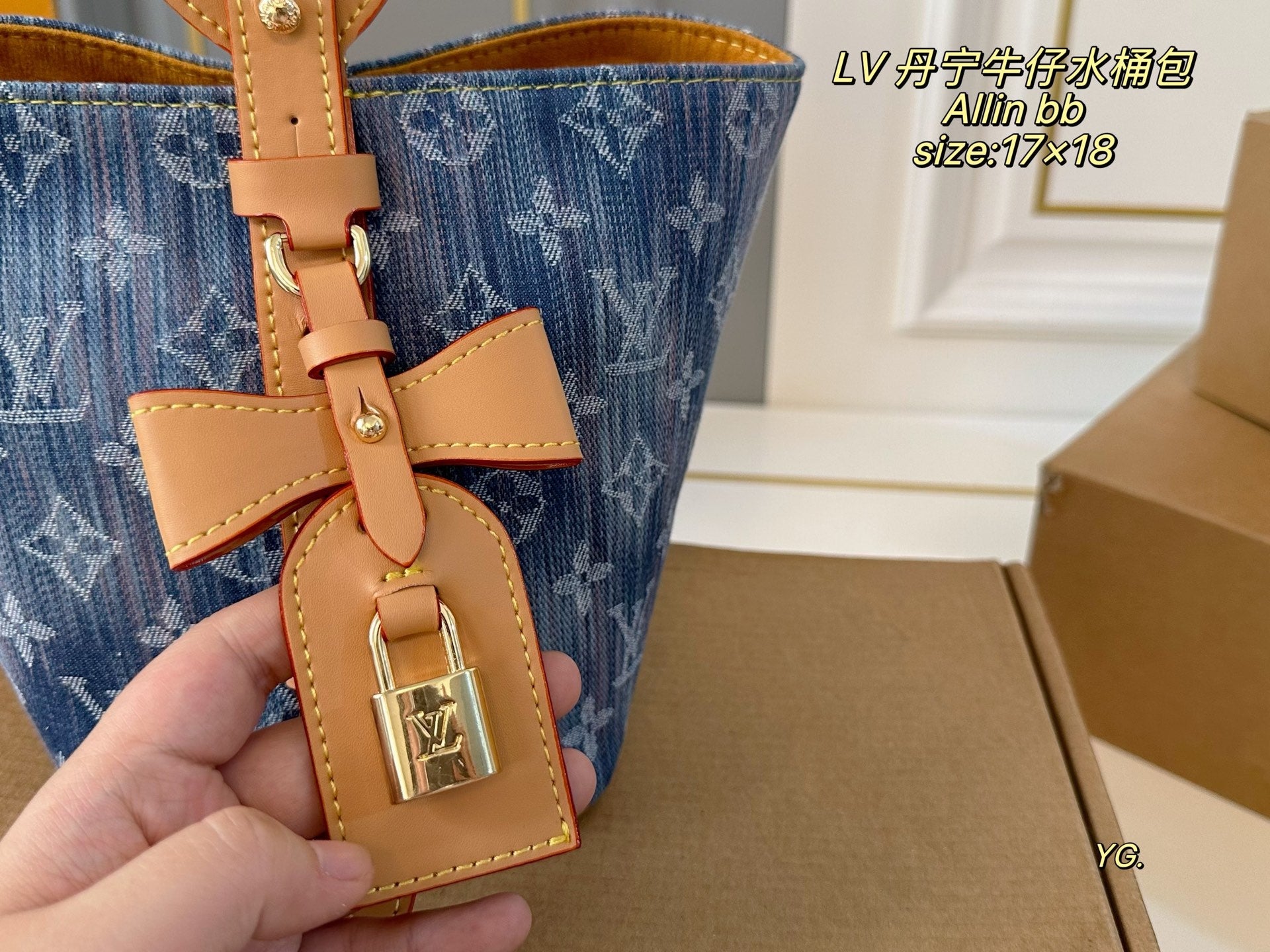 Discover the elegance and versatility of the Louis Vuitton 25 Allinbb Denim Bucket Bag. Measuring 17x18 cm, this exquisite handbag features a unique denim design complemented by textured hardware for a chic look.