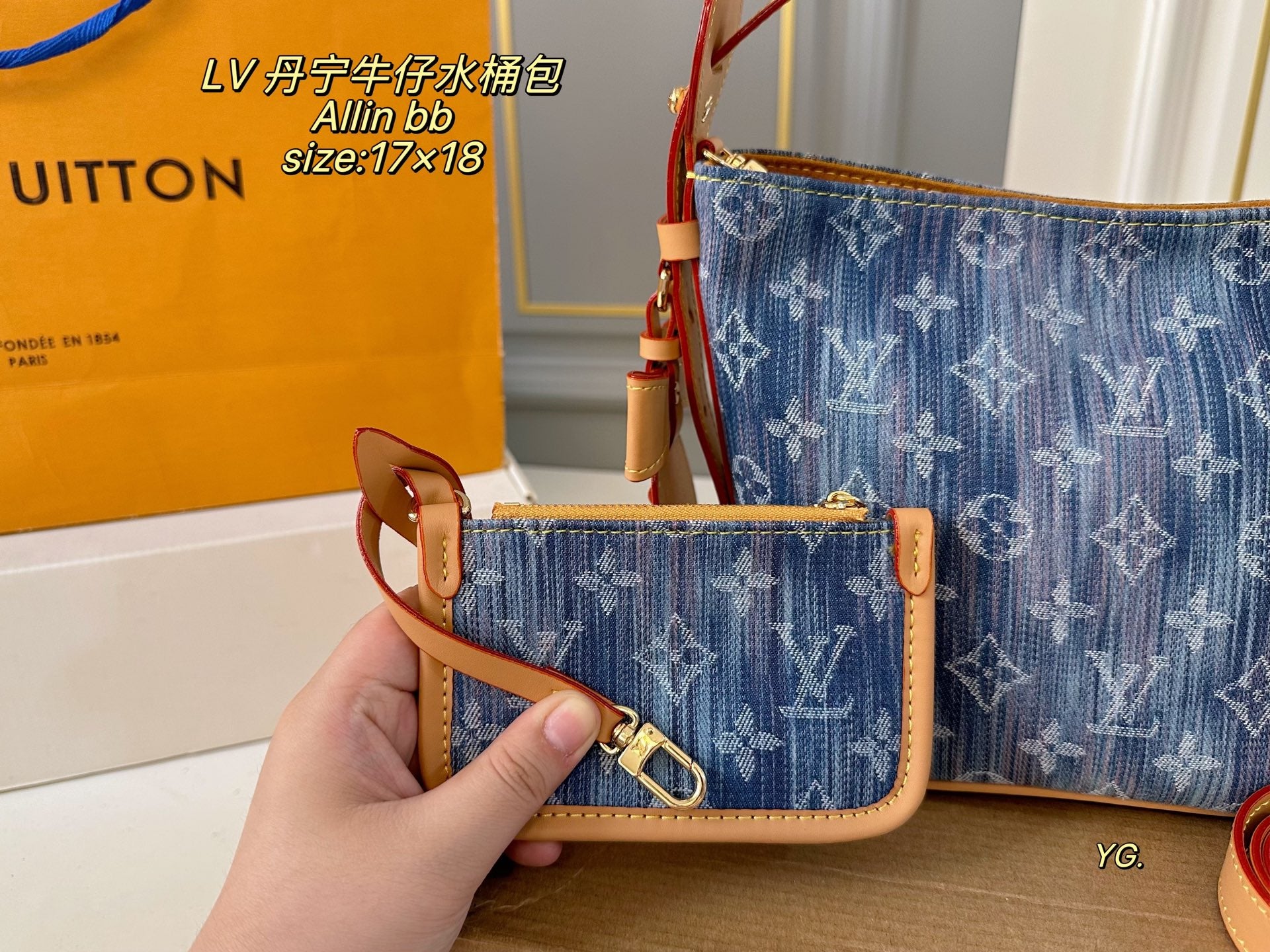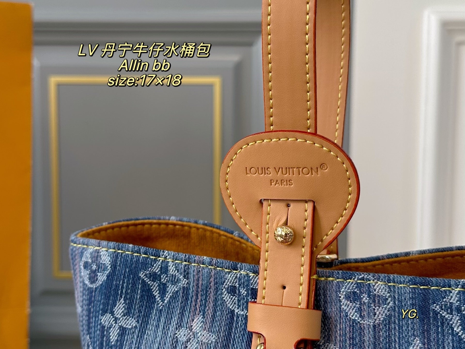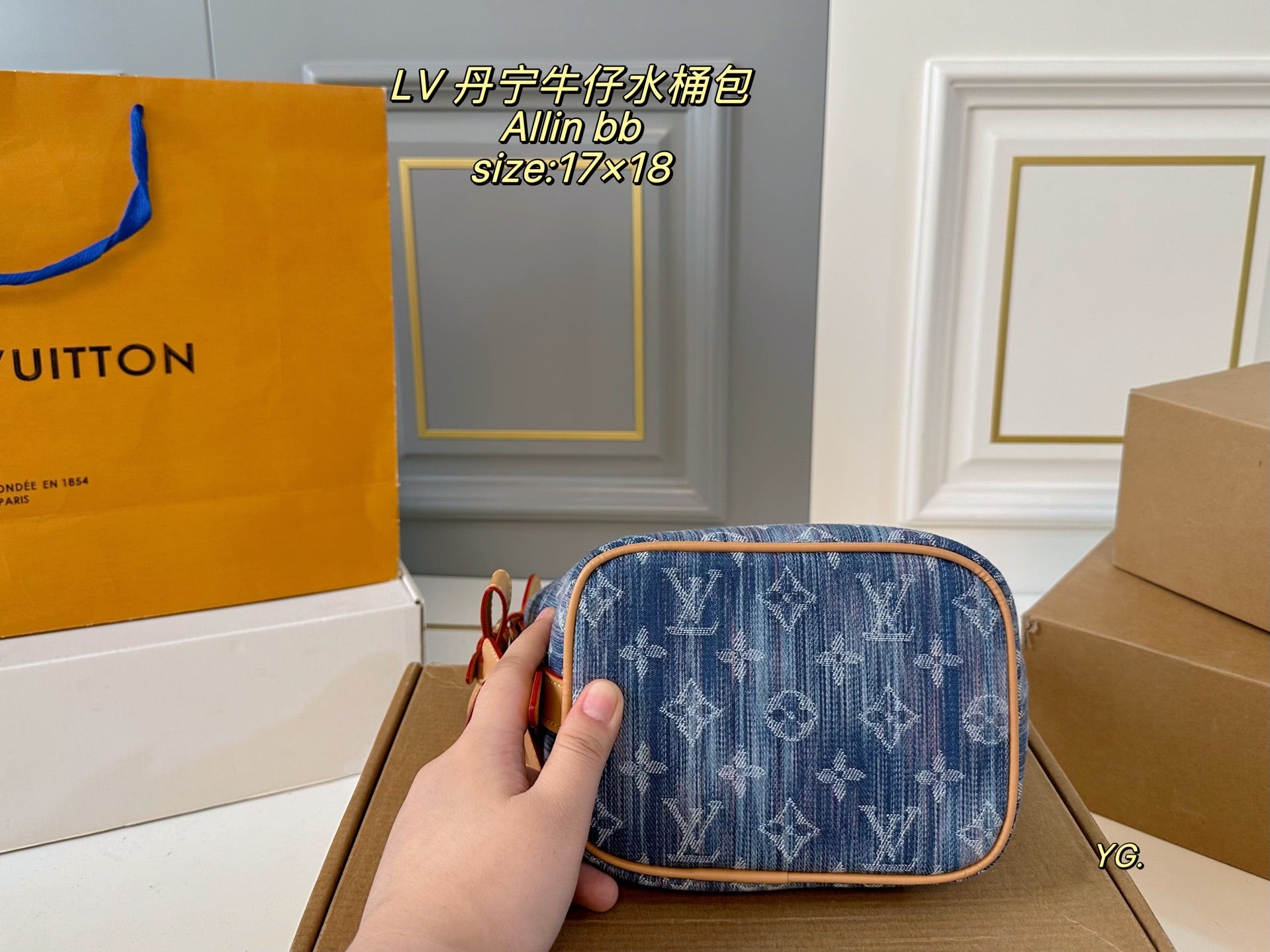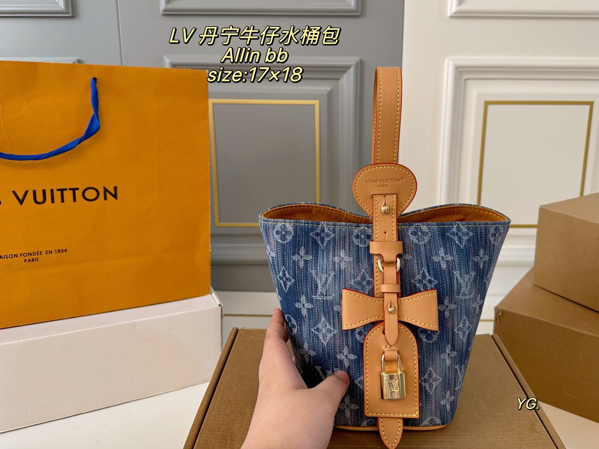 Discover the elegance and versatility of the Louis Vuitton 25 Allinbb Denim Bucket Bag. Measuring 17x18 cm, this exquisite handbag features a unique denim design complemented by textured hardware for a chic look.