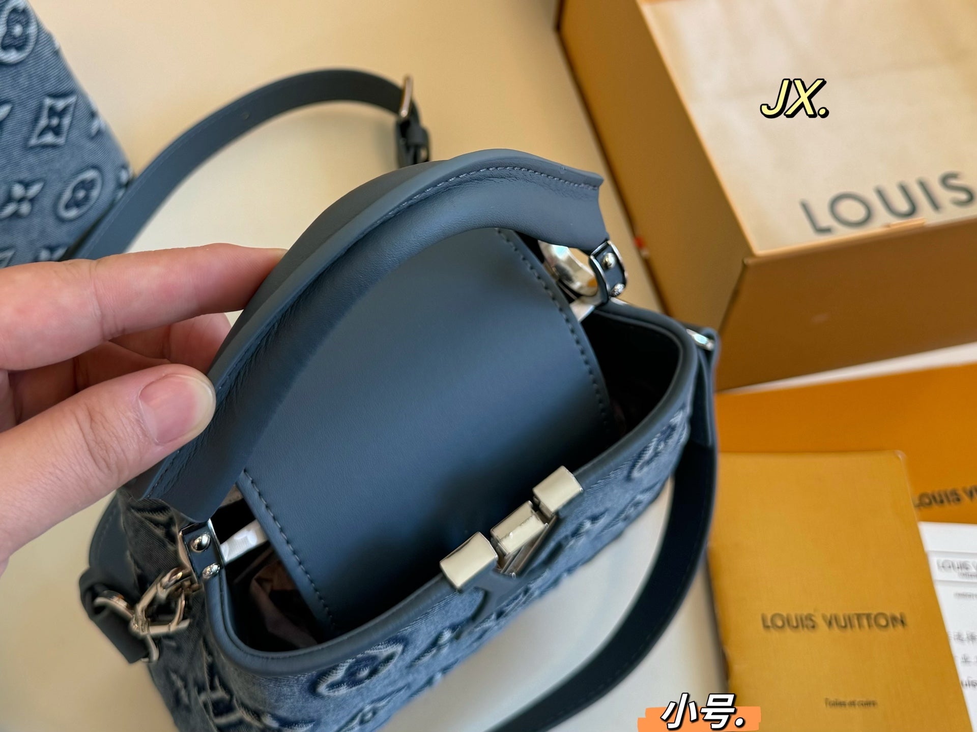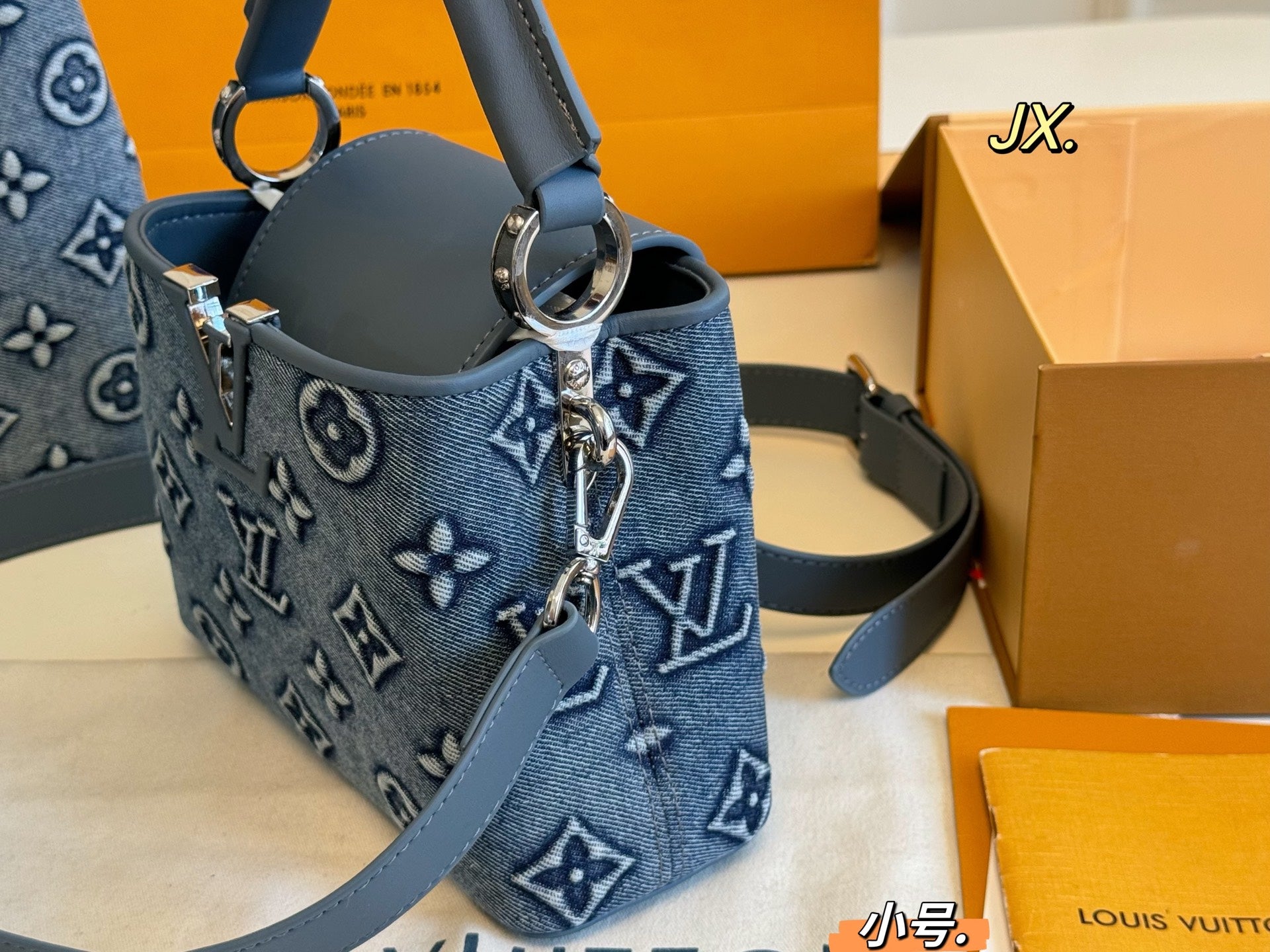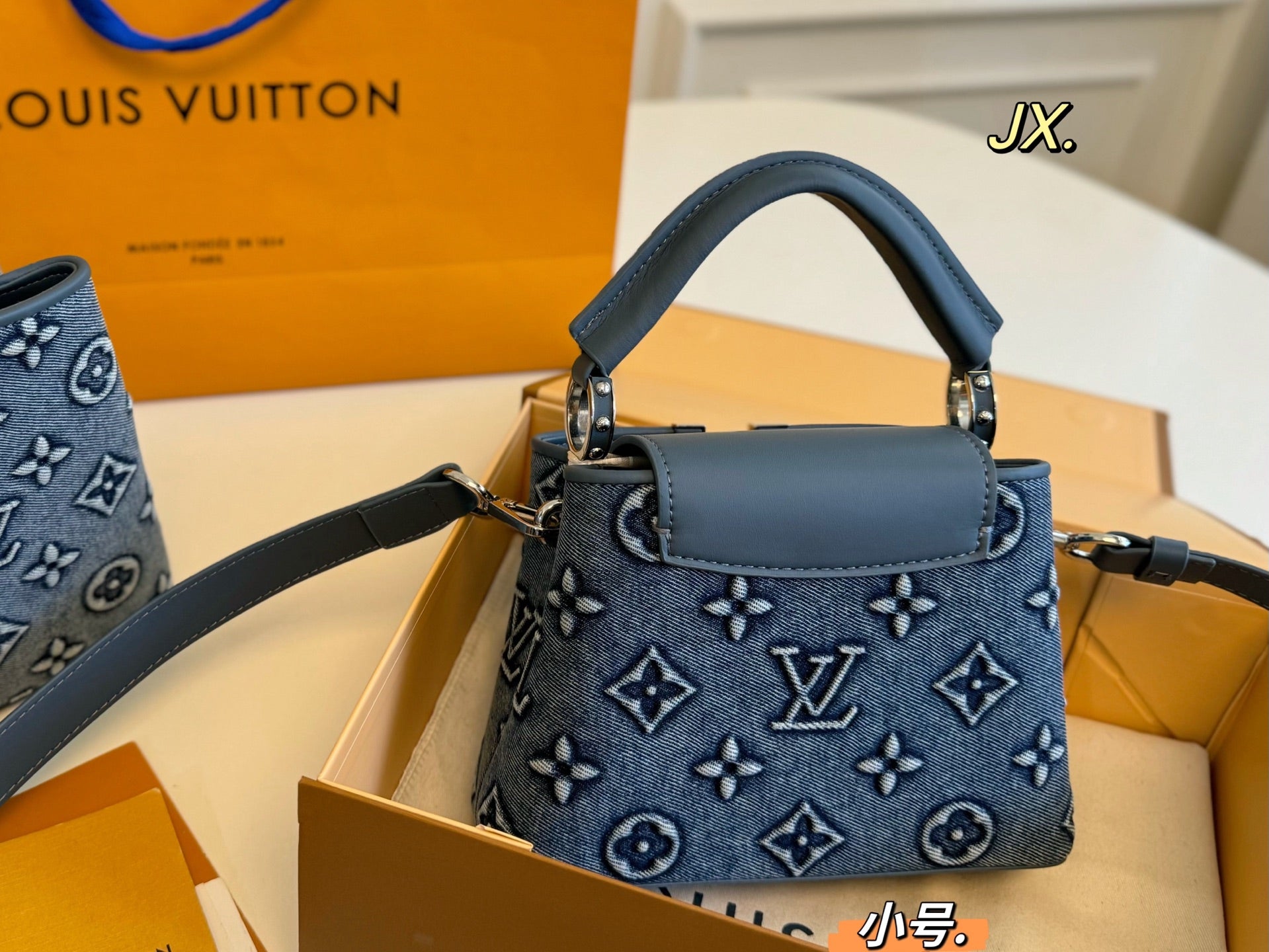 Discover the exquisite Louis Vuitton Denim Capucines Handbag, a perfect blend of luxury and style. Compact yet spacious, this handbag measures 20×14 cm, making it ideal for both everyday use and special occasions. Crafted with high-quality denim, it exudes sophistication and fashion-forward appeal. Elevate your collection with this elegant accessory that embodies refined luxury. Perfect for those who appreciate craftsmanship and timeless design.