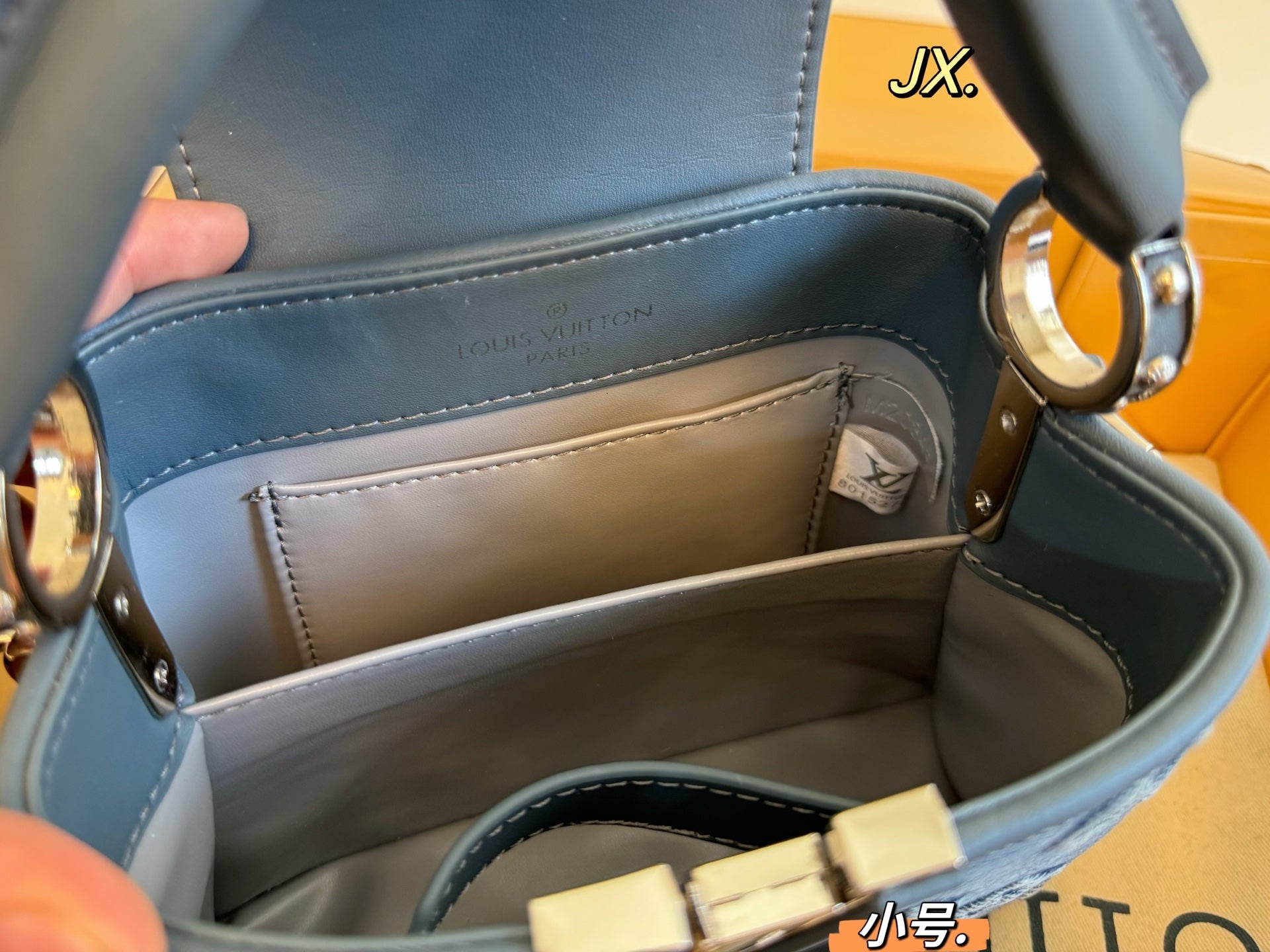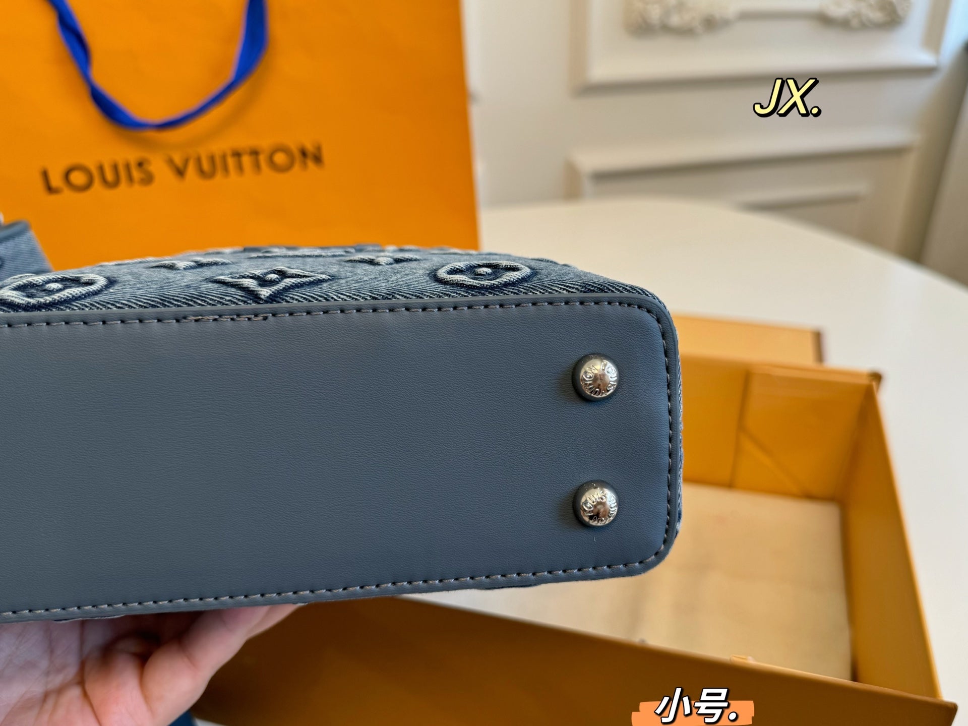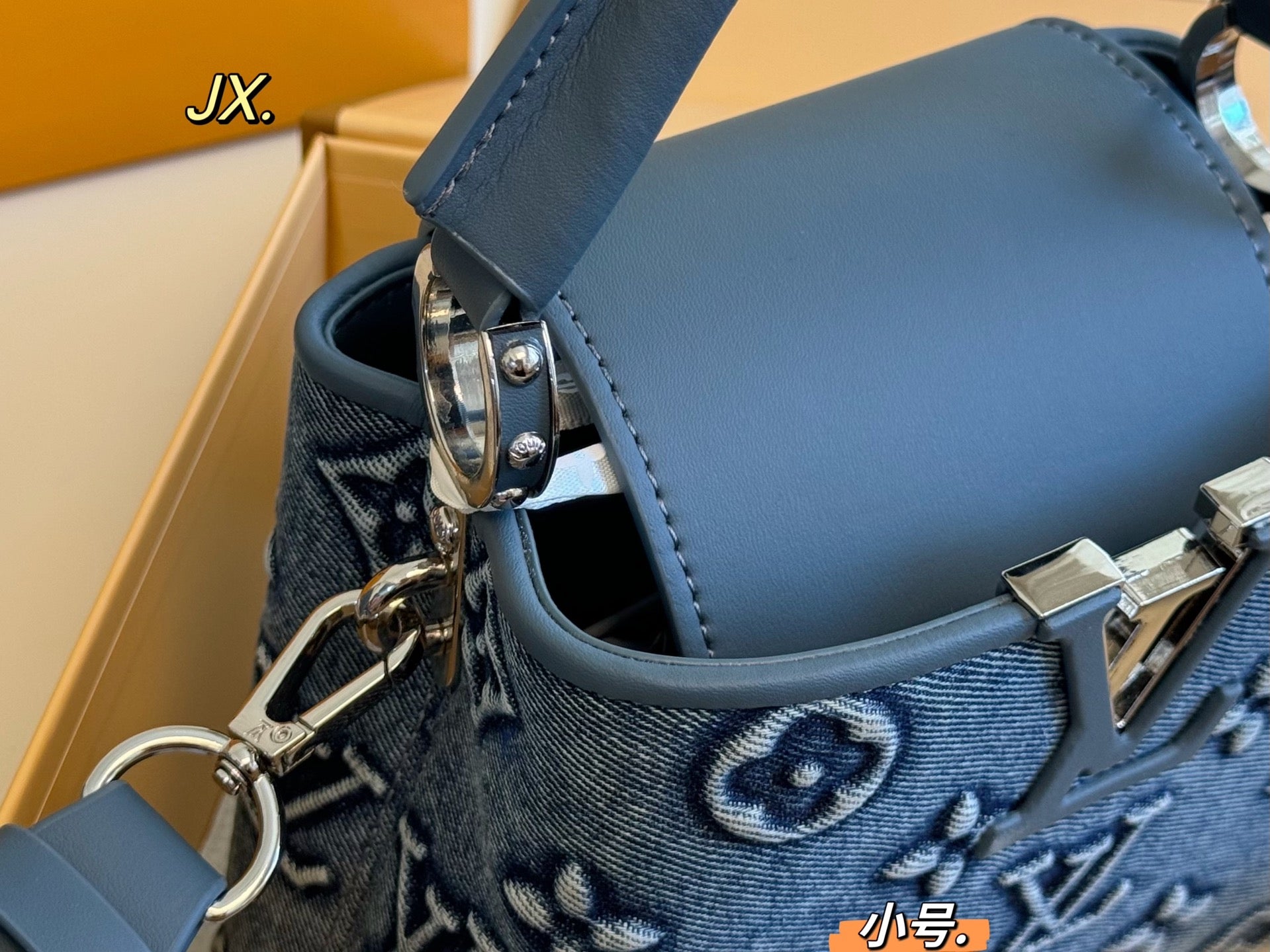 Discover the exquisite Louis Vuitton Denim Capucines Handbag, a perfect blend of luxury and style. Compact yet spacious, this handbag measures 20×14 cm, making it ideal for both everyday use and special occasions. Crafted with high-quality denim, it exudes sophistication and fashion-forward appeal. Elevate your collection with this elegant accessory that embodies refined luxury. Perfect for those who appreciate craftsmanship and timeless design.