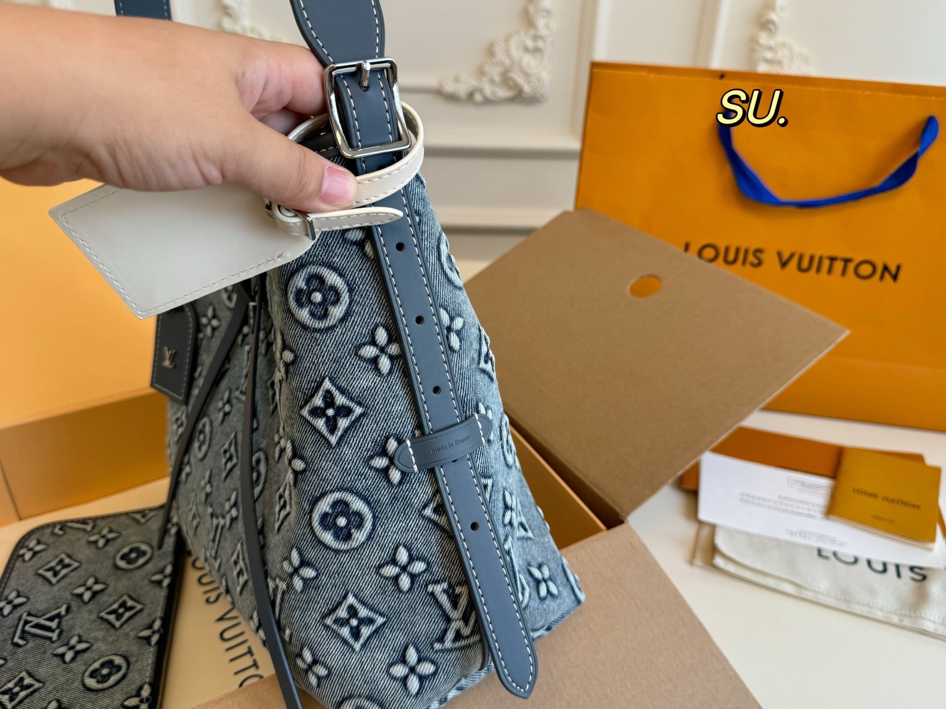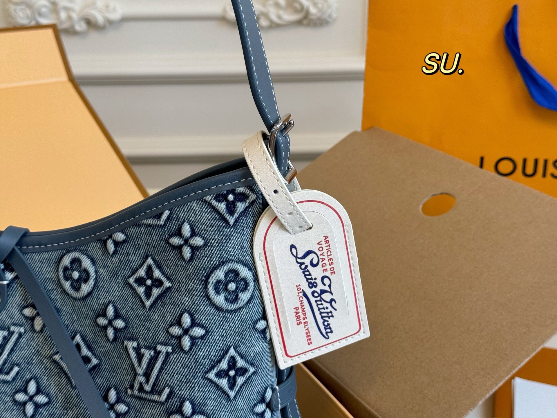 Discover the elegance and practicality of the Louis Vuitton Denim Carryall Shopping Bag with Bow. Measuring 29x20 cm, this versatile armpit bag is designed for everyday use, making it the perfect companion for both shopping and commuting. Its chic bow detail adds a touch of sophistication, while the magnetic buckle closure ensures your belongings are secure yet easily accessible. Ideal for pairing with a small handbag, this stylish piece exudes modern elegance and functionality. Elevate your accessory collection with this statement bag, perfect for busy lifestyles.